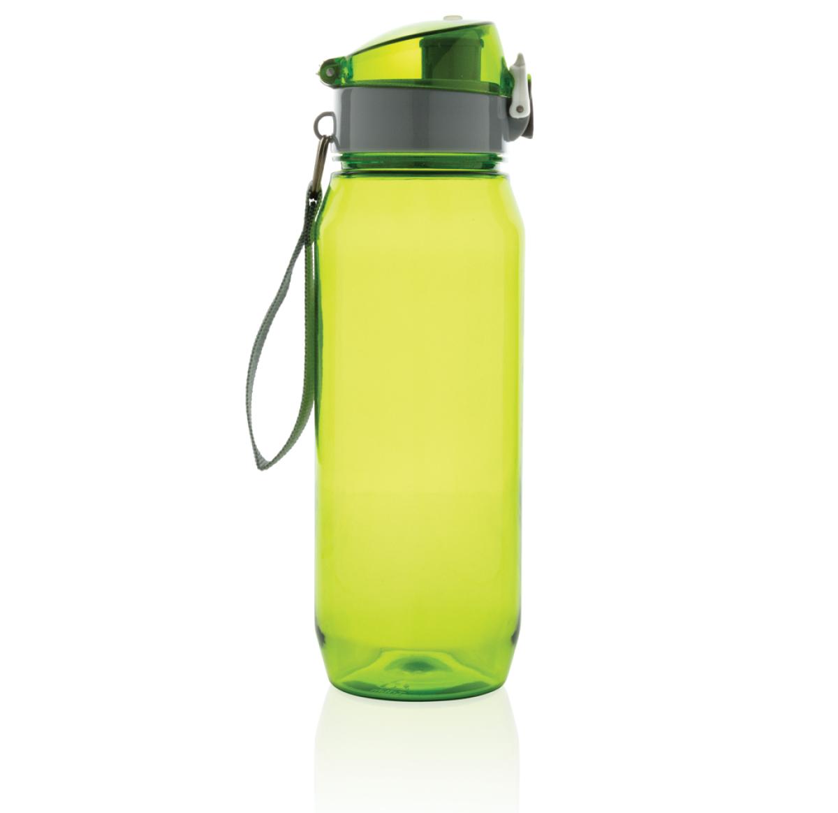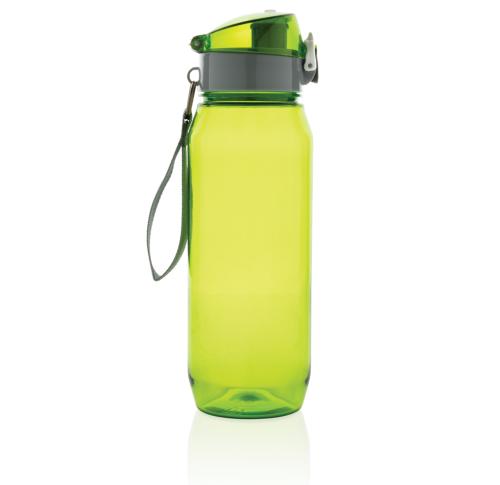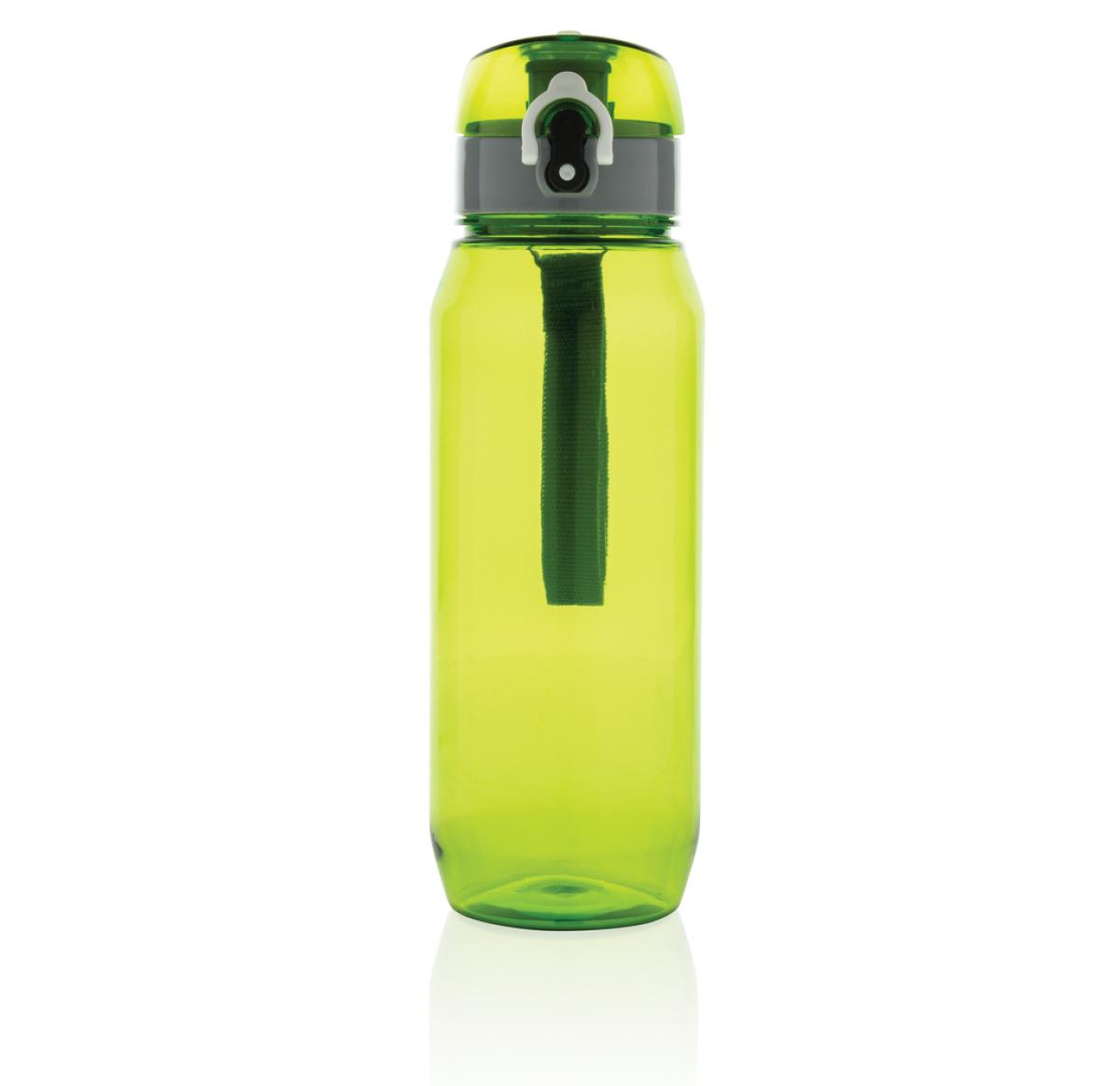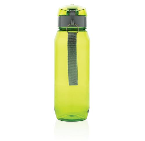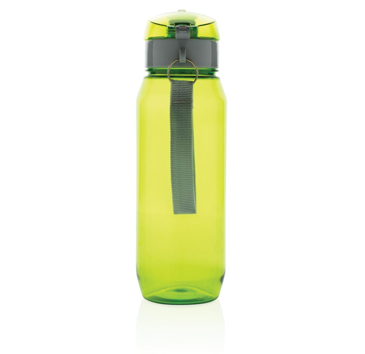 Leak proof tritan bottle with lockable cap and single hand 'press open' function. Including carrying strap. Odourless and 100% BPA-free. Content: 800ml.