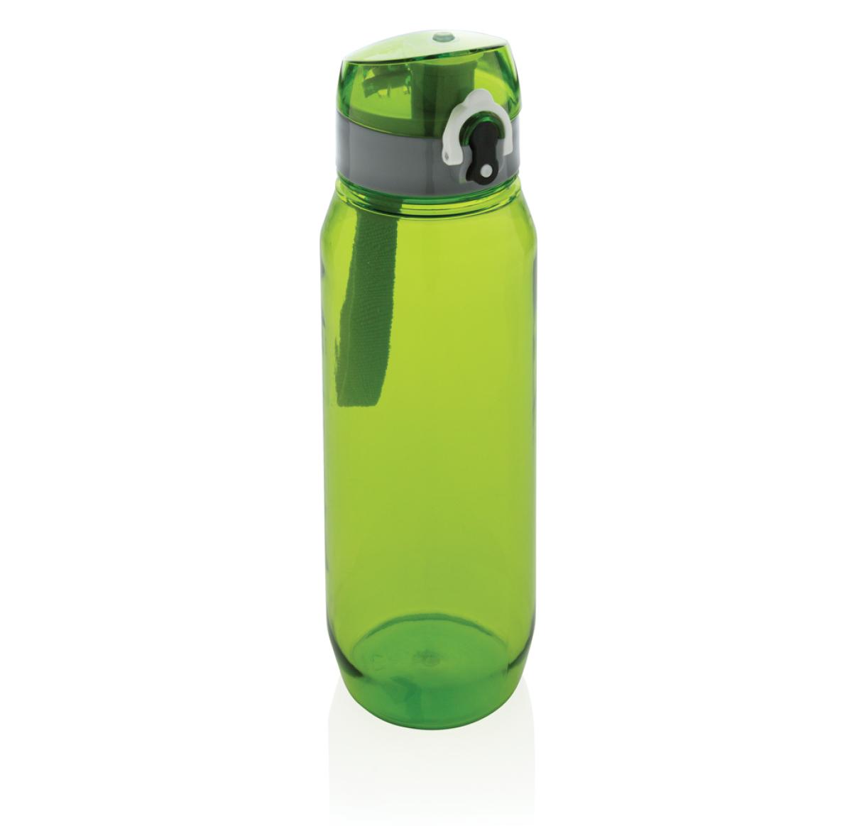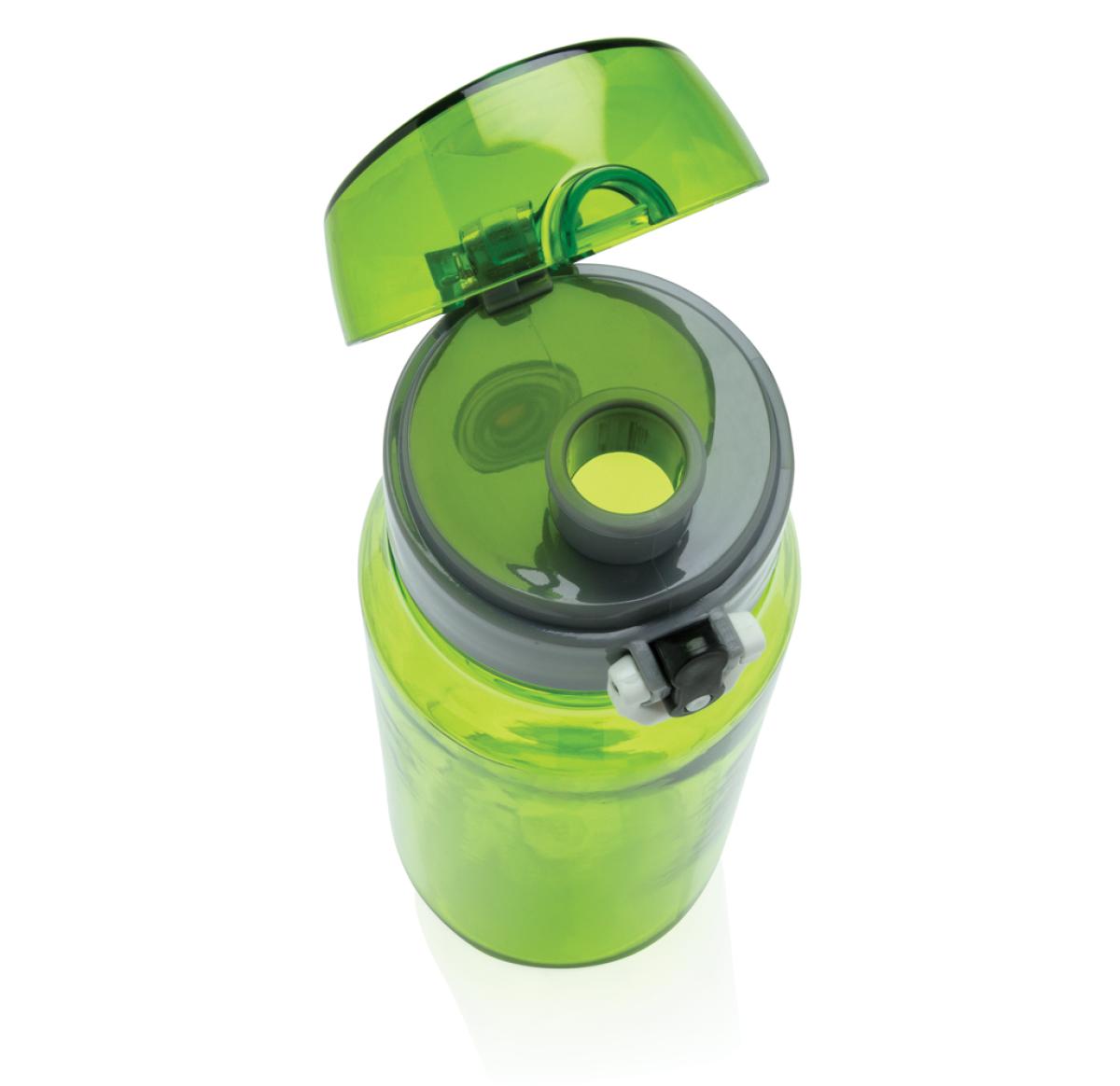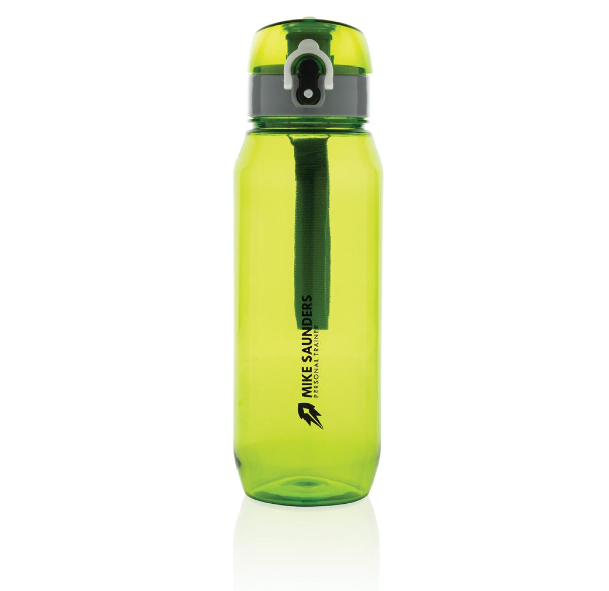 Leak proof tritan bottle with lockable cap and single hand 'press open' function. Including carrying strap. Odourless and 100% BPA-free. Content: 800ml.