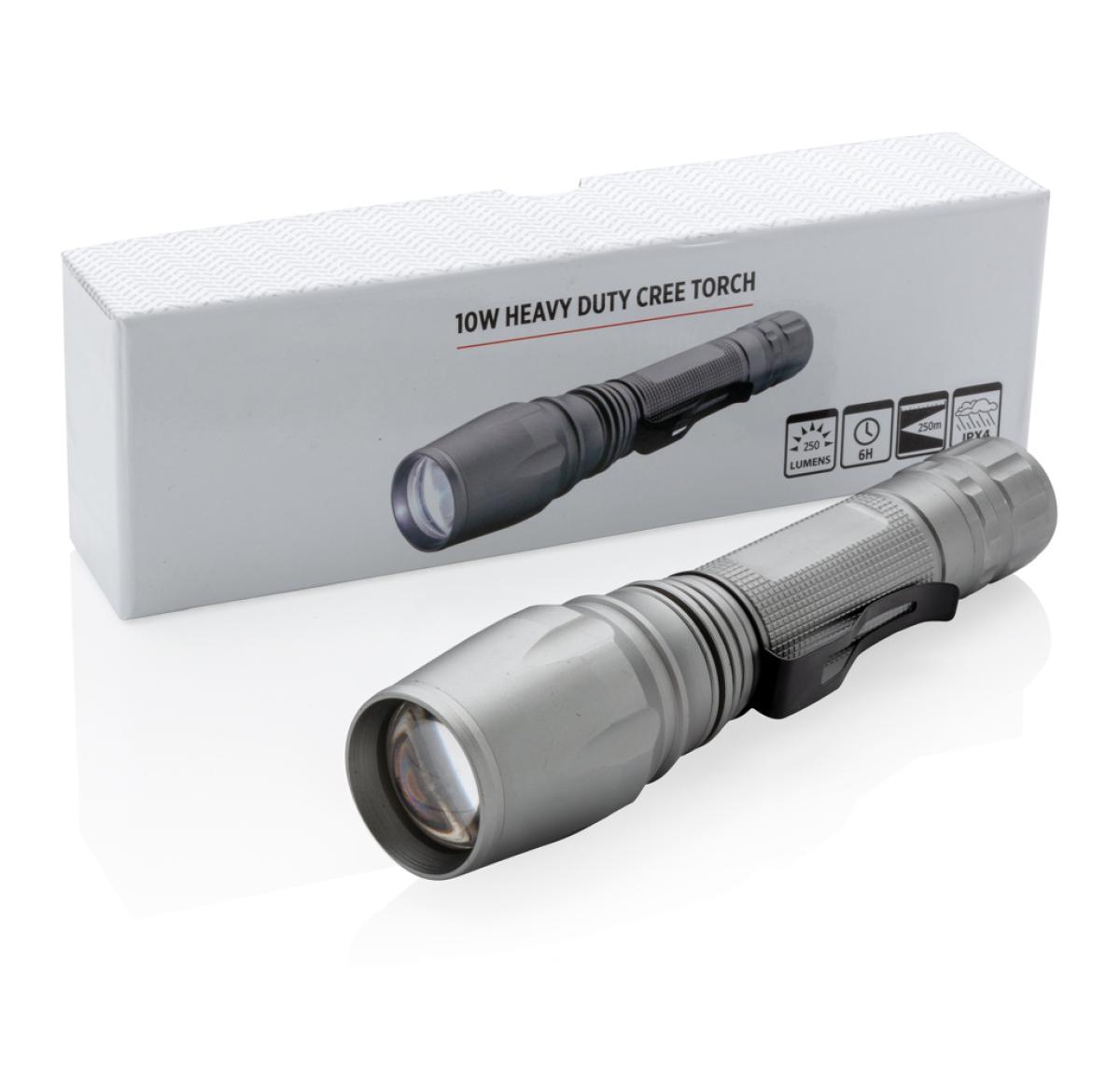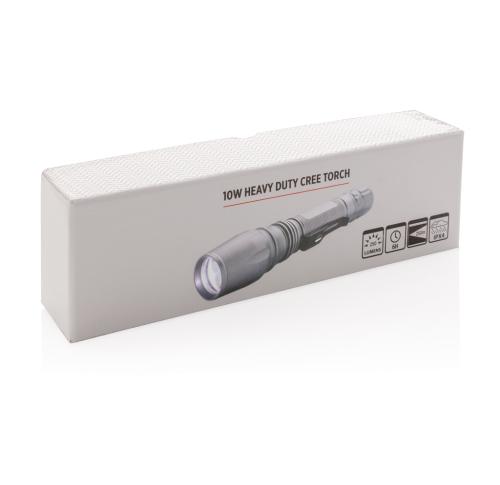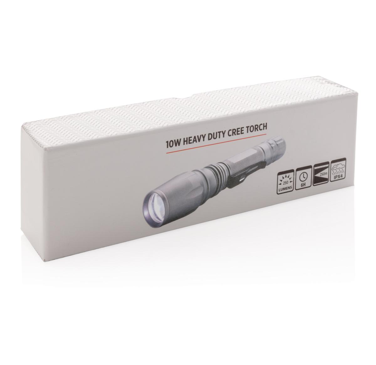 Super bright and tough 10W CREE led torch that can handle even the most difficult conditions. The durable aluminium torch is IPX 4 waterproof and shockproof up to 1 metre drop. The beam of the torch can be adjusted to focus or to light up a bigger area. W