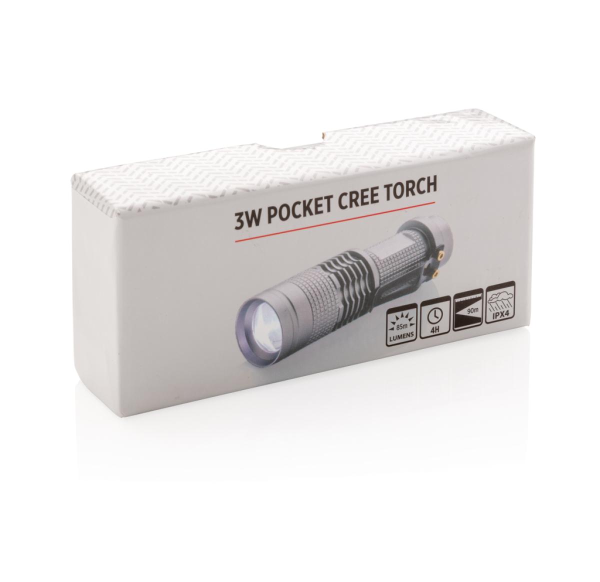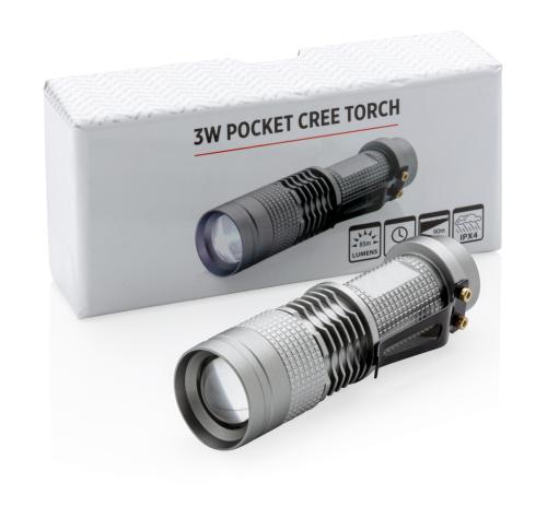 Compact but super bright 3W CREE torch that can easily be taken wherever you go because of its compact size. Includes batteries for direct use. 85 lumen and working time of about 4 hours. Made out of durable aluminium.