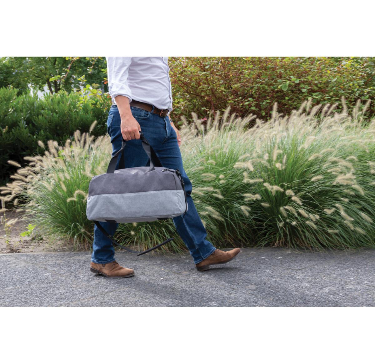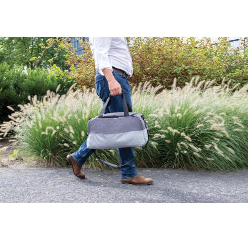 Perfect as a carry-on bag or pack for an overnight trip. This weekend bag is made of reused plastic bottles, so not only stylish in a two-tone grey but also sustainable. The bag features a U-shaped top opening for all your gear, one large front pocket fo