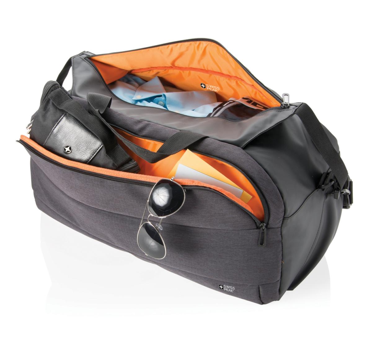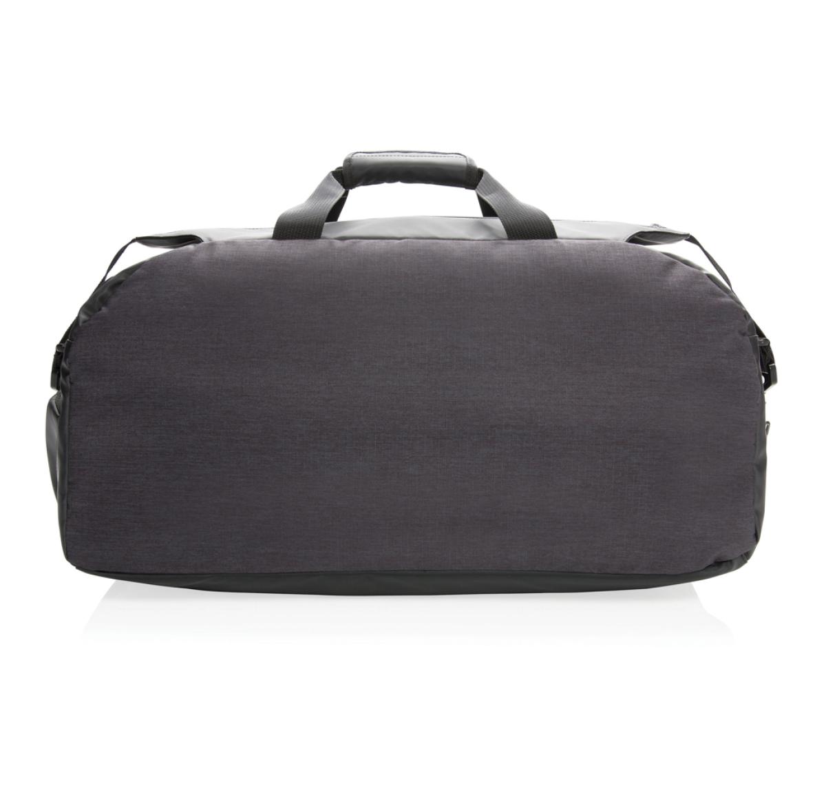 Unique designed weekend bag with one large main compartment and one front compartment. Connect your powerbank easily to the integrated USB charging port and charge your phone or tablet on the go. With phone or water bottle pocket on side. With convenient