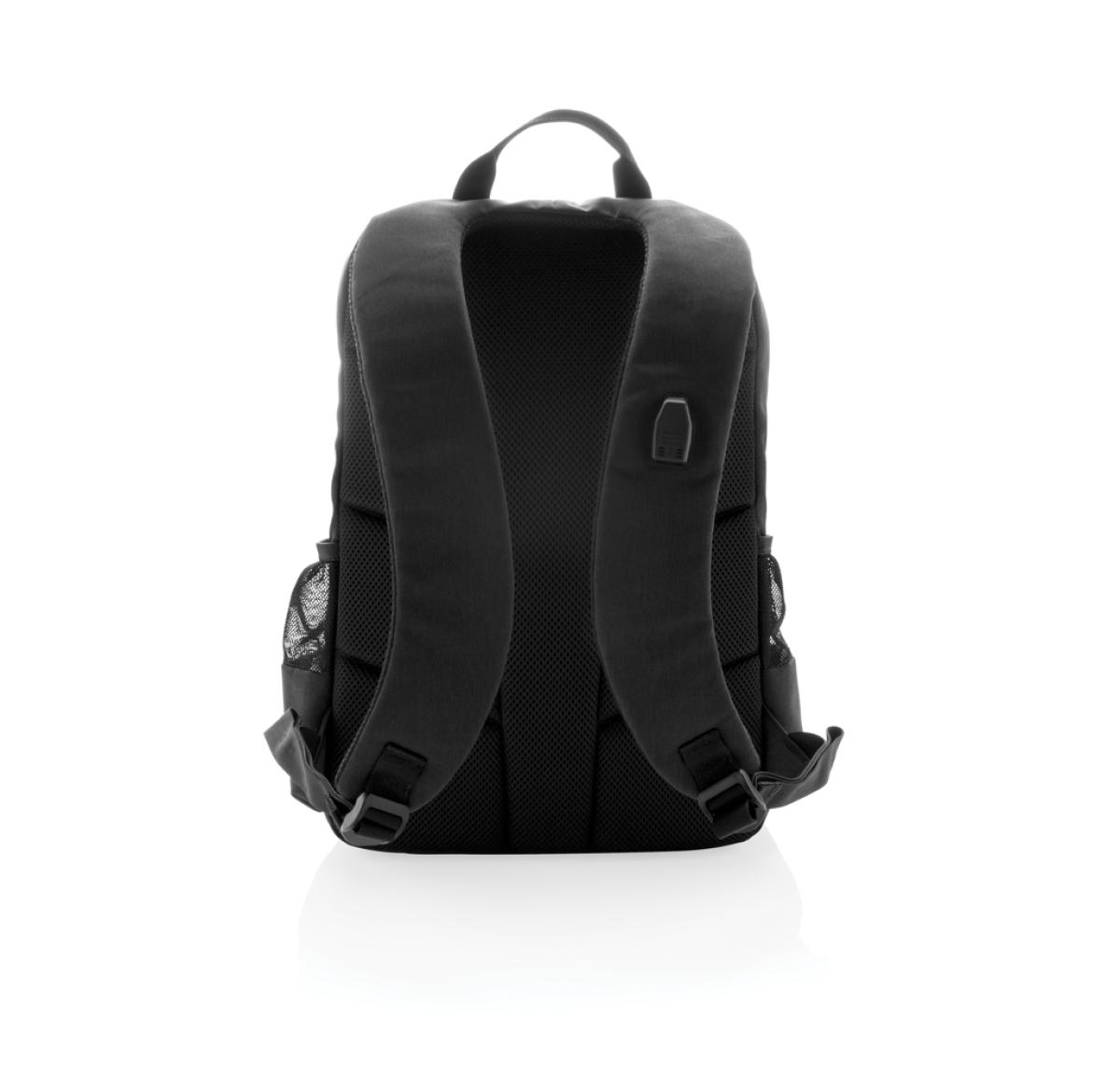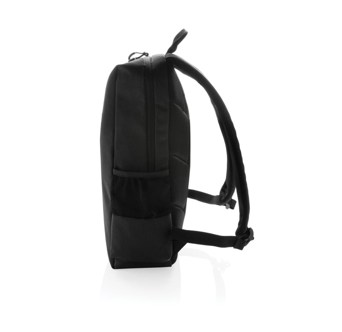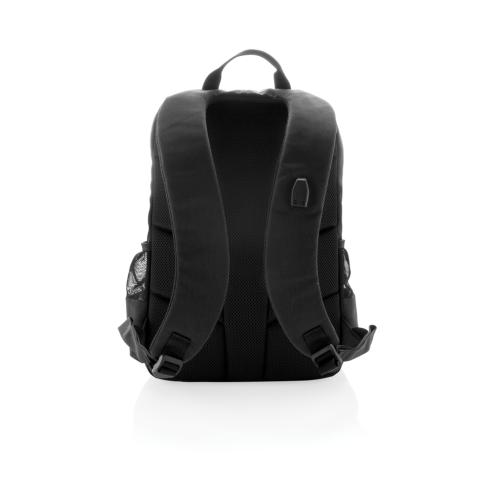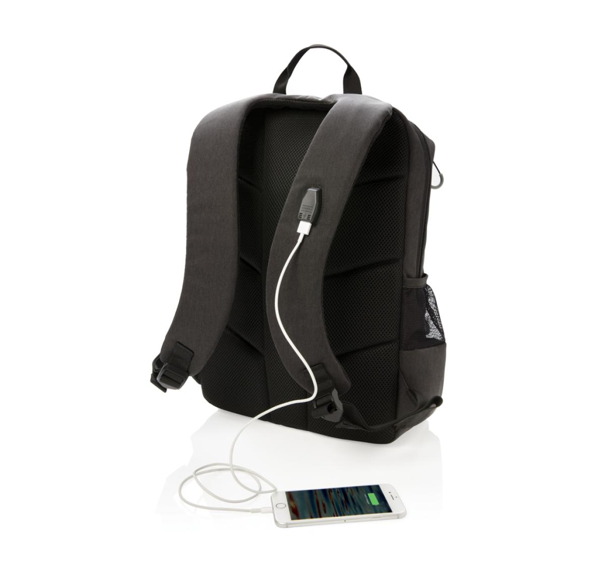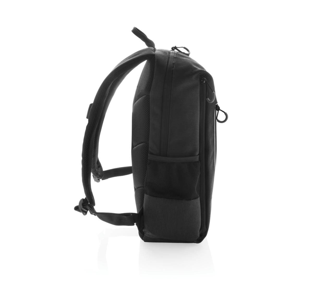Simple, practical and durable everyday backpack with 2 side pockets for water bottles or your umbrella. Convenient USB output on the strap. Padded 15.6" compartment for laptop computer as well as several spacious compartments and RFID protected sleeve poc
