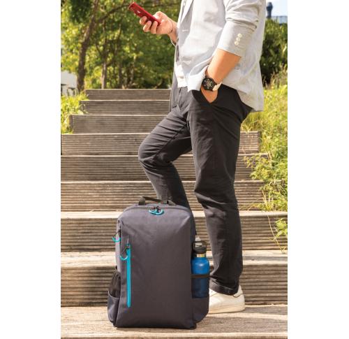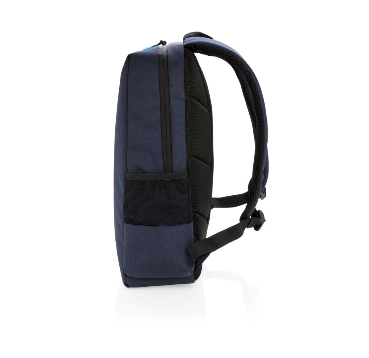 Simple, practical and durable everyday backpack with 2 side pockets for water bottles or your umbrella. Convenient USB output on the strap. Padded 15.6" compartment for laptop computer as well as several spacious compartments and RFID protected sleeve poc