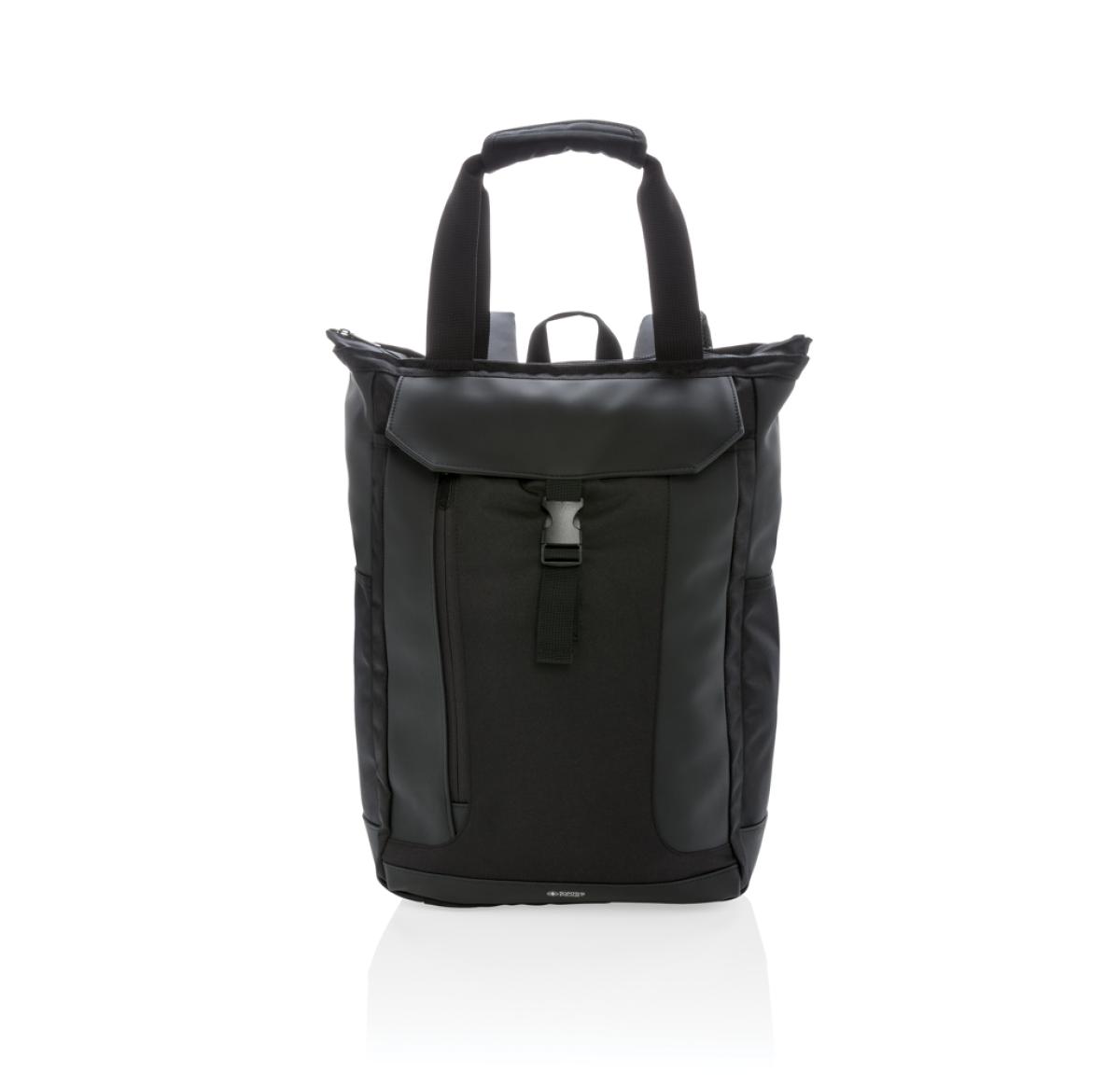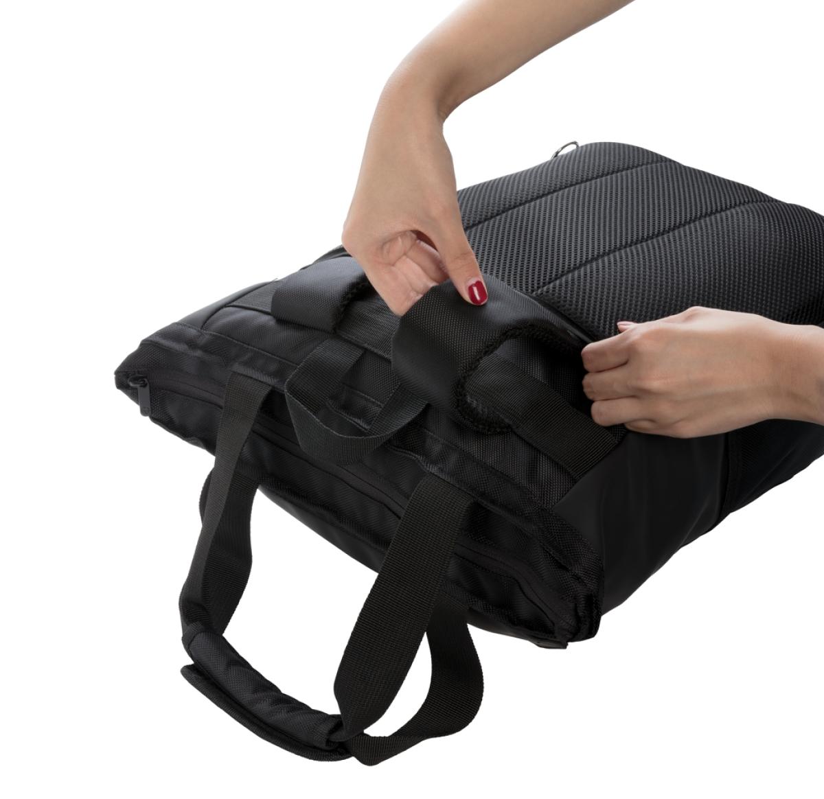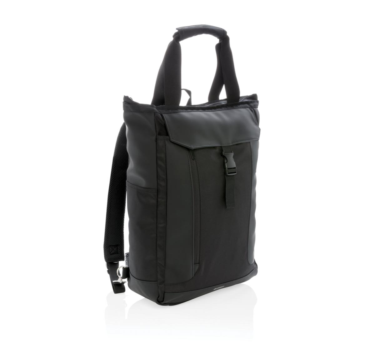 This versatile bag can be carried on the shoulder, by hand or as a backpack. Including padded 15" laptop compartment and RFID protected sleeves. PVC free.