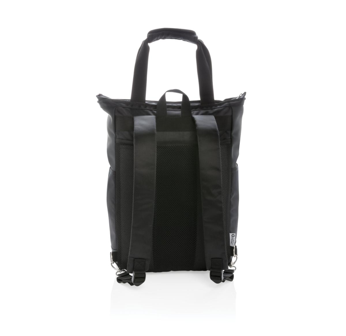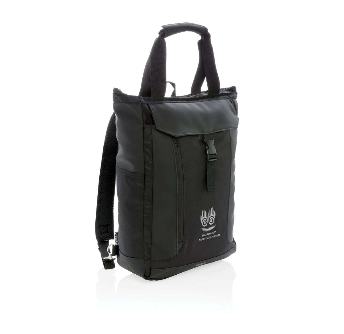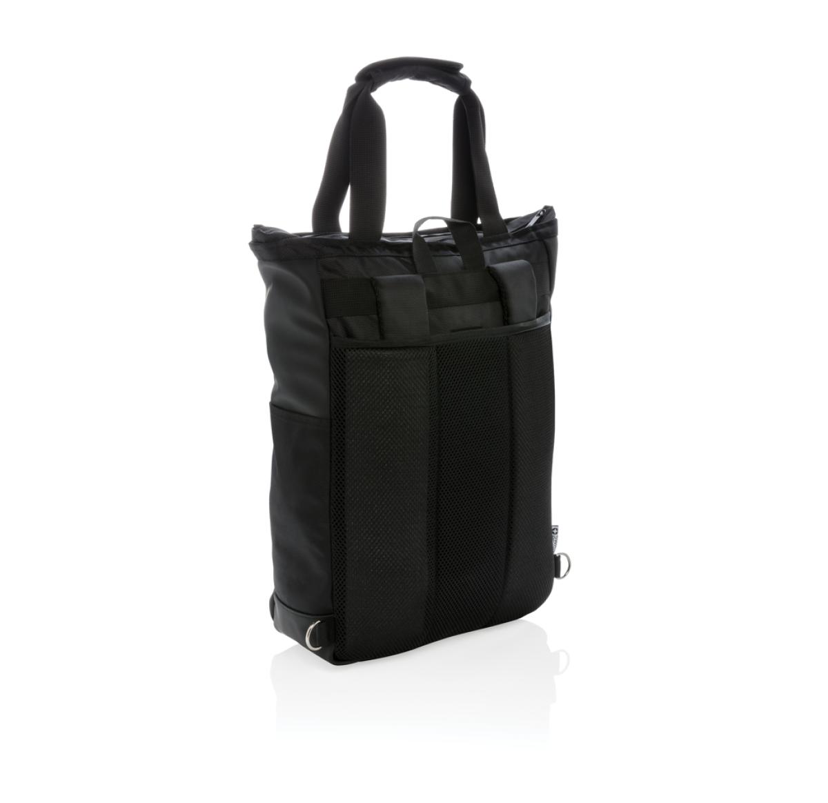 This versatile bag can be carried on the shoulder, by hand or as a backpack. Including padded 15" laptop compartment and RFID protected sleeves. PVC free.