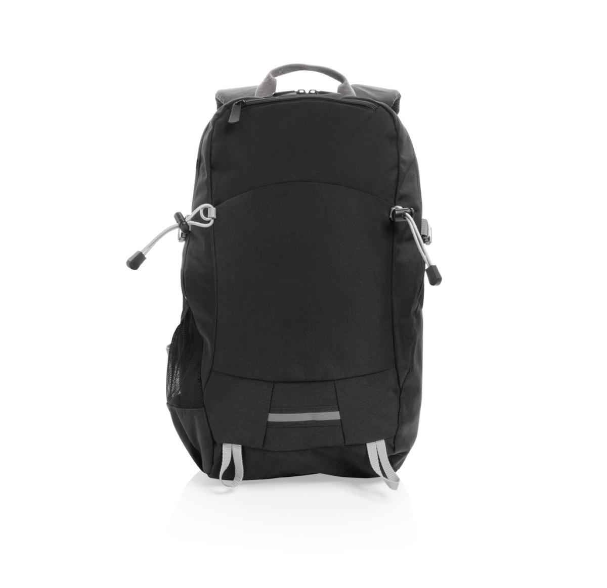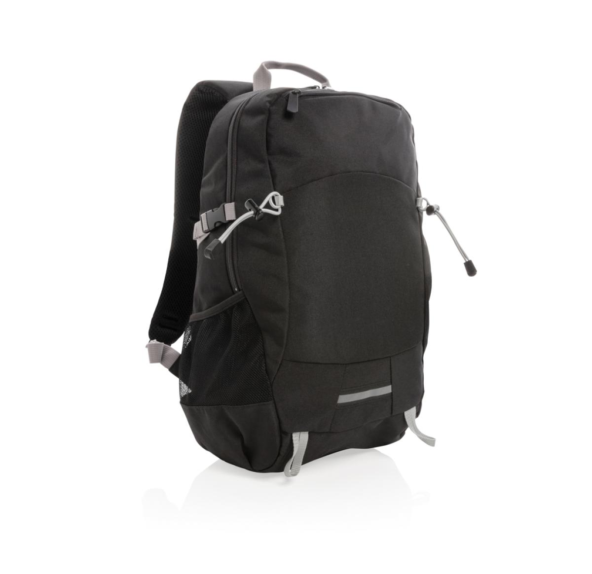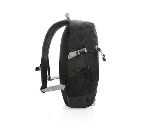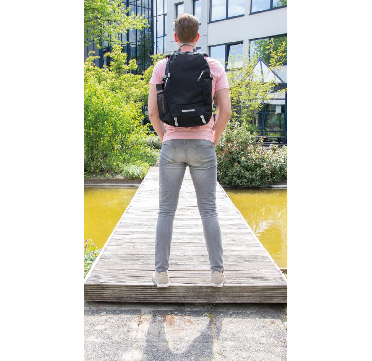 This large, versatile two-tone polyester backpack has a spacious main compartment for all your accessories. It is a fantastic pack for work, school or running errands. It will do a good job of protecting your laptop up to 15.6". Comes with reflective fron