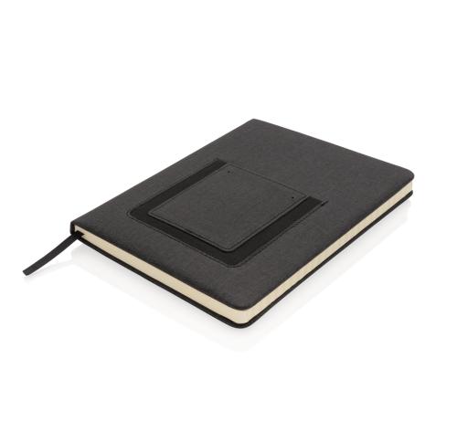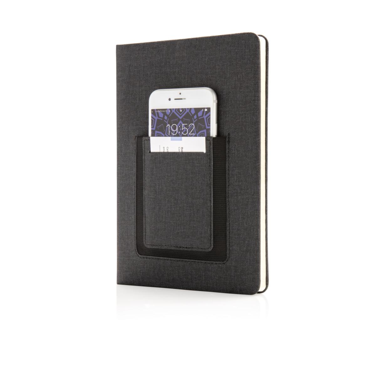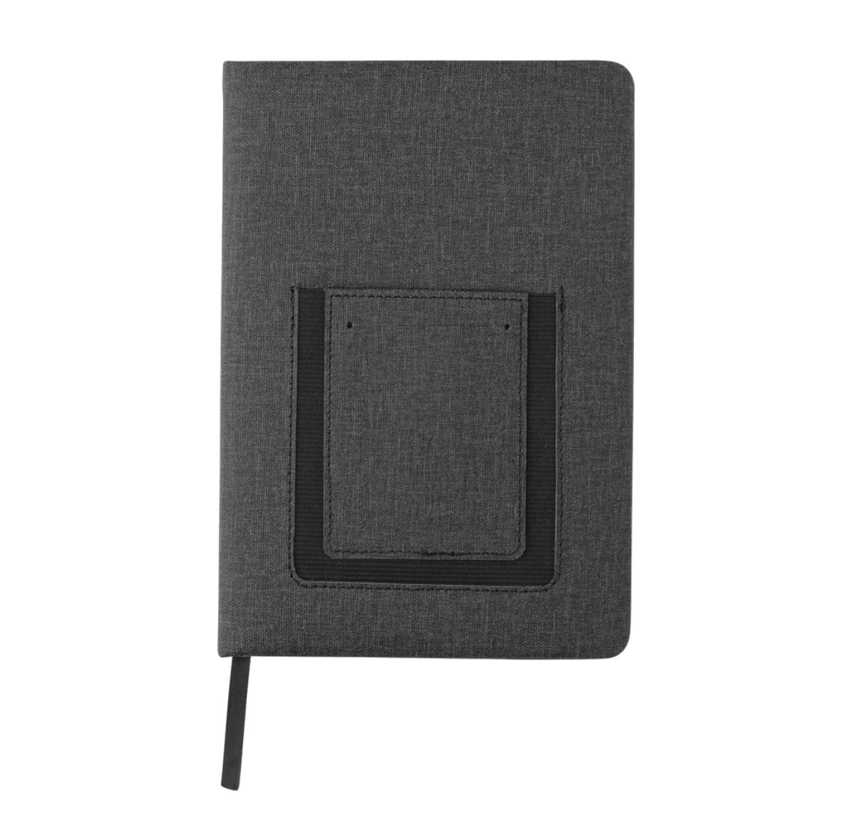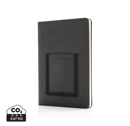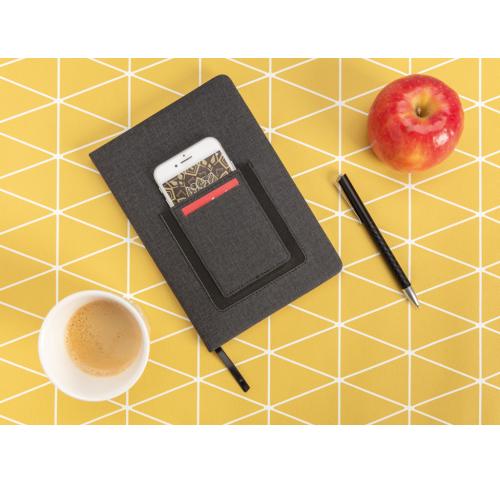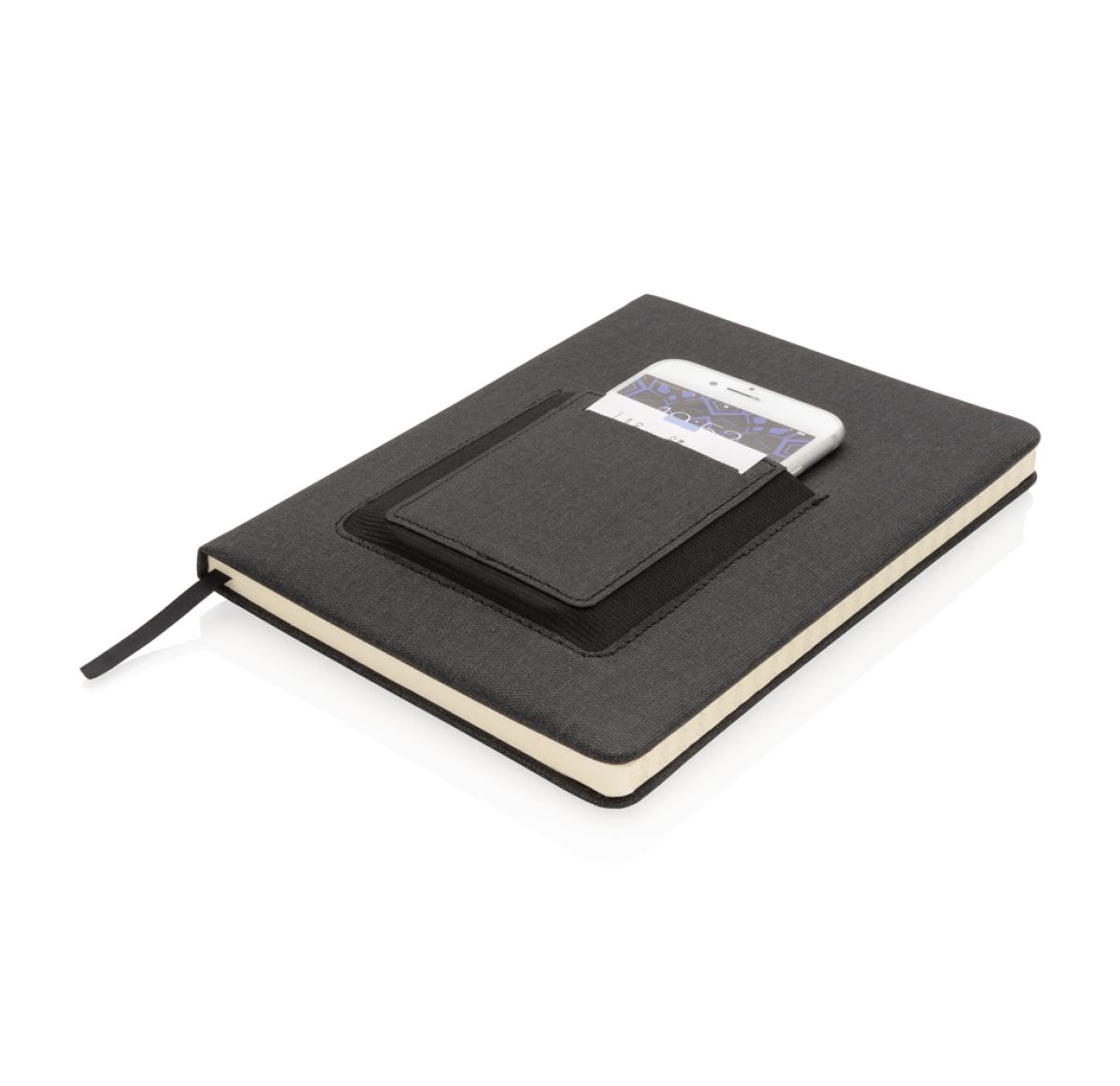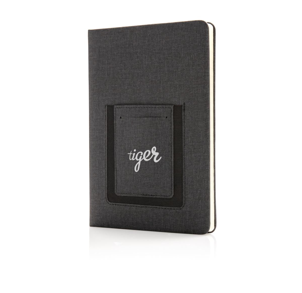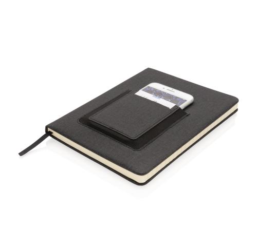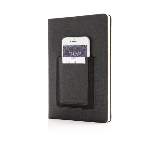 Deluxe A5 Notebook with phone pocket and card sleeve. With 80 sheets/160 cream coloured pages of 78g/m2 paper inside. including page divider.
