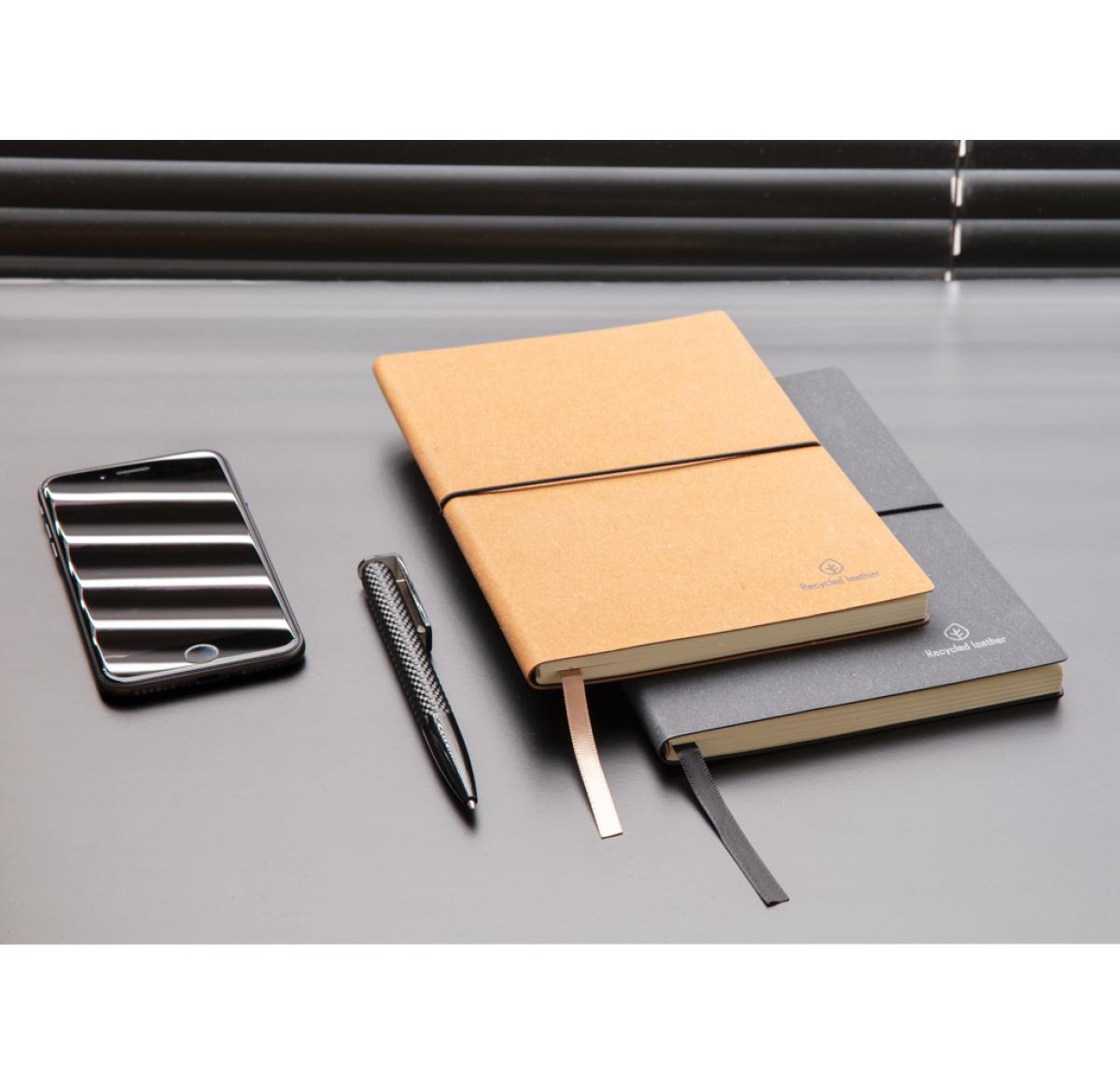 Be environmentally conscious without sacrificing on style with this great looking notebook made with recycled bonded leather. The cover has a pleasant texture and an earthy natural look. 80 sheets/160 lined cream coloured 75 grams pages recycled paper mak
