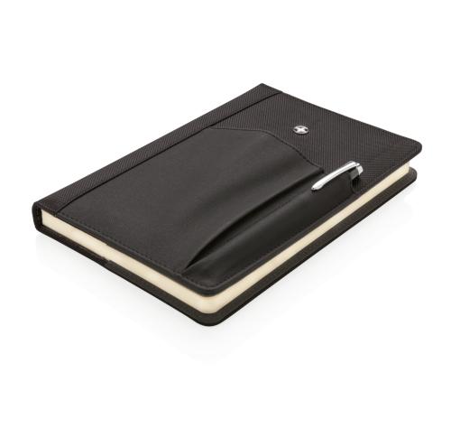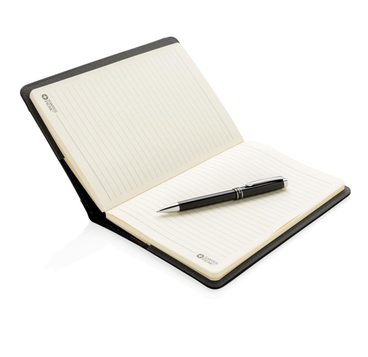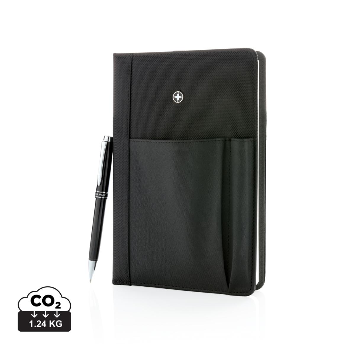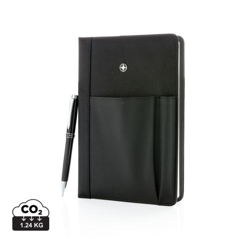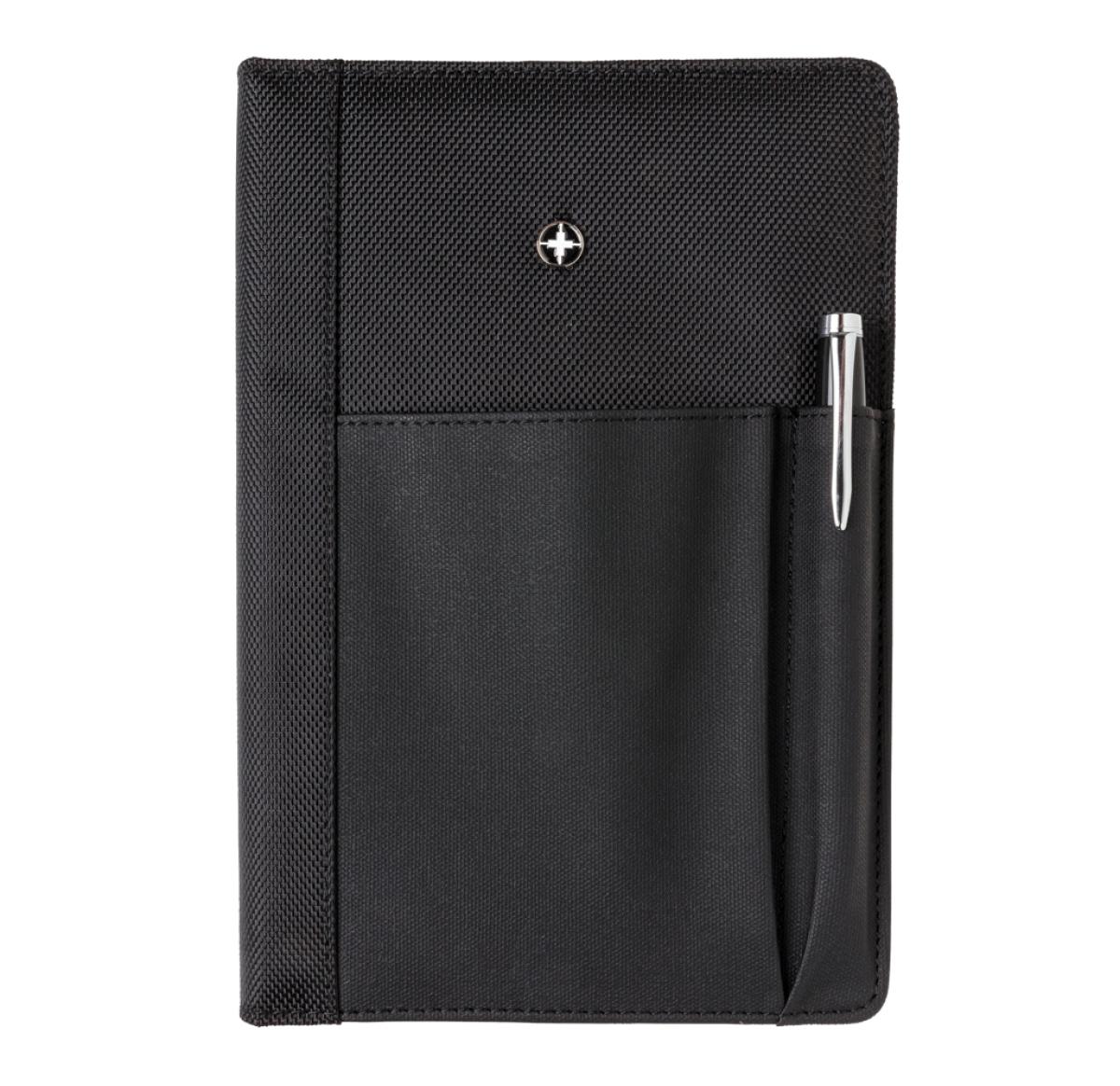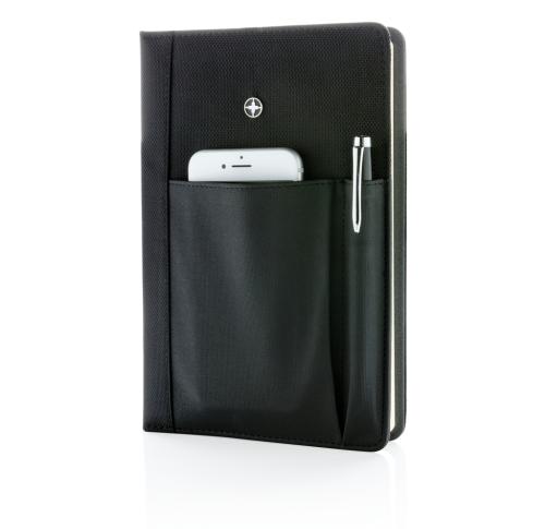 Executive 1680D and 600D polyester notebook cover with pen. Including removable notebook with 192 pages of 80g/m2 paper inside. Pocket on the cover can hold pen, cards, cash, mobile phone etc. Packed in Swiss Peak giftbox.