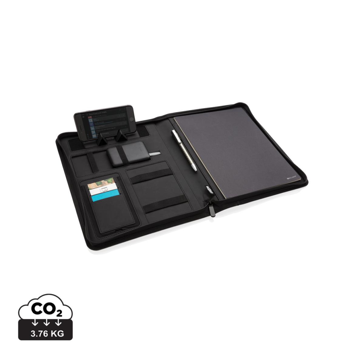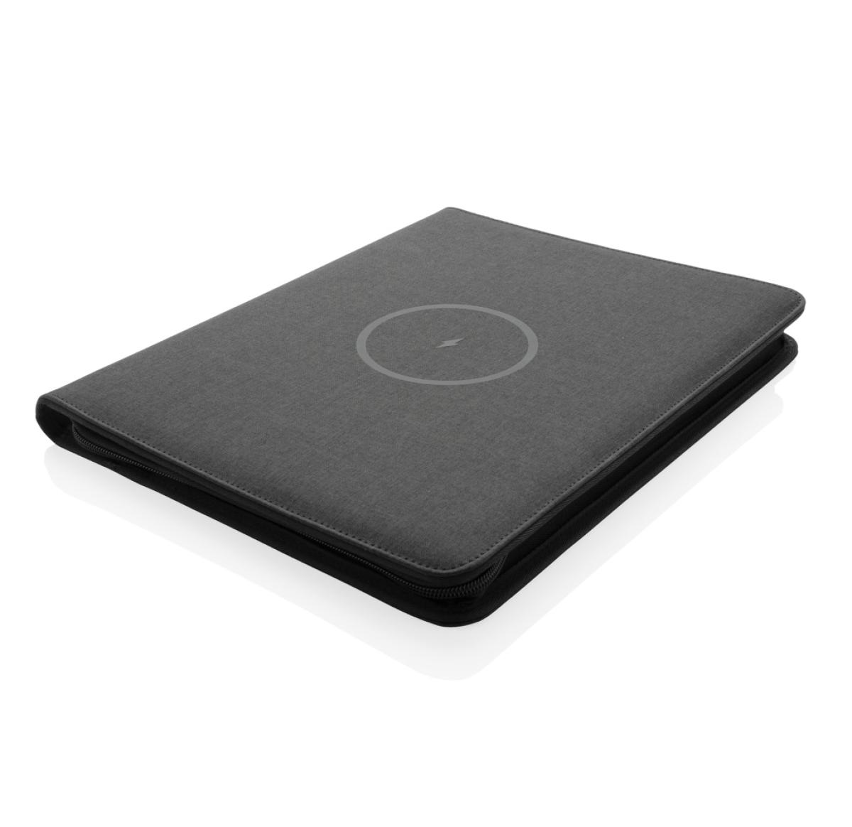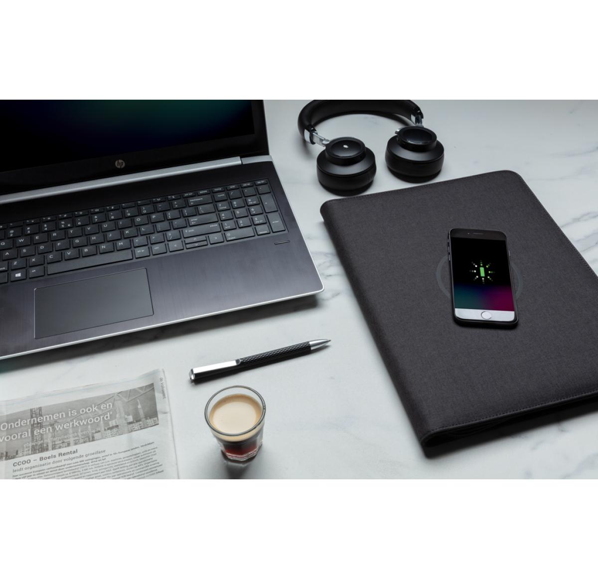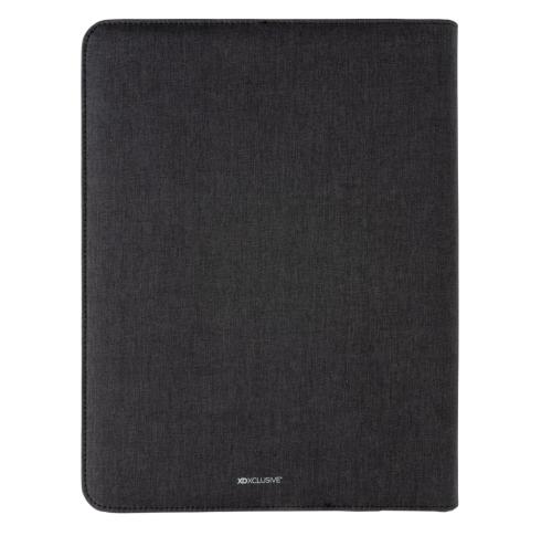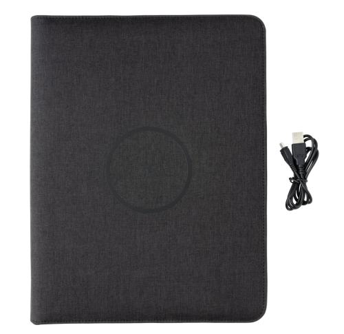 This A4 portfolio with cream coloured 20 sheets 70 grams lined notepad boasts the latest technology. The front cover has a wireless charging pad for your phone. (Android latest generations, iPhone 8 and up). Older phones and tablets can be charged via the