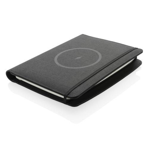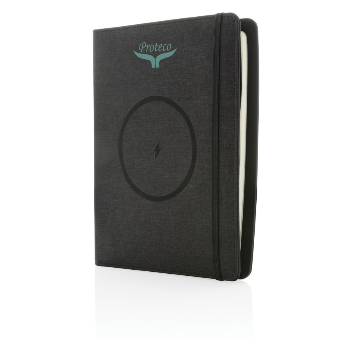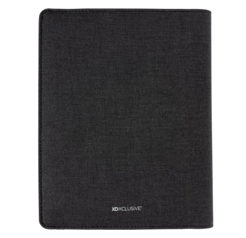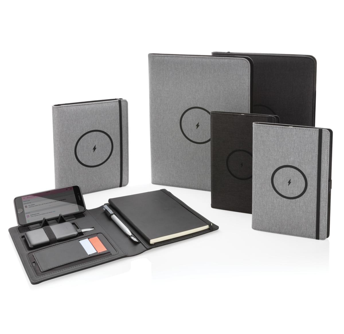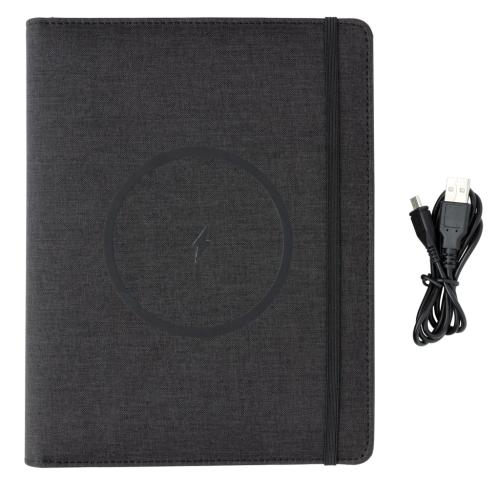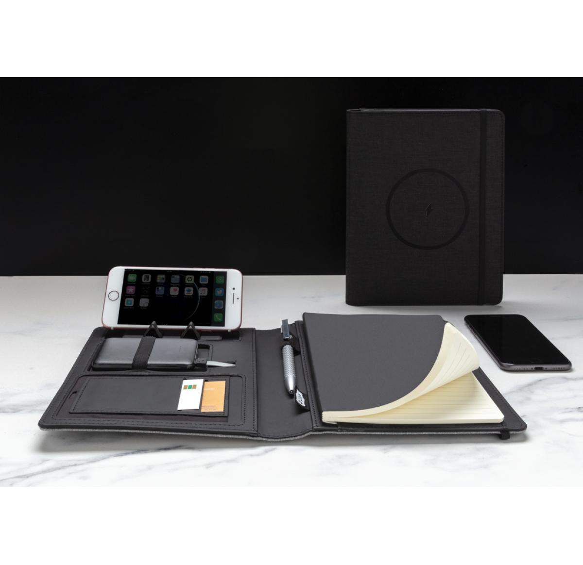 This notebook cover allows you to have your meetings in style. The front cover has a wireless charging pad for your smartphone. (Android latest generations, iPhone 8 and up). Older phones and tablets can be charged via the USB ports with the external 5.00