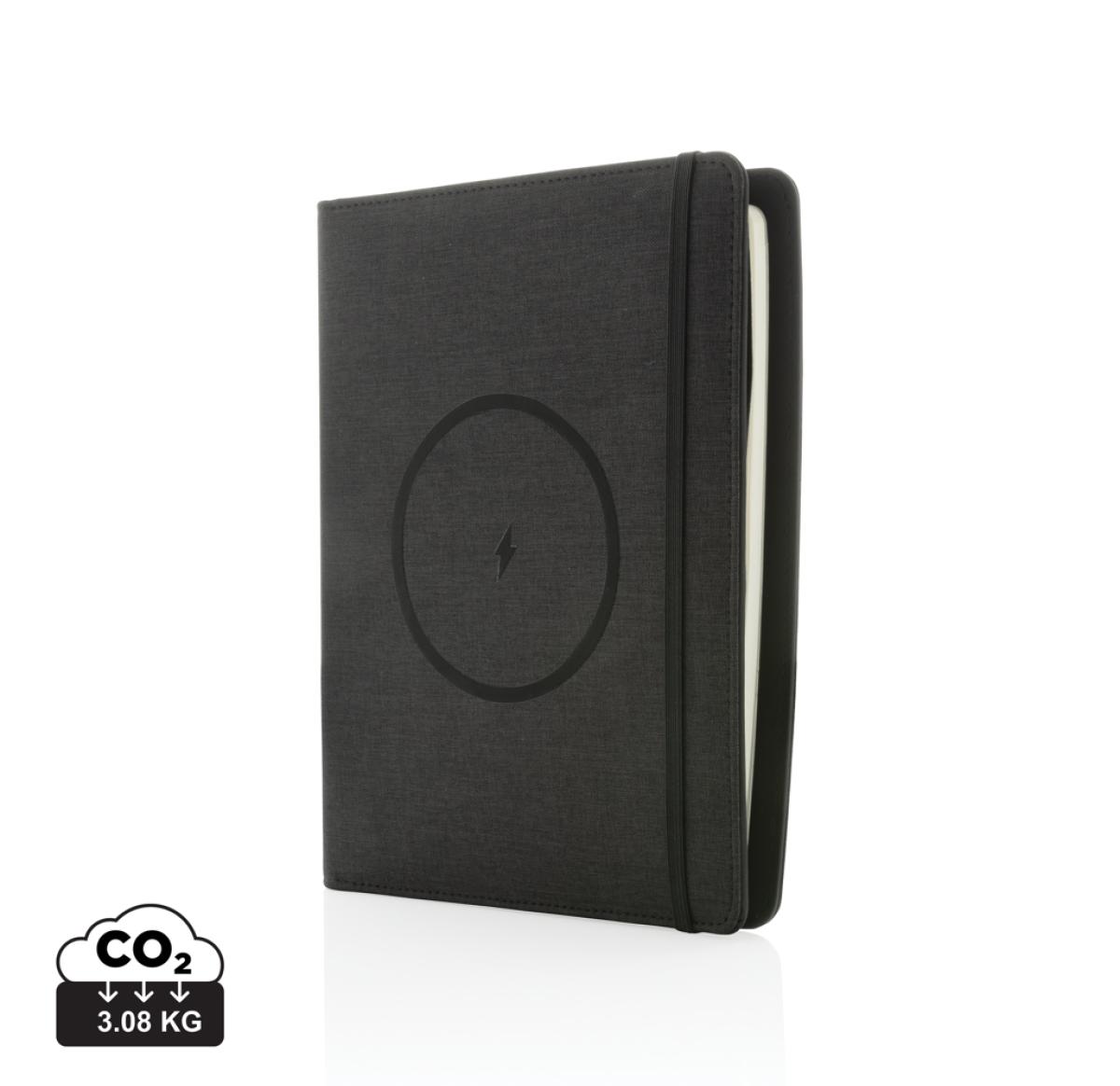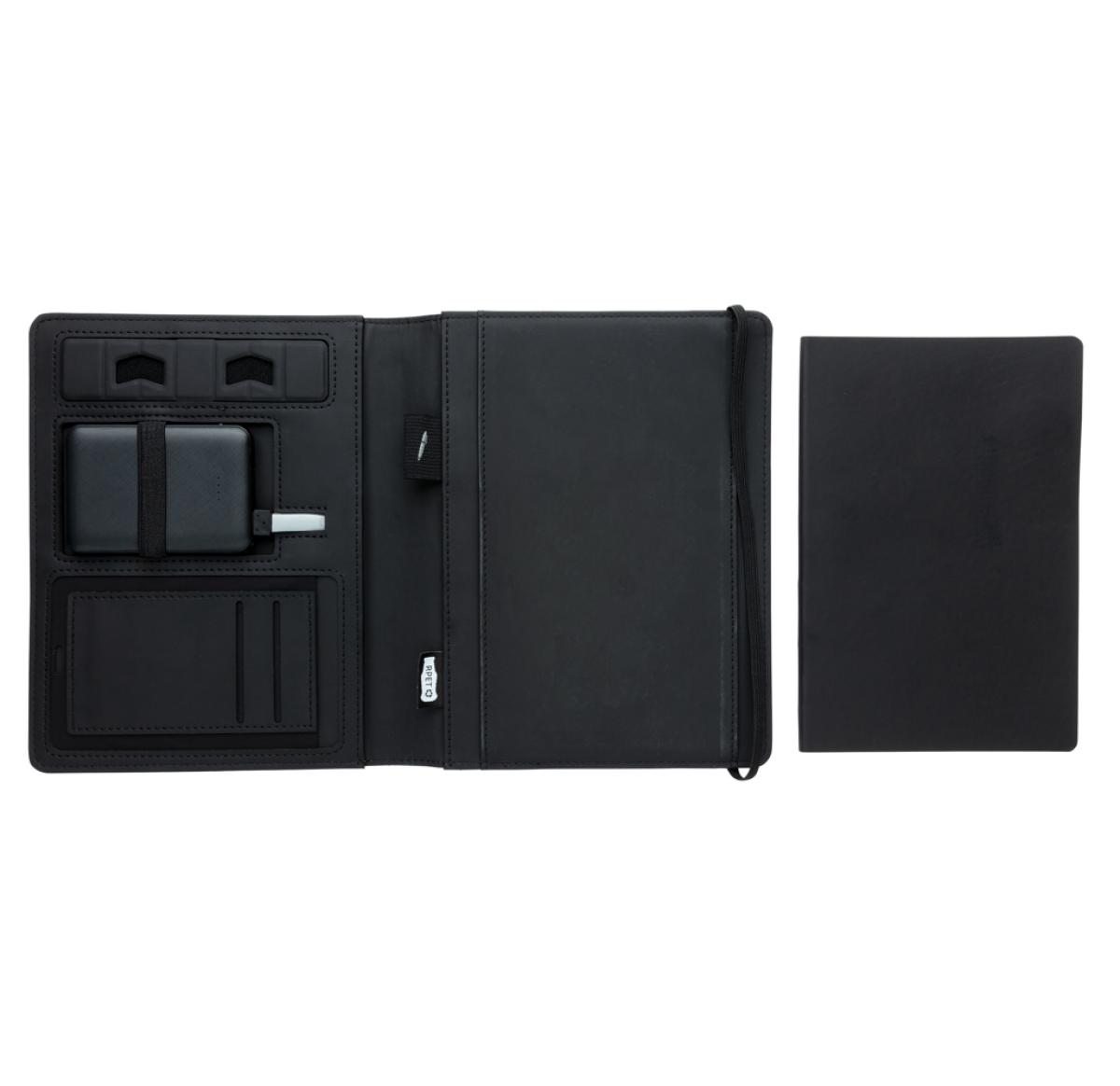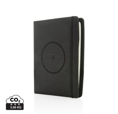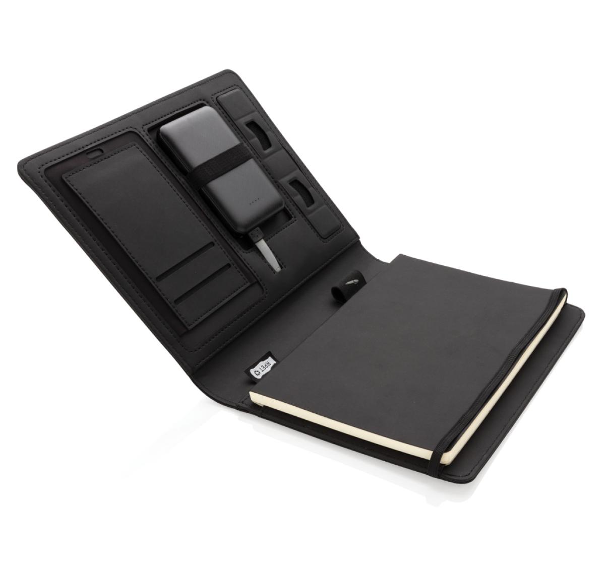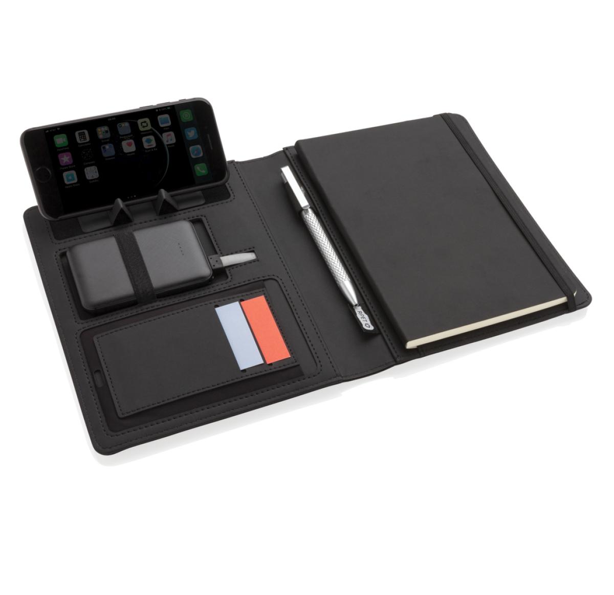 This notebook cover allows you to have your meetings in style. The front cover has a wireless charging pad for your smartphone. (Android latest generations, iPhone 8 and up). Older phones and tablets can be charged via the USB ports with the external 5.00