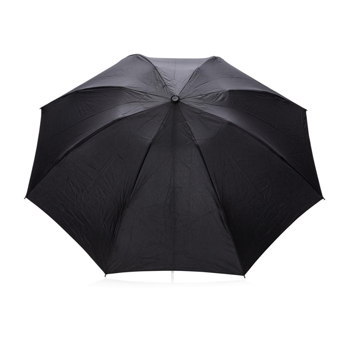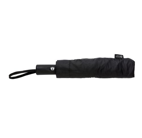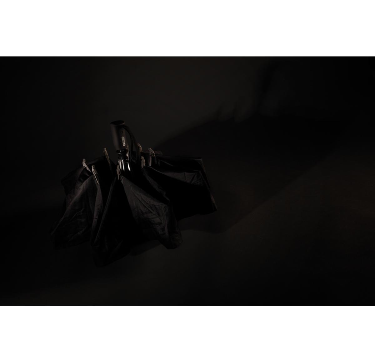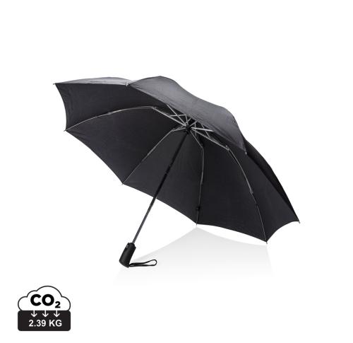 23 inch 3 section auto open/close reversible umbrella in 190T pongee material with chrome plated steel shaft. Fibreglass ribs. Black ABS handle with button. Including pouch. Unique reverse opening keeps water leakage inside.