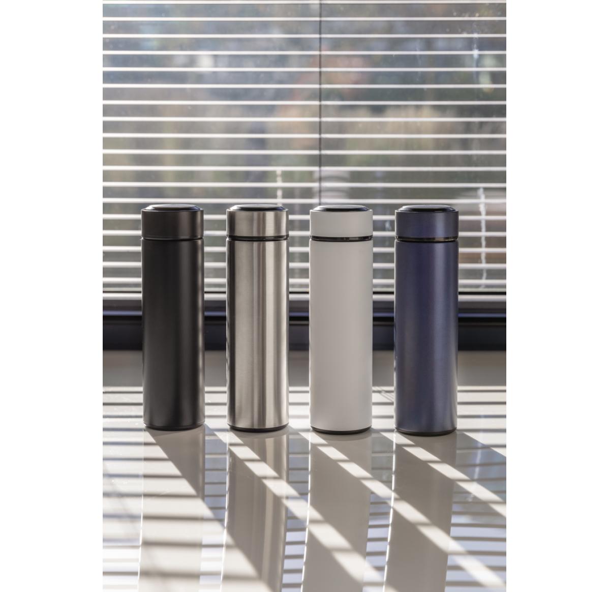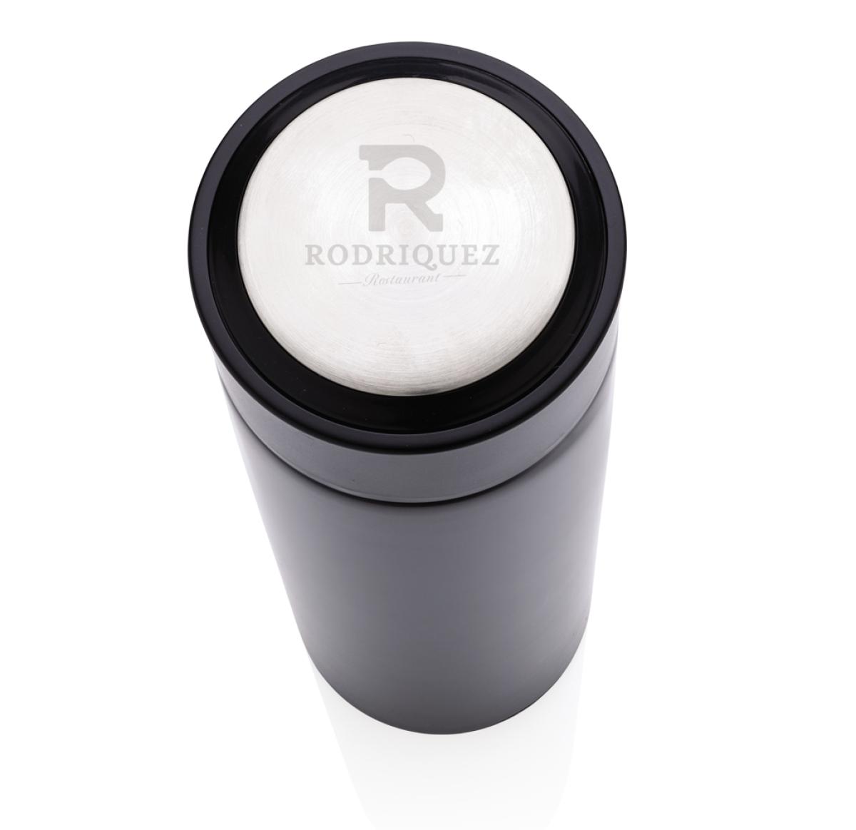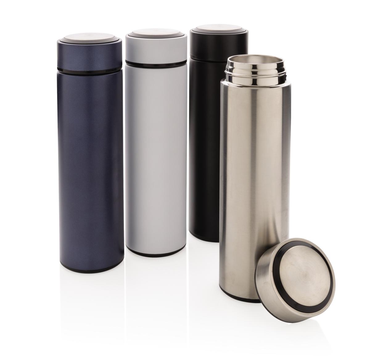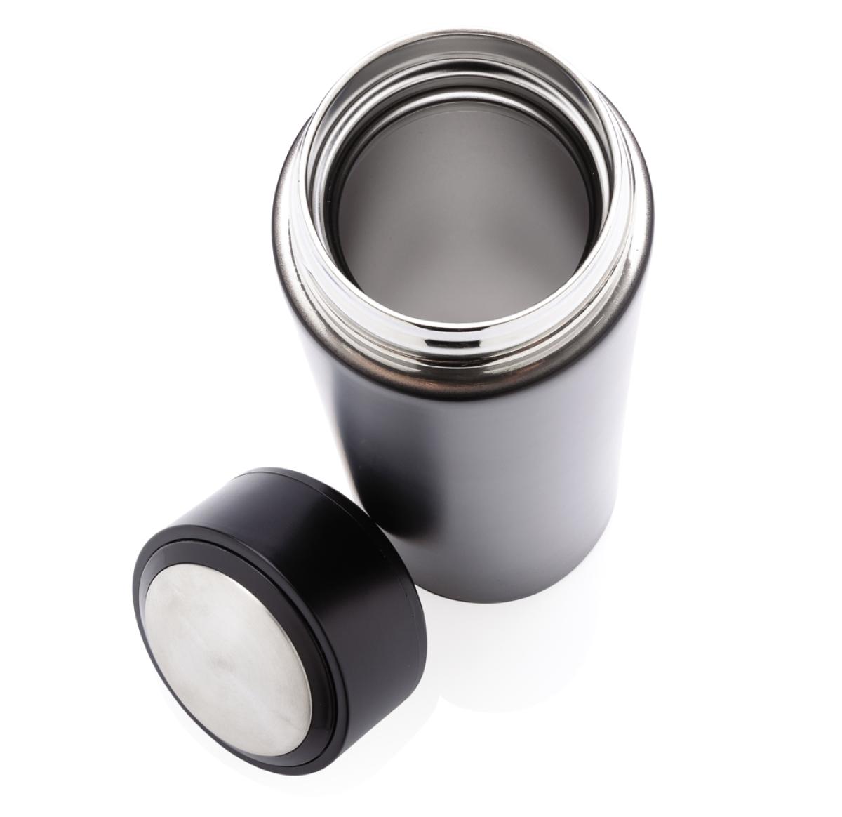 Keep coffee or tea nice and toasty in this vacuum stainless bottle with brushed metal lid. The bottle features a leak-proof screw lid and allows for drinking from any side. The wide mouth opening allows for easy cleaning. Capacity 450ml. BPA free.