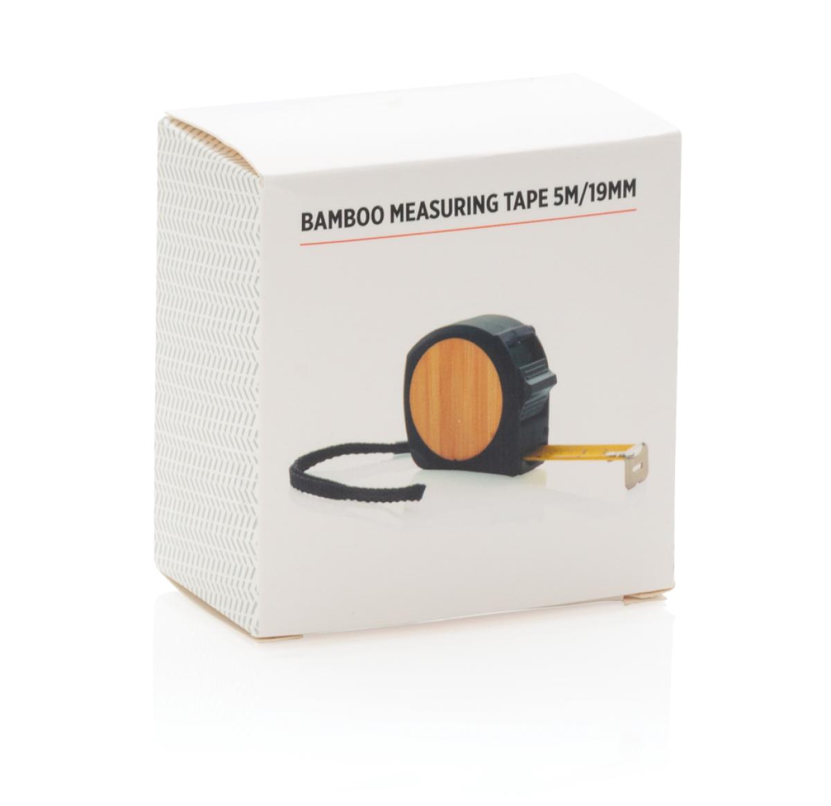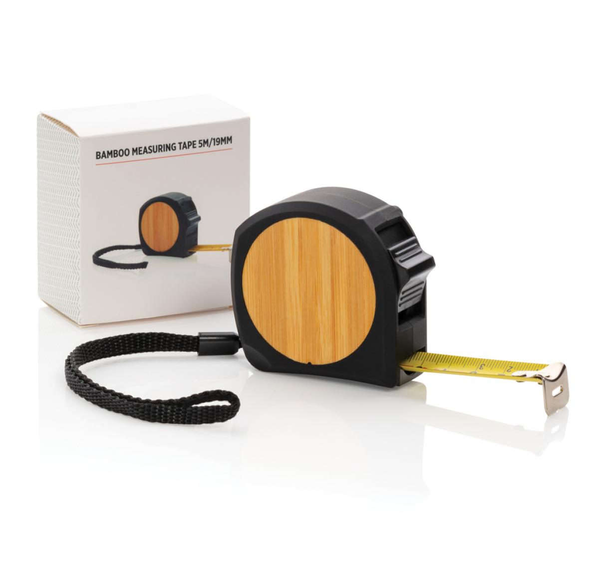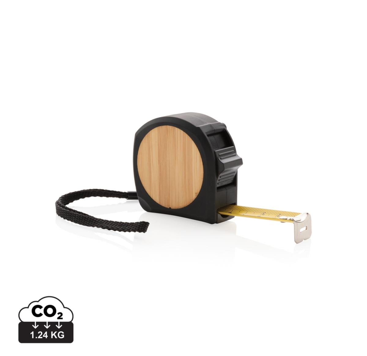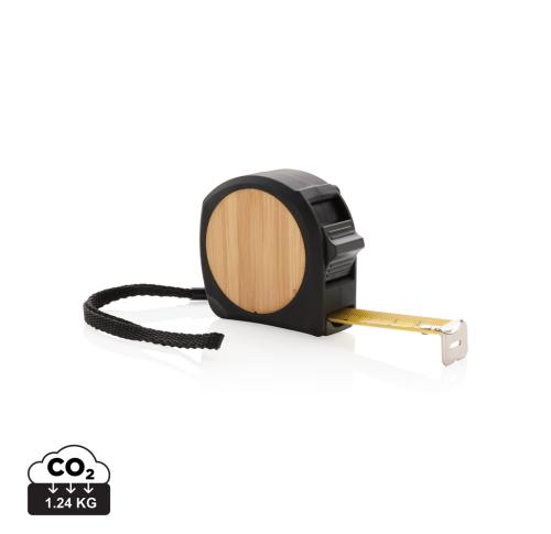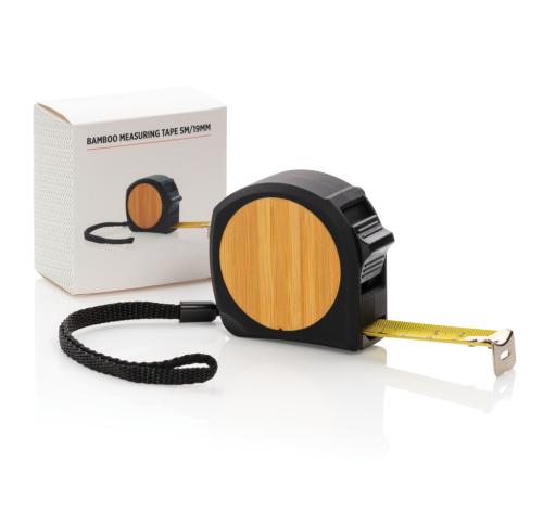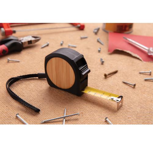 Bamboo and ABS with rubber finish measuring tape with clip and wrist strap. 5 metre/19 mm tape with hook. Manual stop button