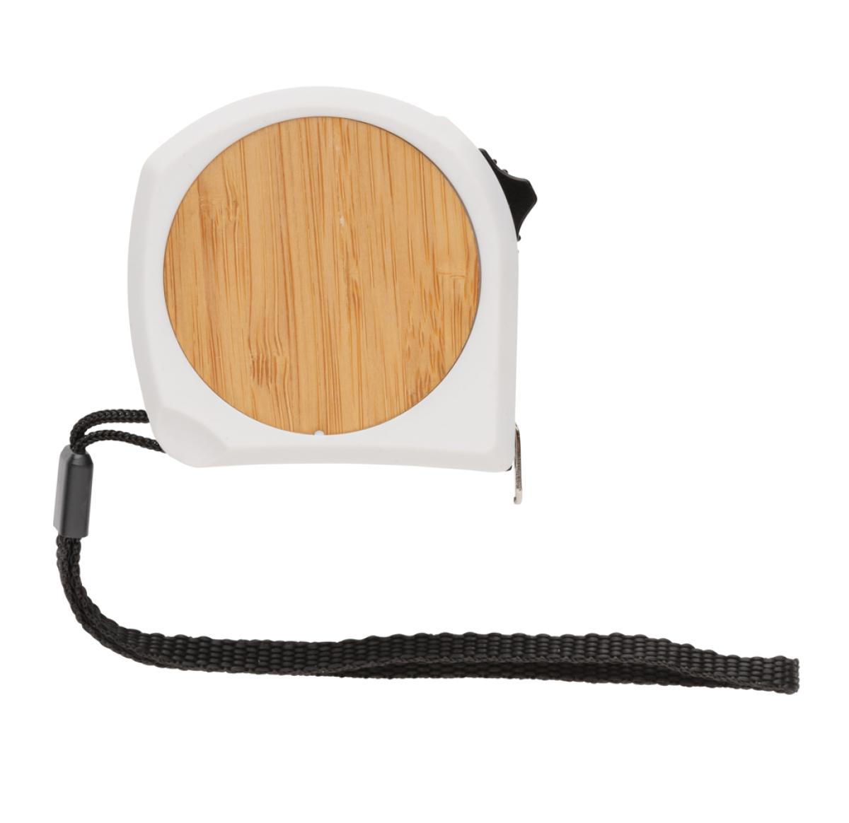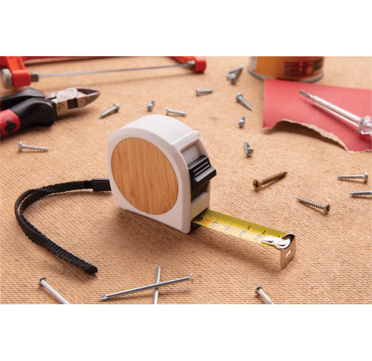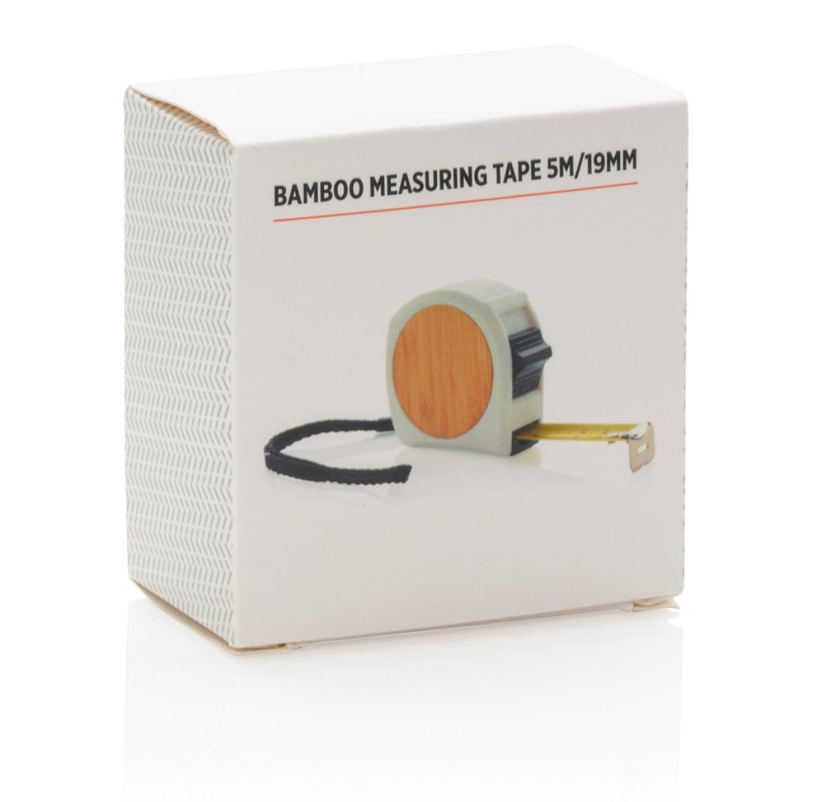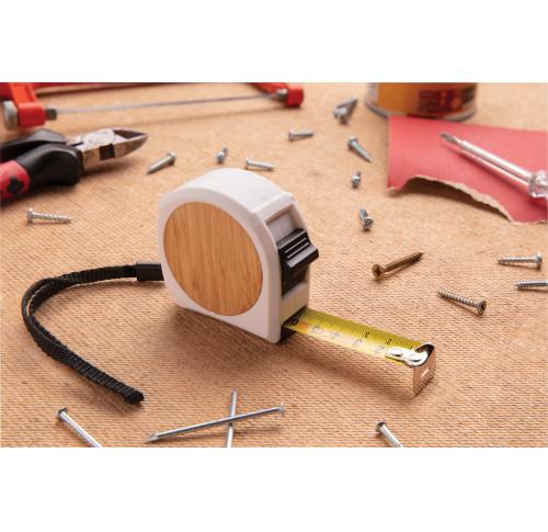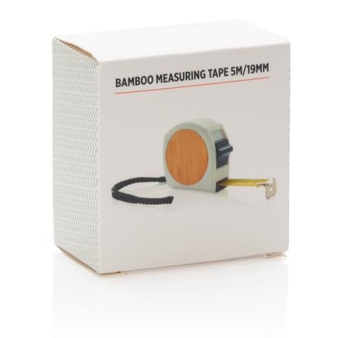 Bamboo and ABS with rubber finish measuring tape with clip and wrist strap. 5 metre/19 mm tape with hook. Manual stop button