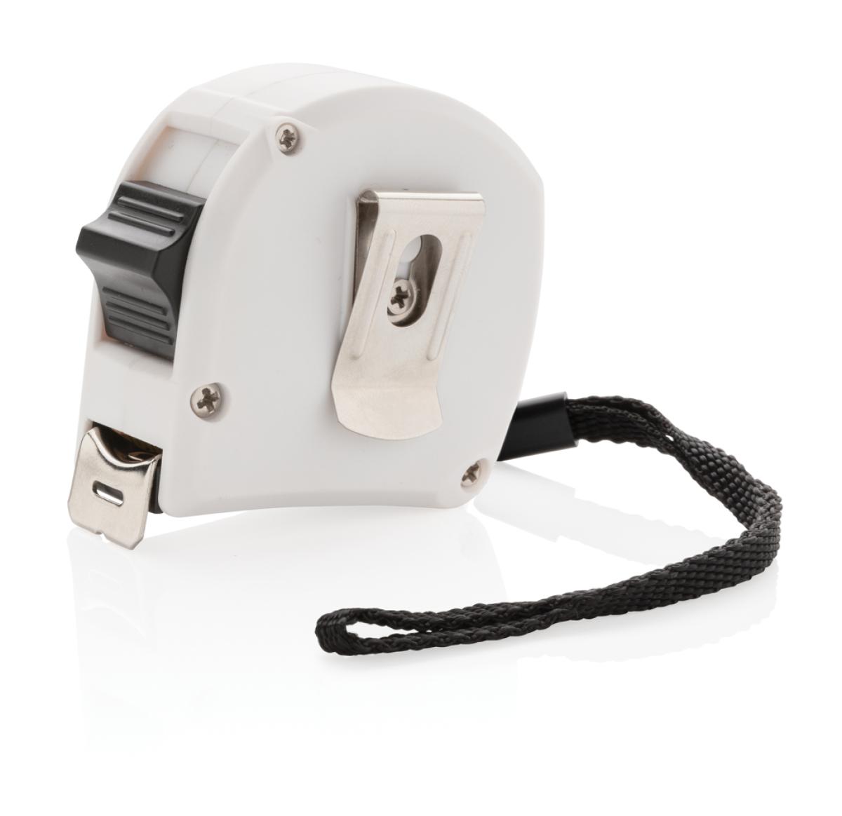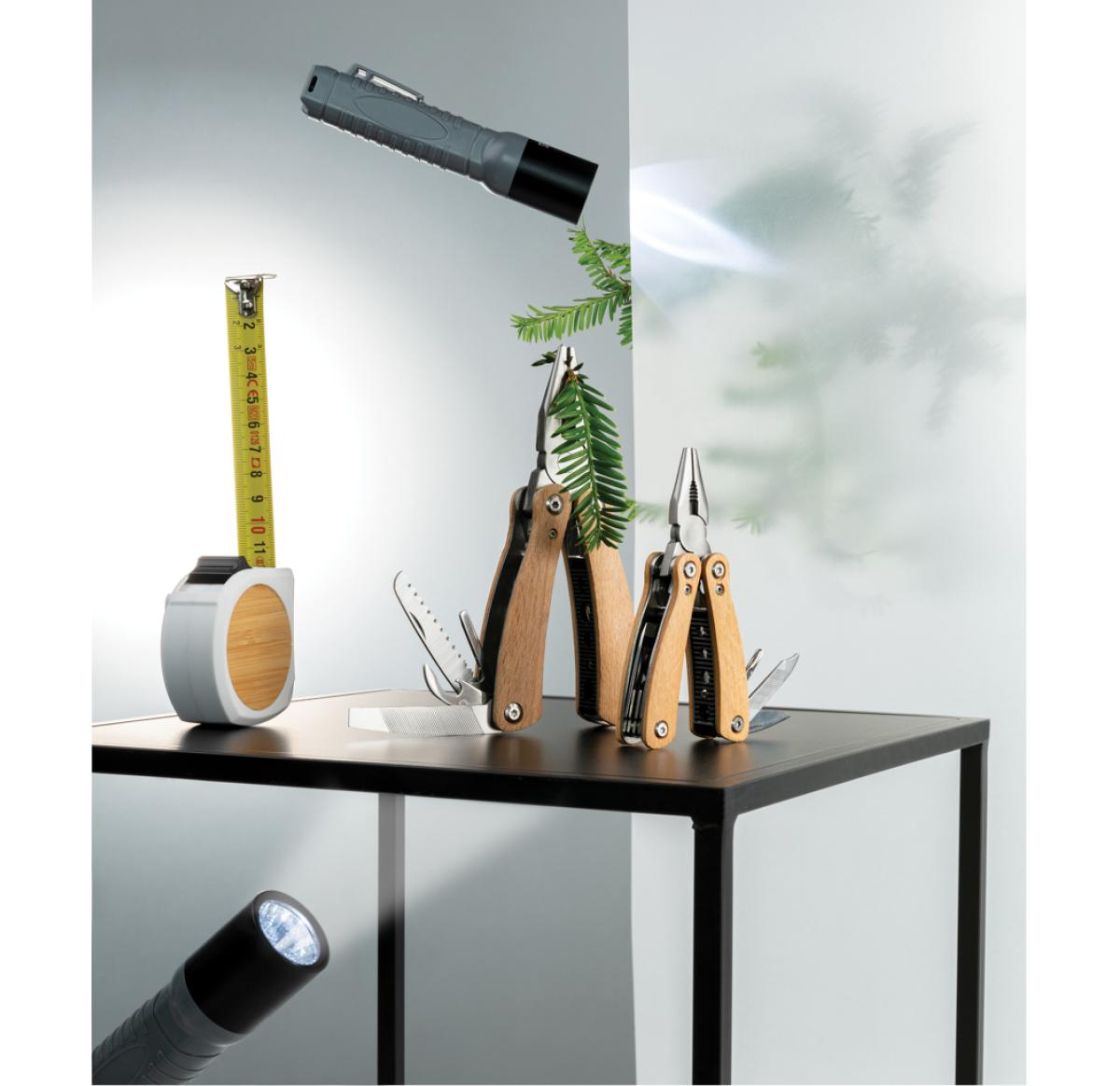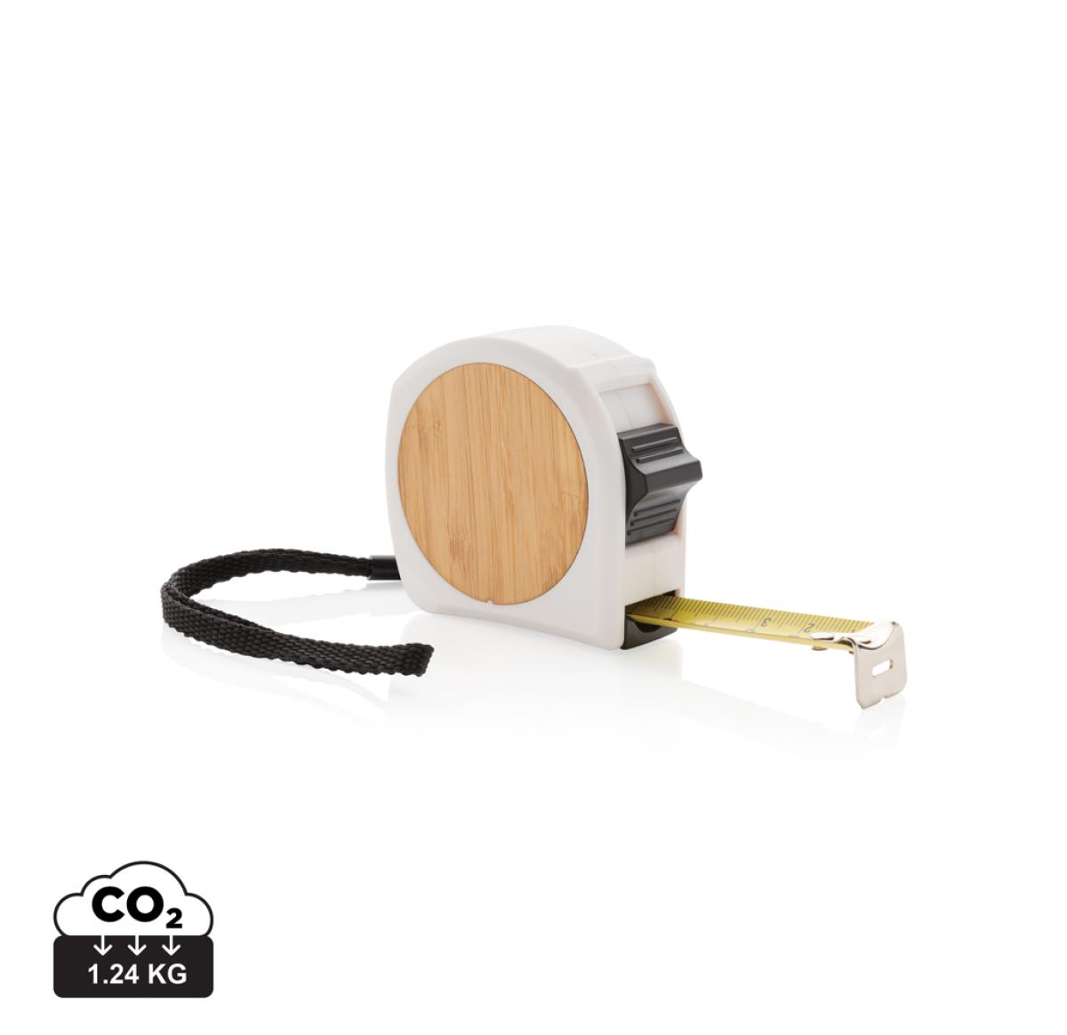 Bamboo and ABS with rubber finish measuring tape with clip and wrist strap. 5 metre/19 mm tape with hook. Manual stop button