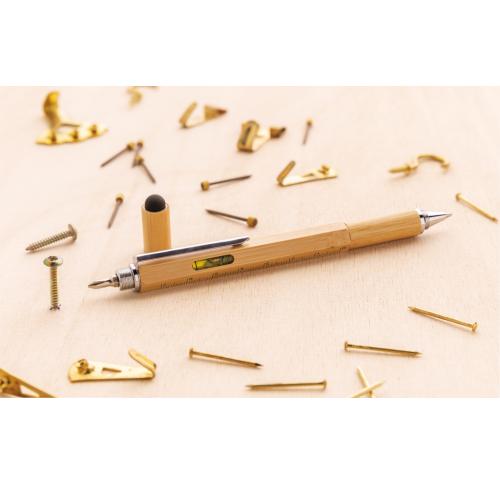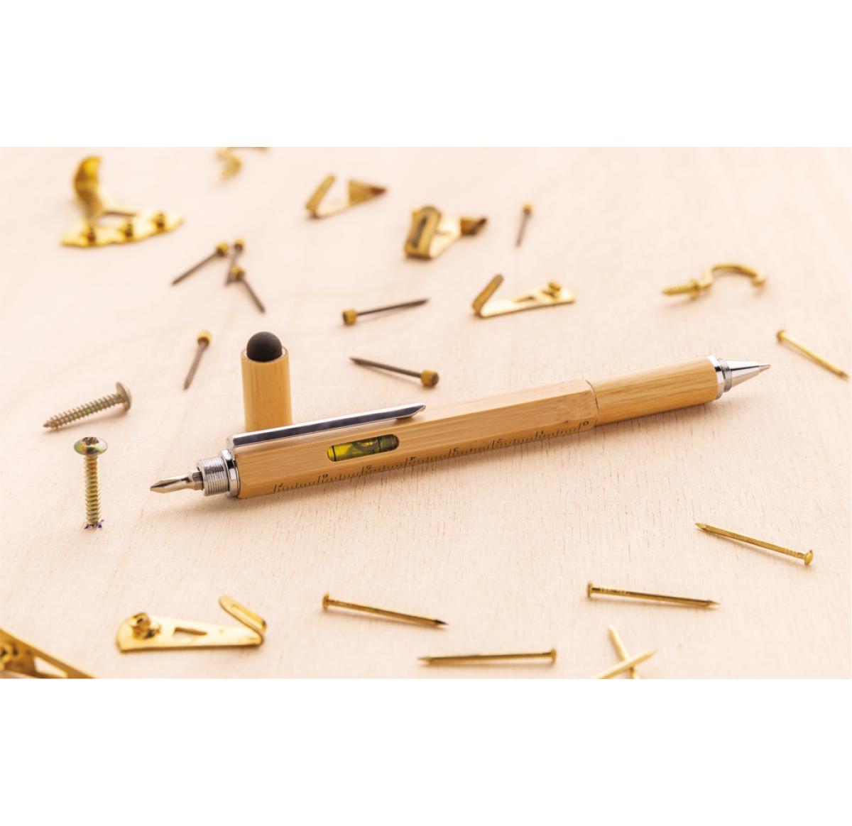 Multifunction bamboo pen with ruler (7cm) , spirit level, screw driver, stylus tip and ballpoint with blue writing ink (up to 400m) Made out of bamboo material with aluminium clip.