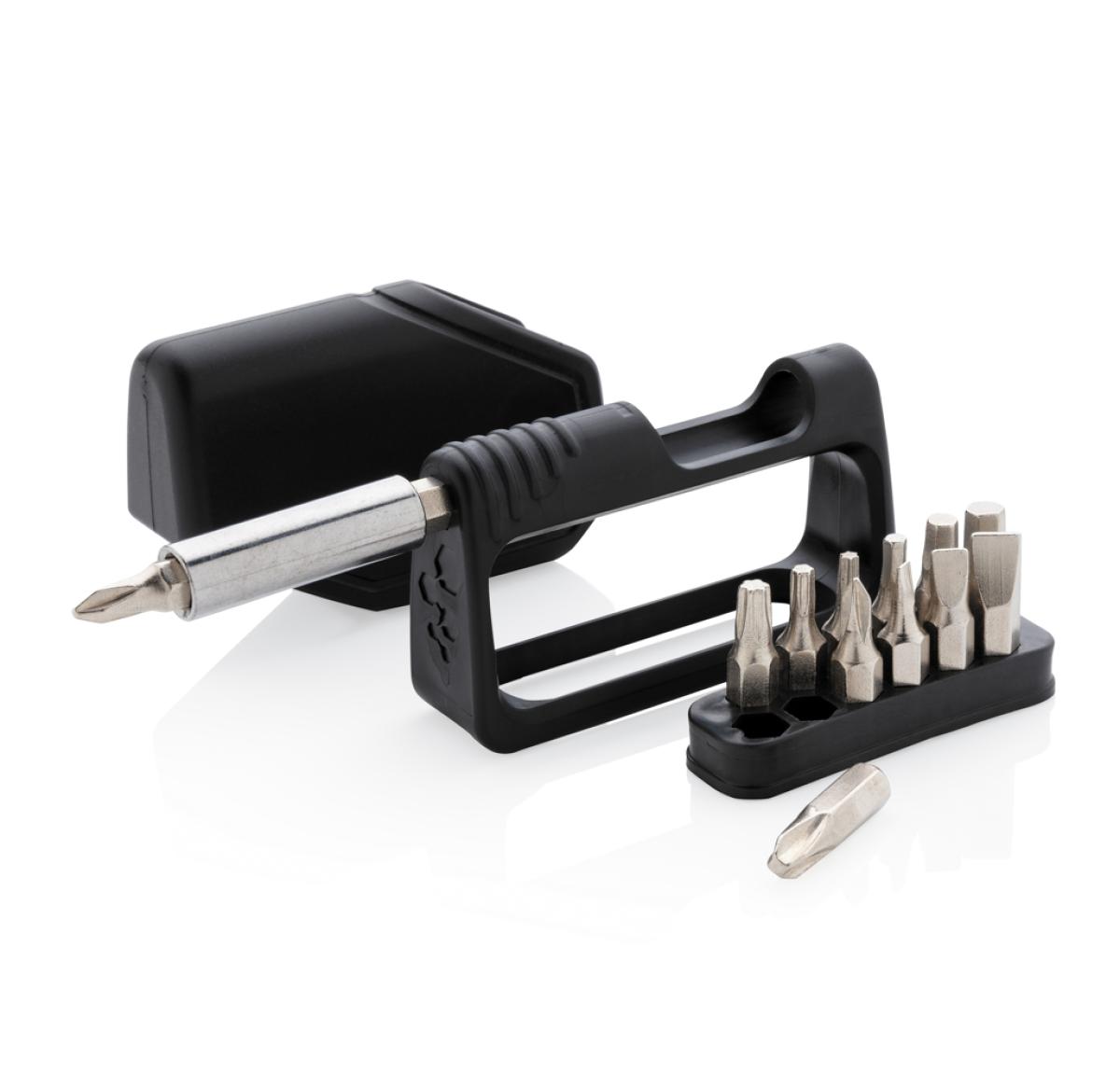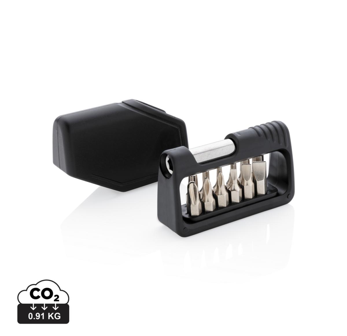 Easy to carry bit set with 12 bits and one 2” extender made from stainless steel. ABS casing with integrated holder for the bits. Bits included: 3 x TORX driver (10,15,25) 3 x Hex driver (3mm, 4mm, 5mm) , 3 x Philips drivers ( 1.8mm, #0 #2) 3 x flat drive