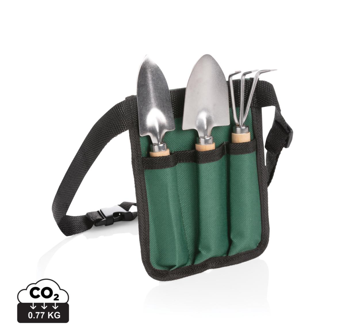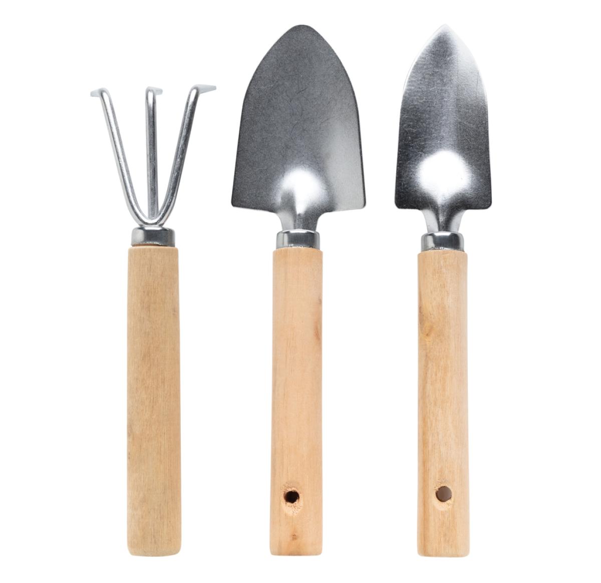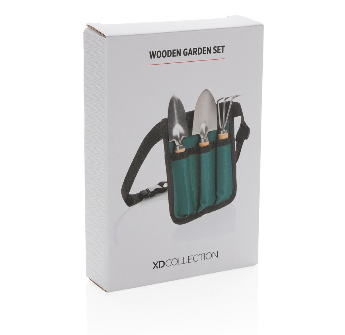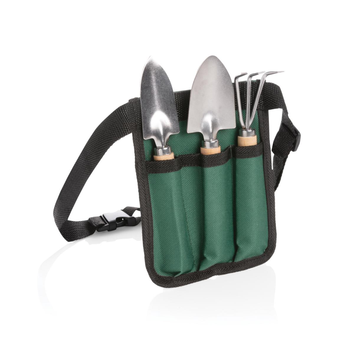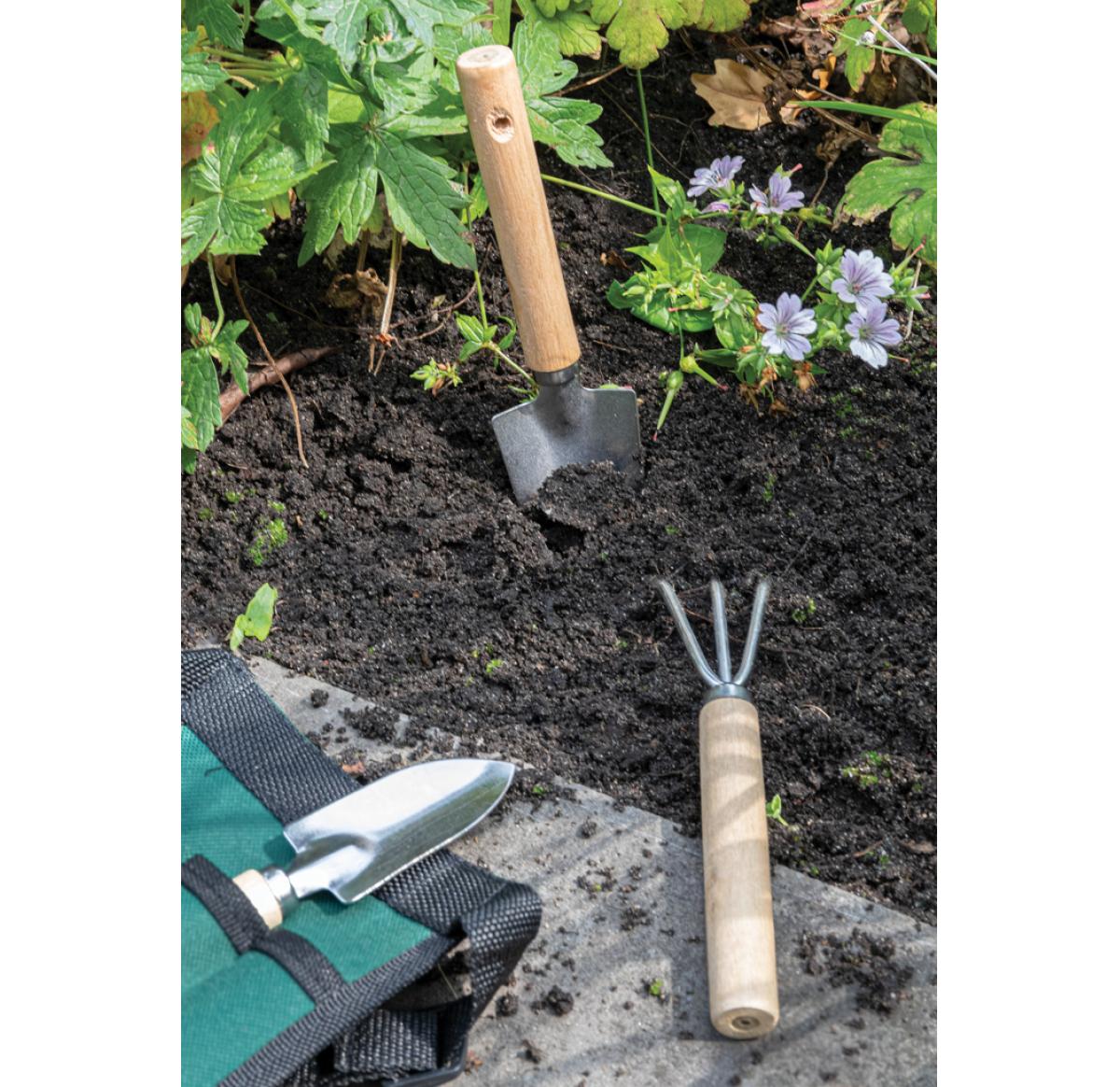 3 pcs wood garden set including a big shovel, small shovel and rake. Polyester hip pouch to store the tools in. Hip belt with clip adjustable in size up to 120 cm.