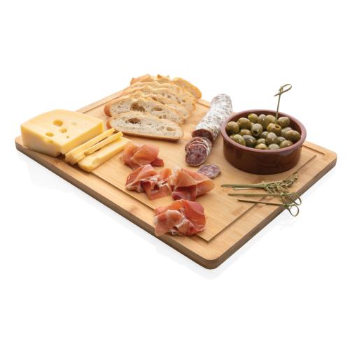 Enjoy life and live in the moment! This bamboo cutting board is an essential for every kitchen. This multi-purpose tool will be more than just your everyday cutting board, making it perfect for prepping and serving meals. With juice gutter to avoid spilli