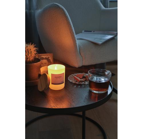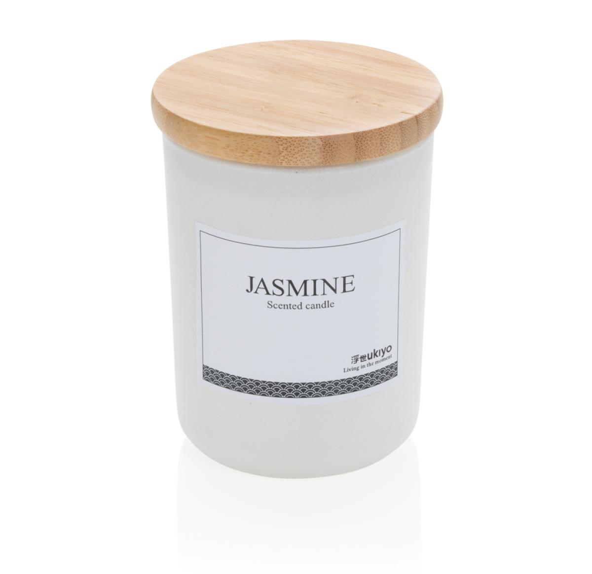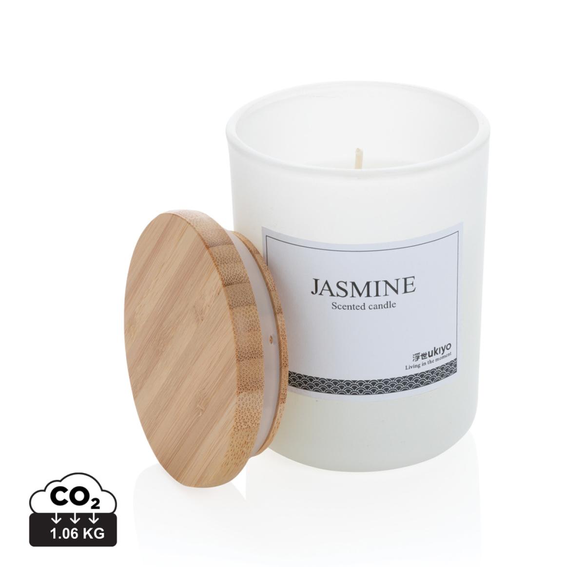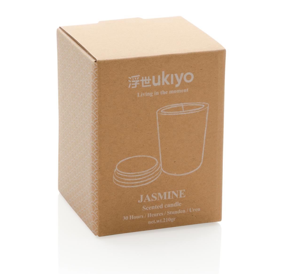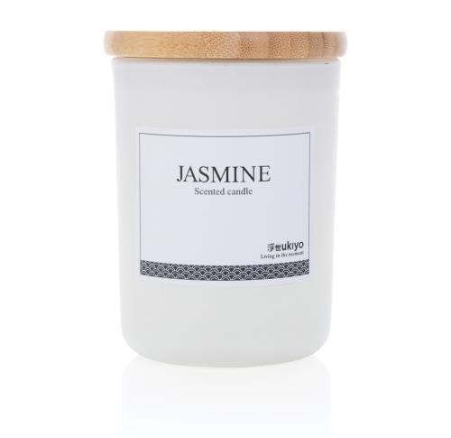 Create warmth and cosiness in your home with this Ukiyo scented candle. Enjoy the subtle jasmin scent that is released. The scented candle comes in an elegant jar with bamboo lid.