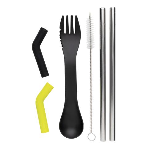 The Tierra 2 pc straw and cutlery set is the ideal set to take with you on the go when you want to reduce the use of single-use plastic. The set contains 2 stainless steel straws, a cleaning brush, a spork and 2 bent silicone straw pieces to attach to the