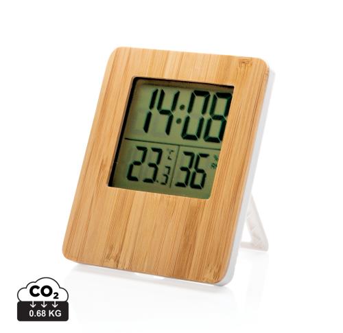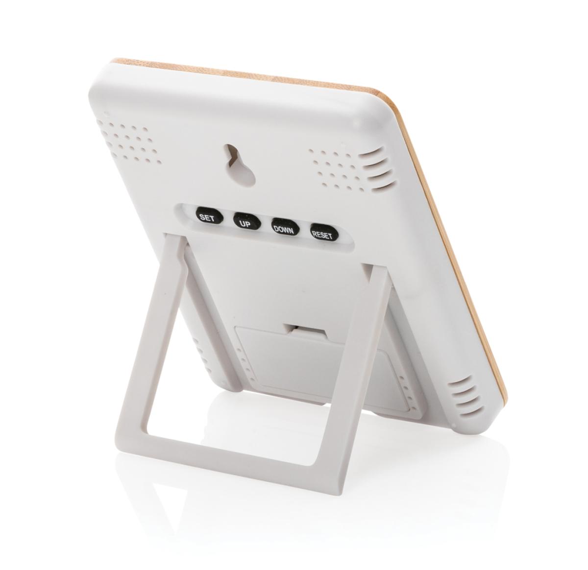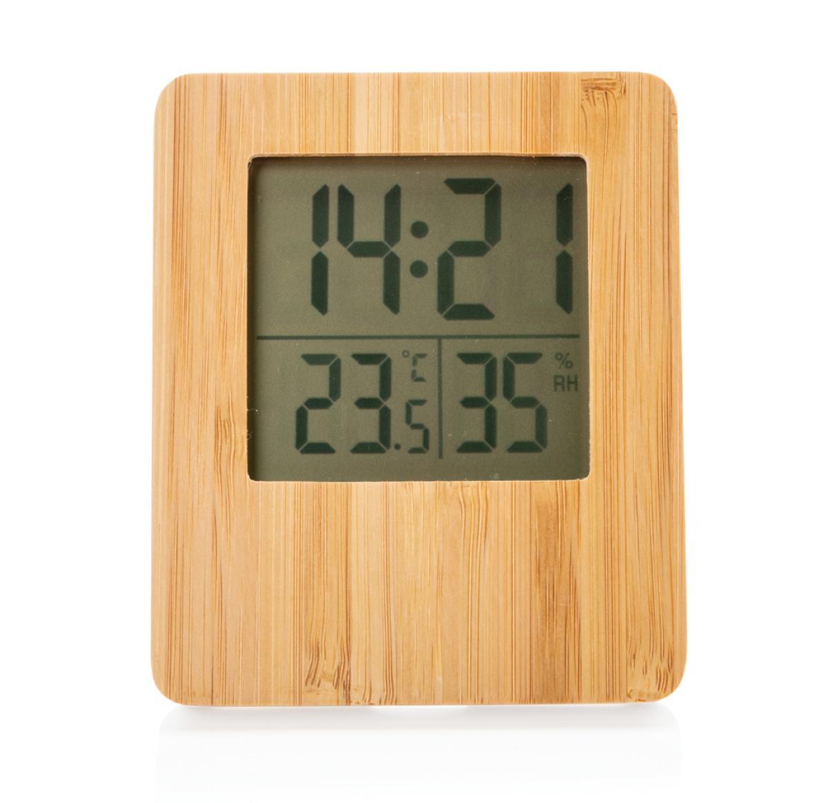 Bamboo weather station with 3 functions: time/date, indoor humidity and temperature. Including 2 AAA batteries for direct use. Bamboo and ABS material. Humidty tolerance max 5%.