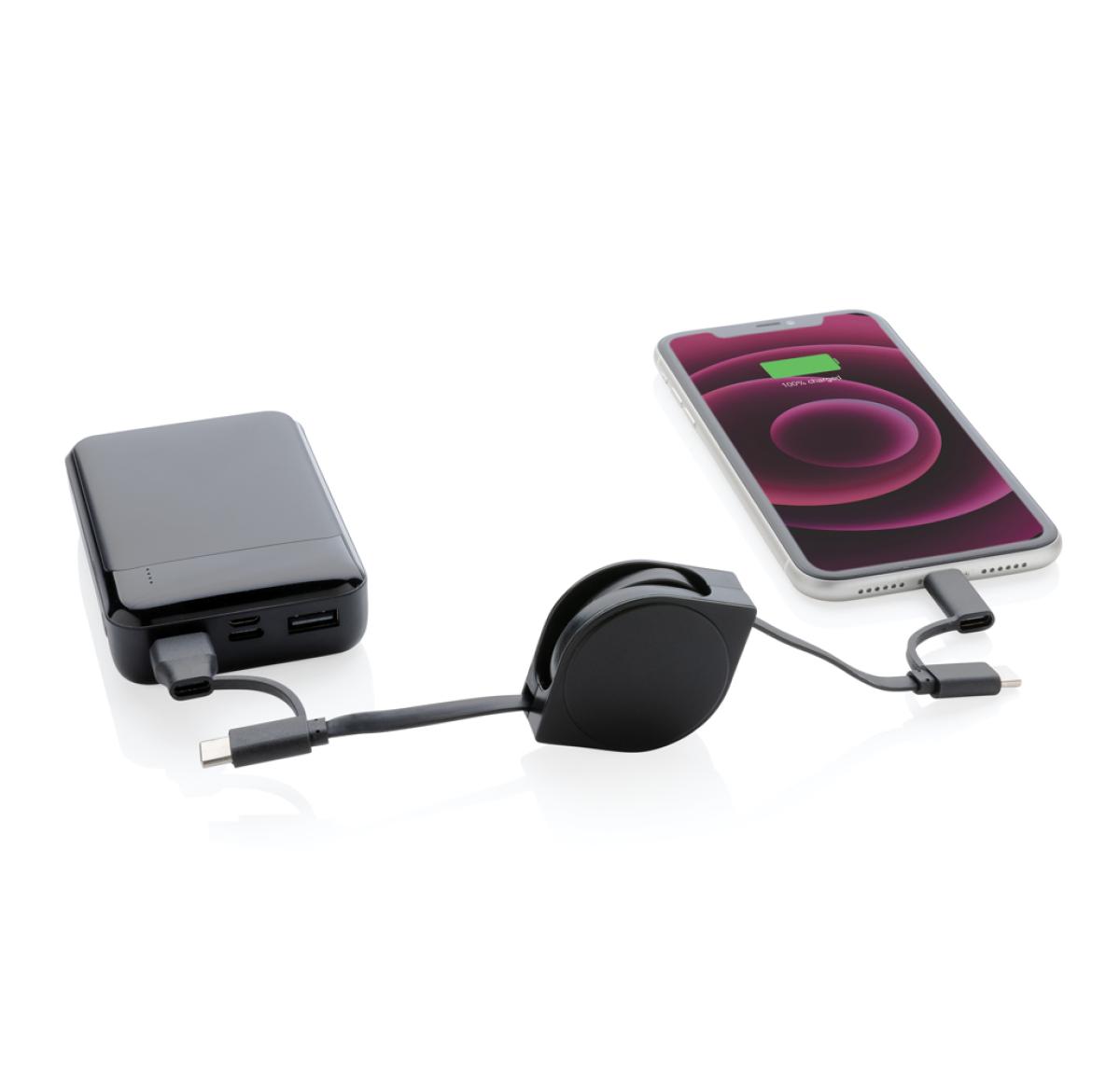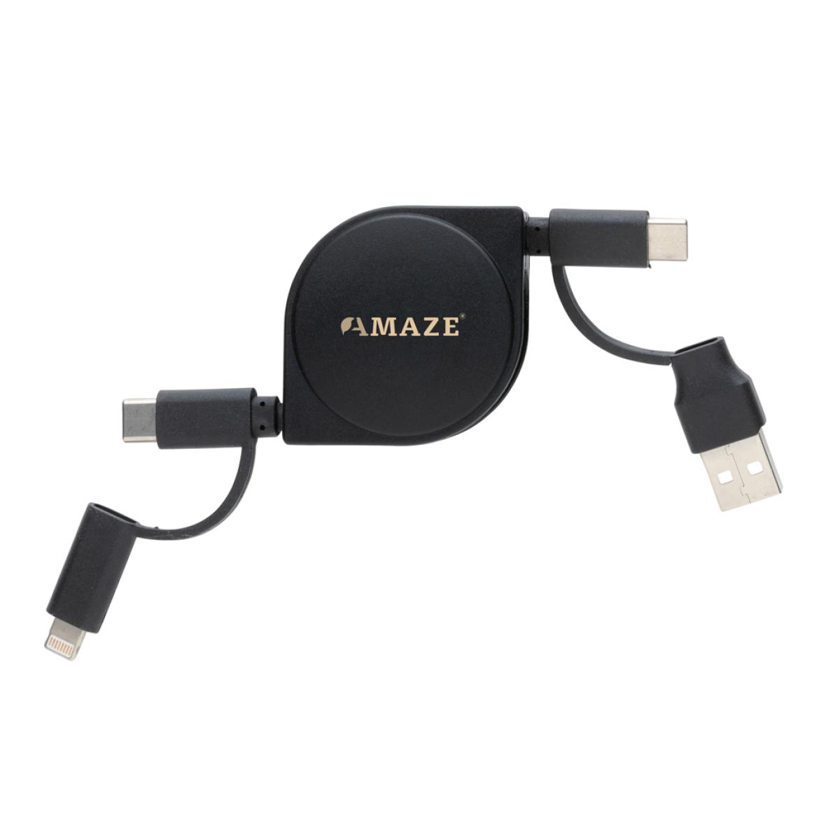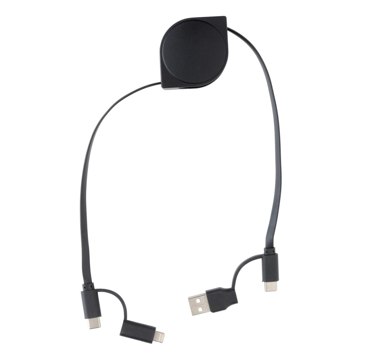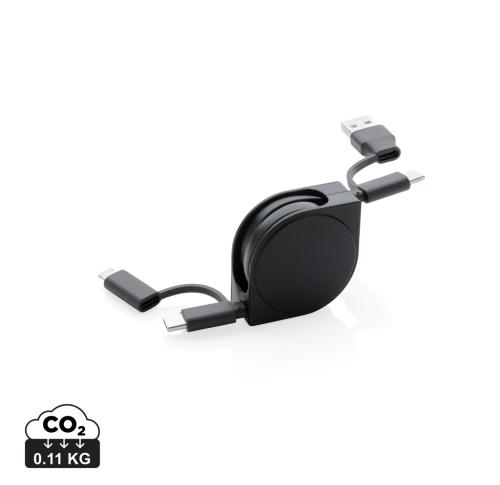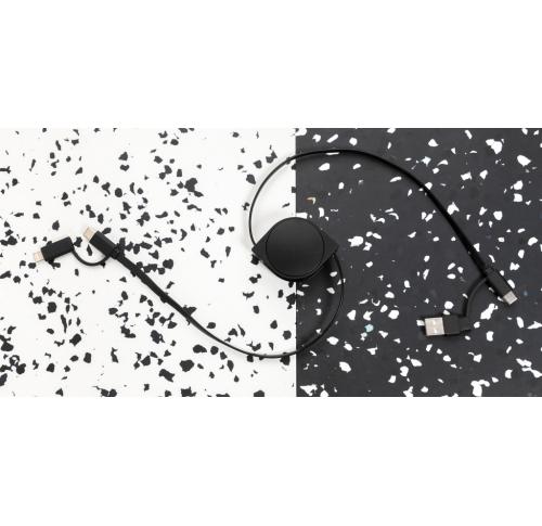 6-in-1 retractable cable where the case is made out of RCS certified recycled ABS plastic and the wire from recycled TPE. Total recycled content: 59% based on total item weight. RCS (Recycled Claim Standard) is a standard to verify the recycled content of