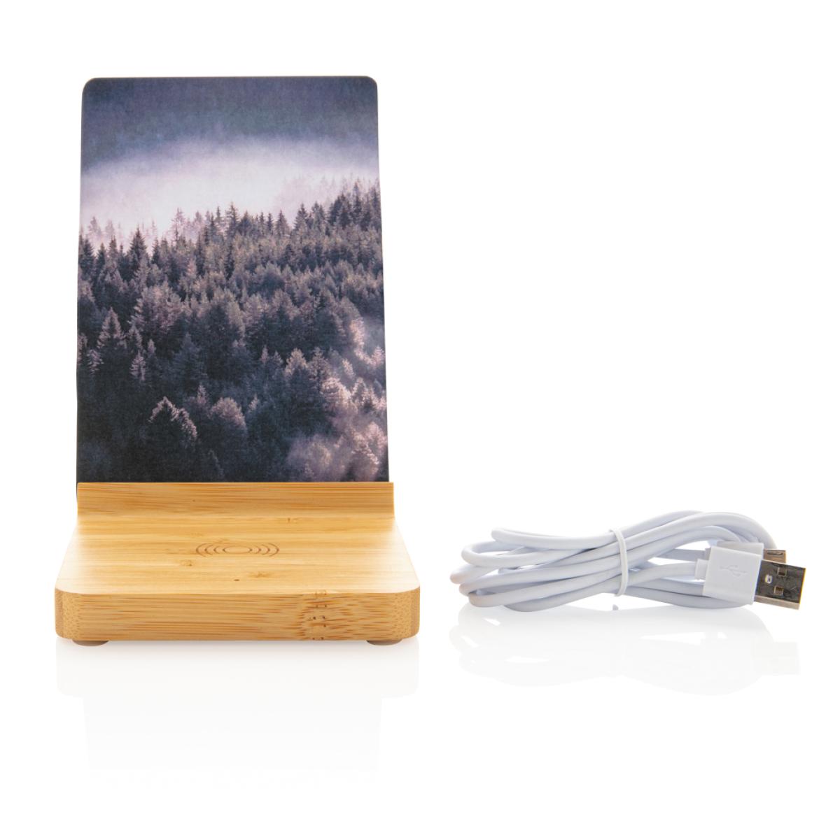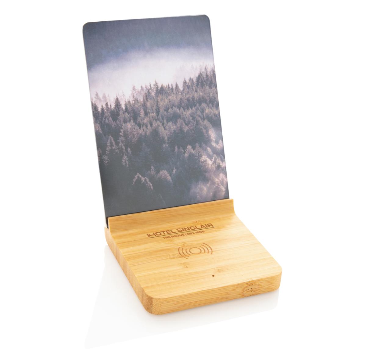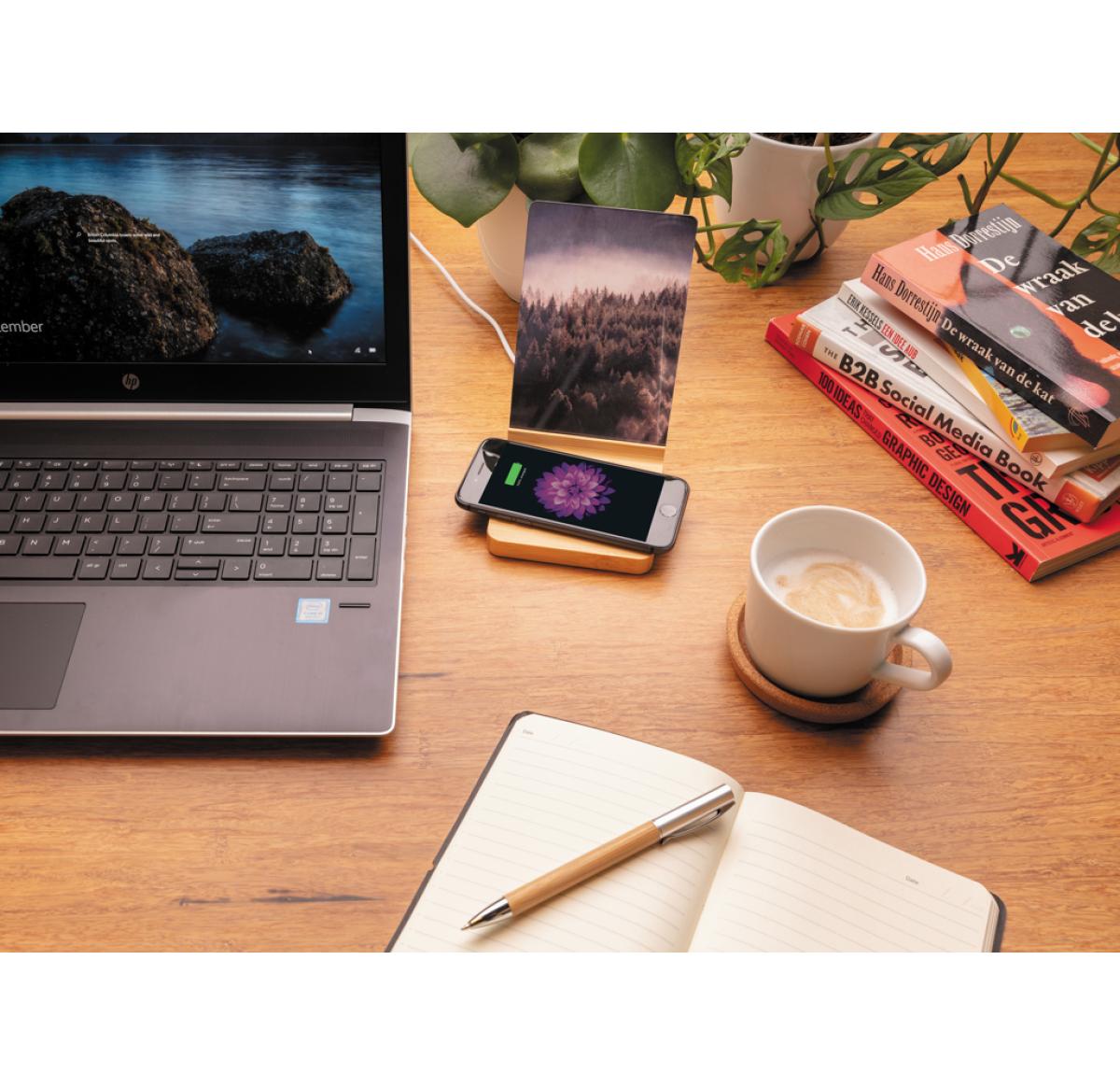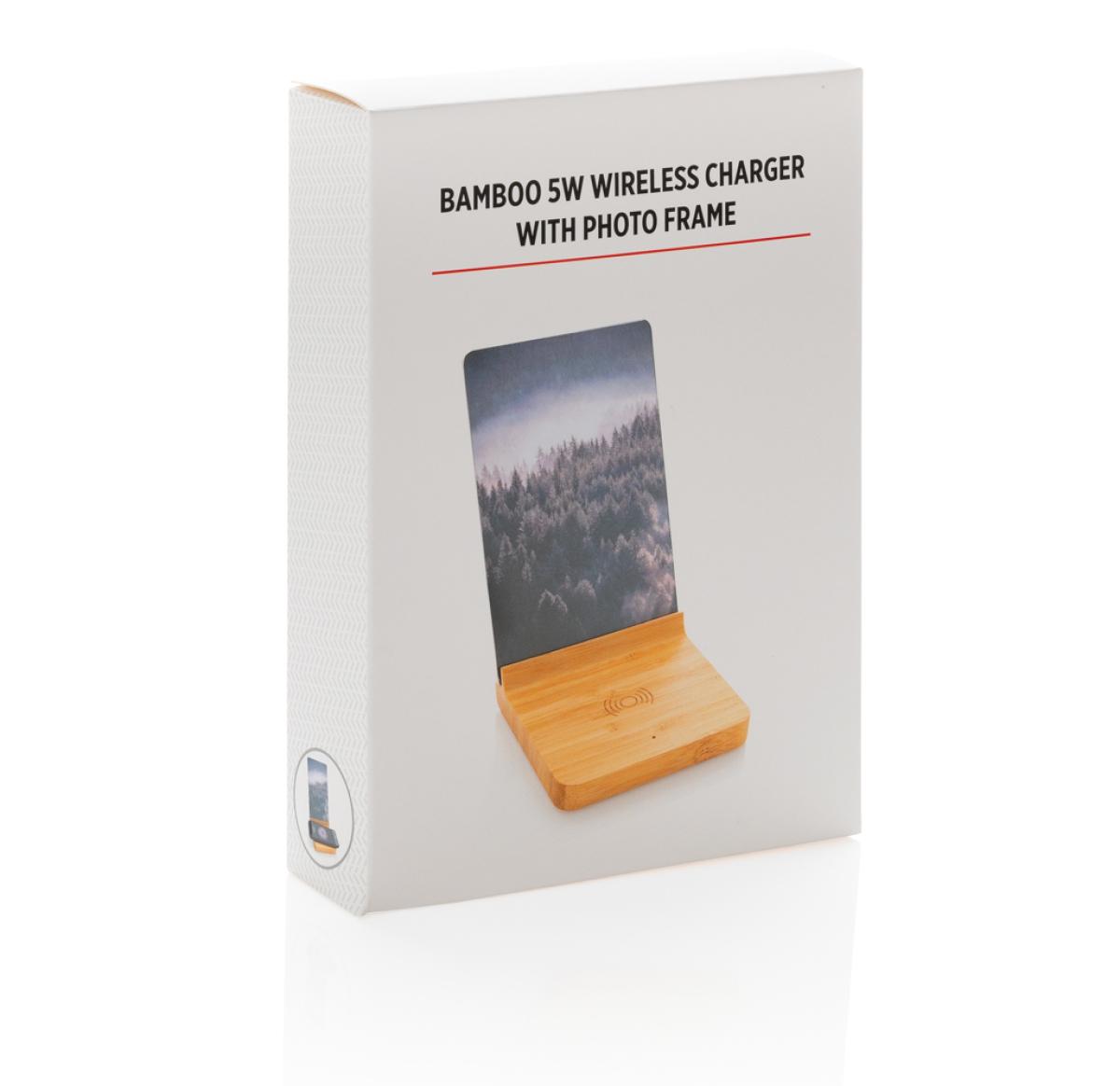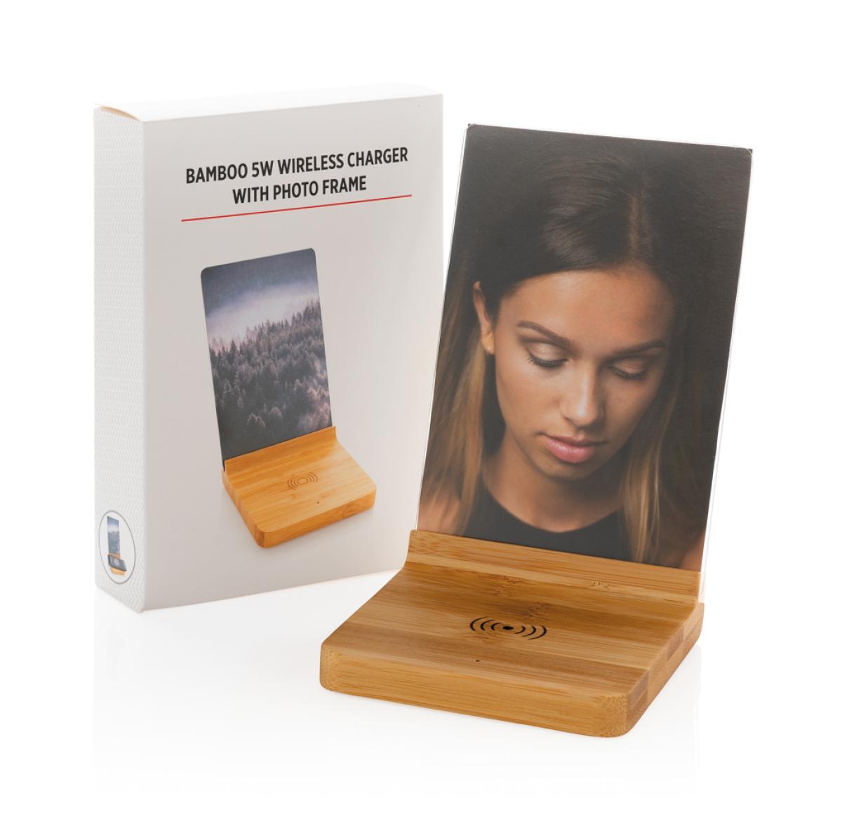Bamboo 5W wireless photo fame with bamboo wireless charging base and acrylic ( 15 x 10 cm) photo frame. Including 150 cm PVC free TPE micro charging cable. With rubber tips on the bottom to avoid the item from sliding. Compatible with all QI enabled devic