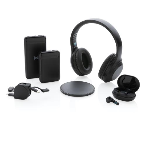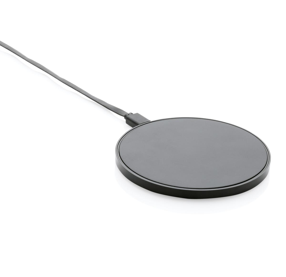 10W wireless charger with dual connector cable (USB A and USB C) where the case is made out of RCS certified recycled ABS plastic and the wire from recycled TPE. Total recycled content 58% based on total item weight. RCS (Recycled Claim Standard) is a sta
