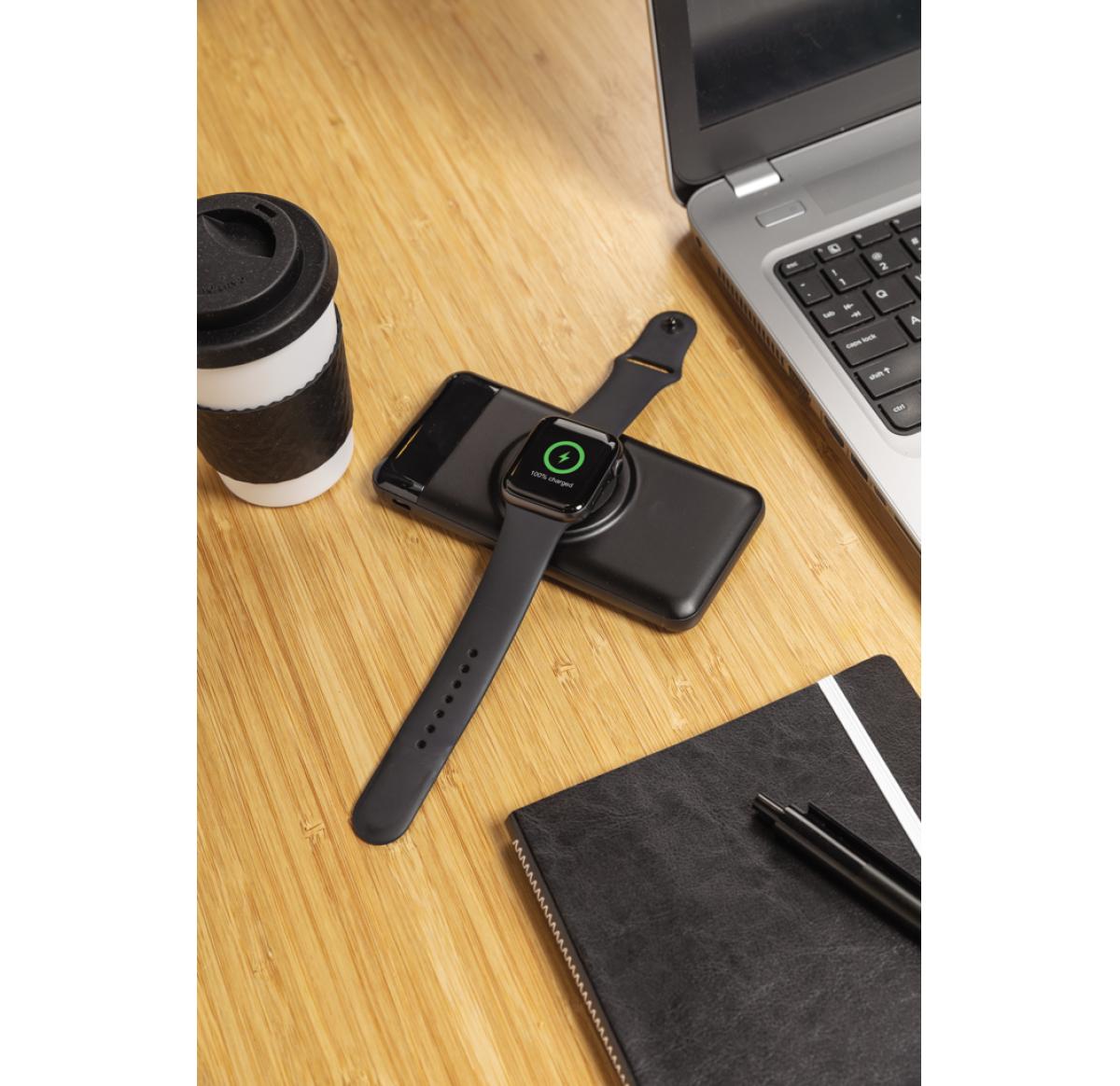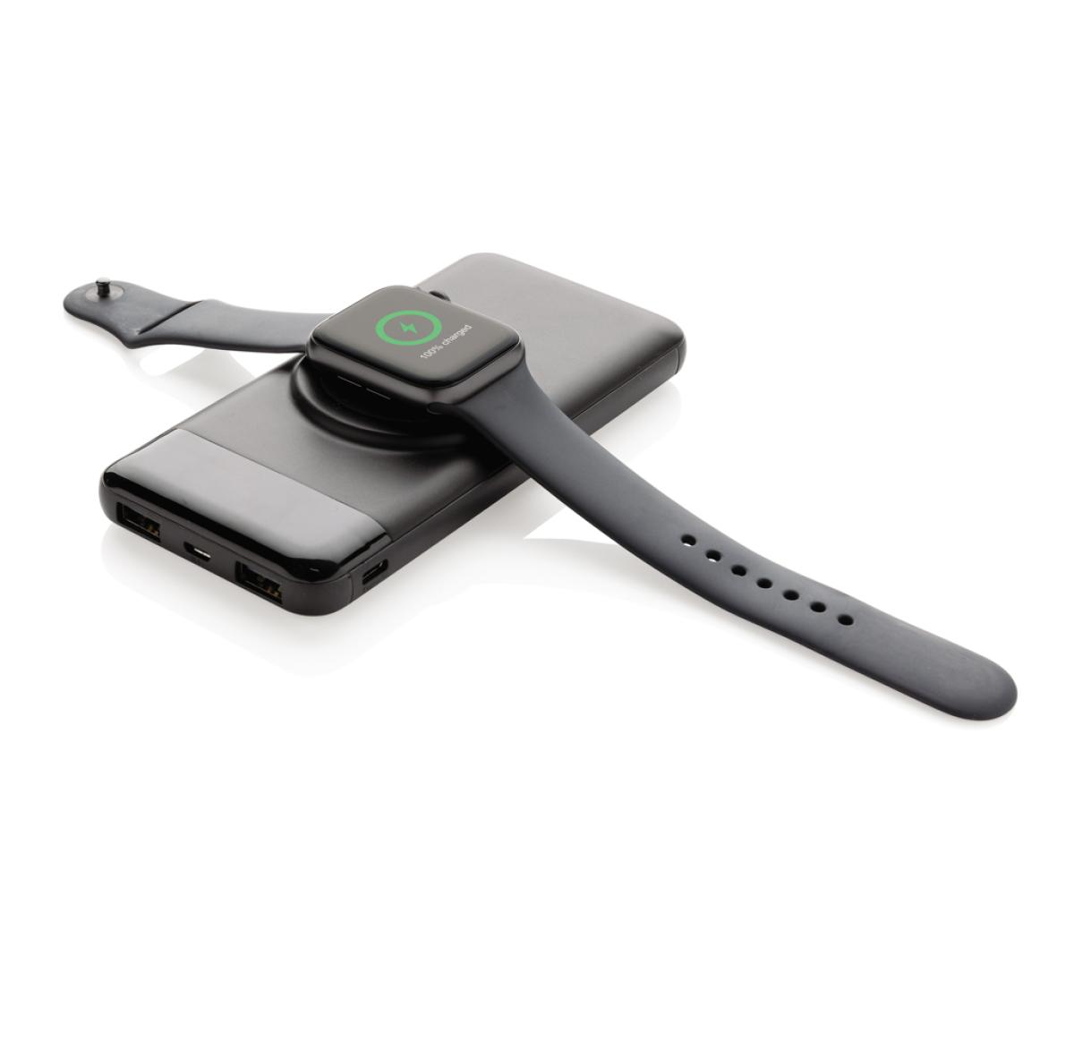 Multifunctional 10.000 mah powerbank that can charge your mobile devices wirelessly and also your Apple watch via the 3W wireless watch charger. Simply place your phone or watch on the wireless charging pad to charge it. With 2 USB output ports to charge