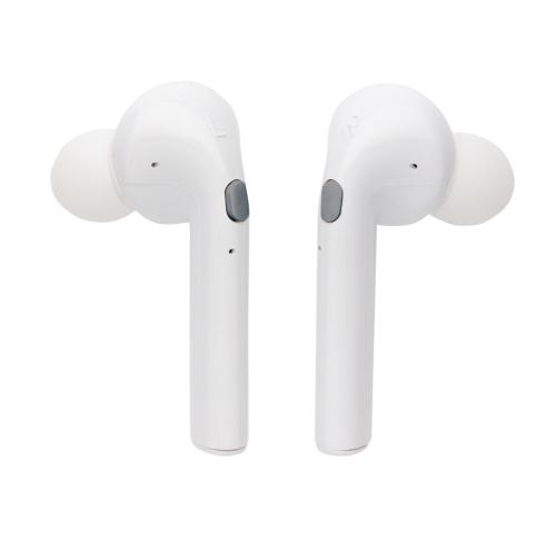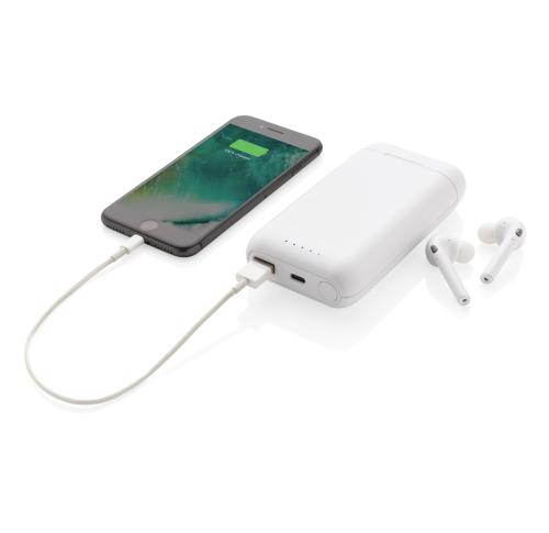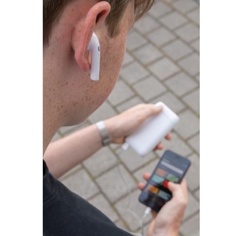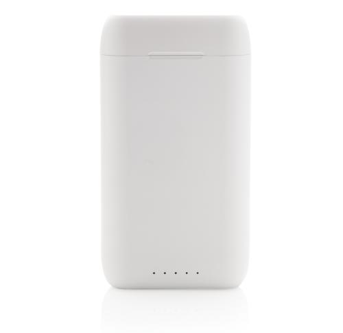 Unique 2 -in- 1 design powerbank with integrated true wireless earbuds. ABS material earbuds and casing including charging indicator light. The earbuds use BT5.0 for smooth and easy connection of the earbuds with your phone. The earbuds have a 35 mah bat