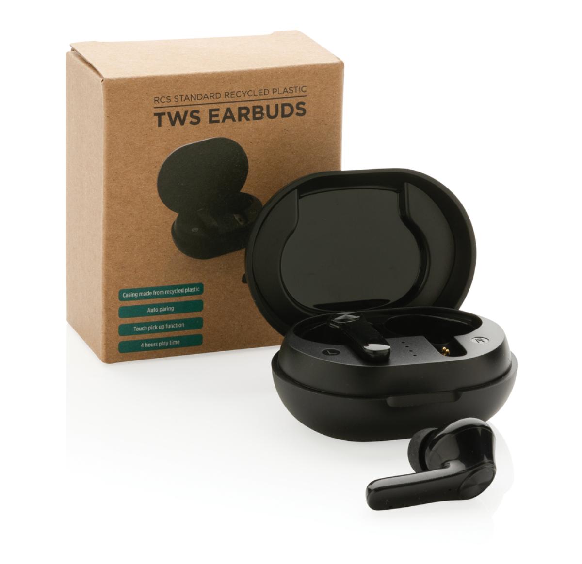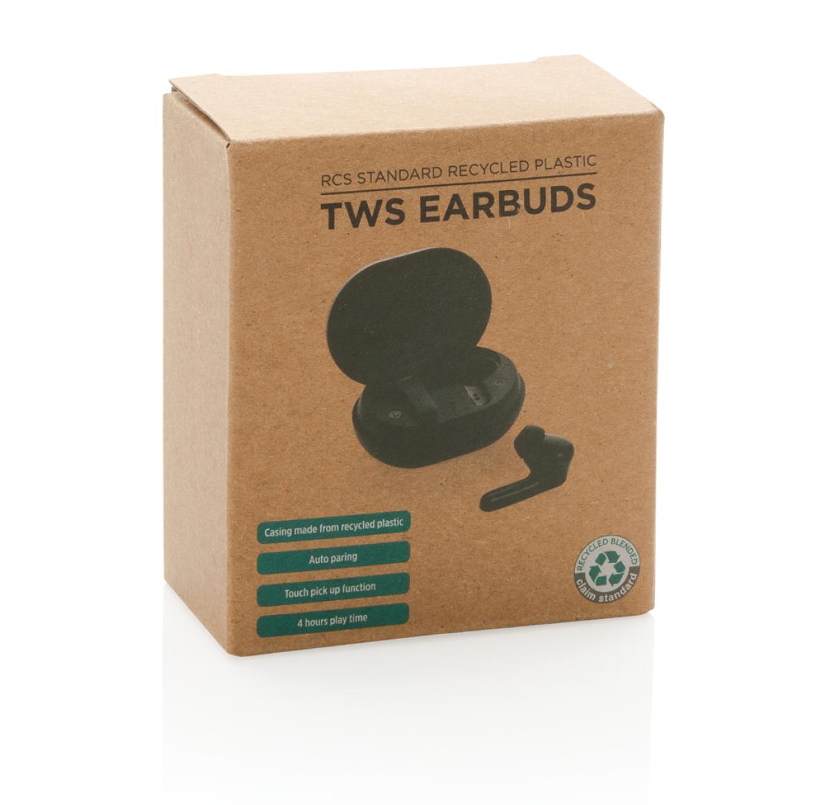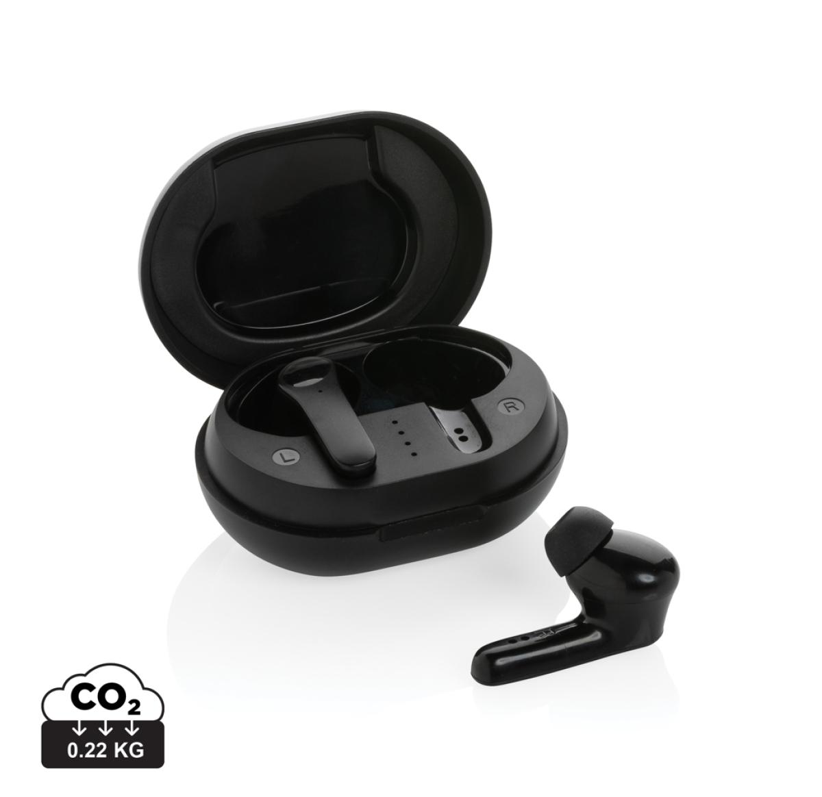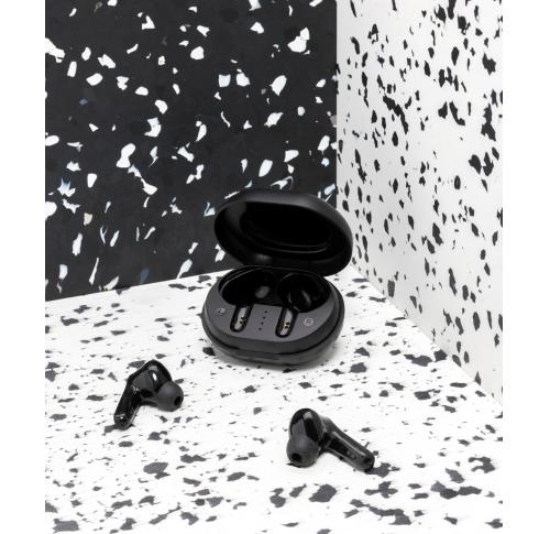 TWS earbuds where the the earbud and the charging case are made out of RCS certified recycled ABS plastic. RCS (Recycled Claim Standard) is a standard to verify the recycled content of a product throughout the whole supply chain. RCS is the standard that