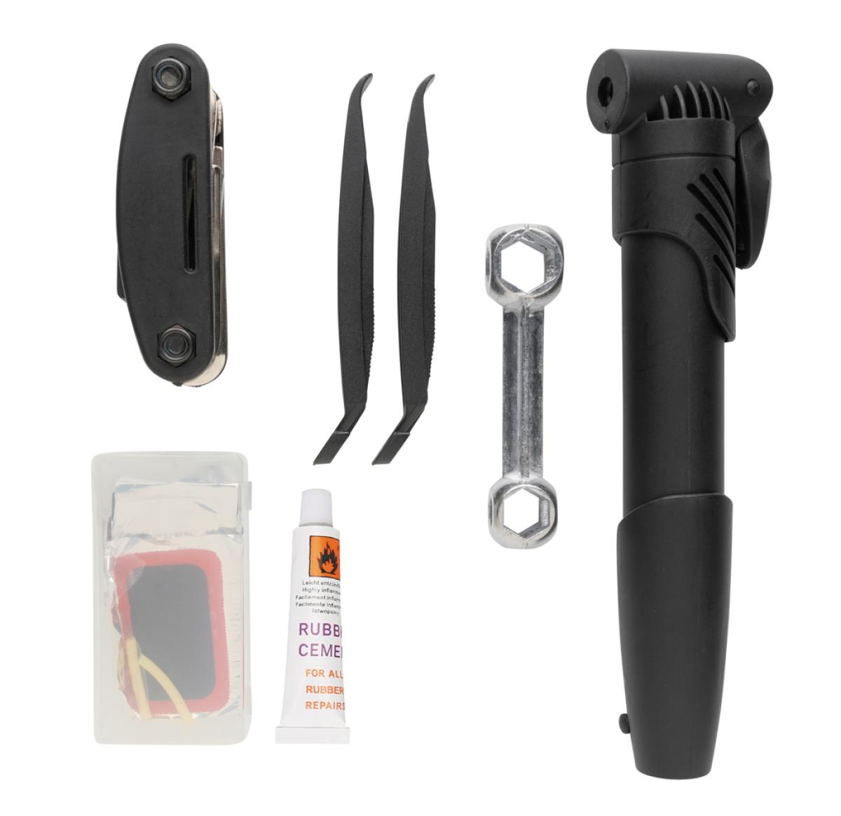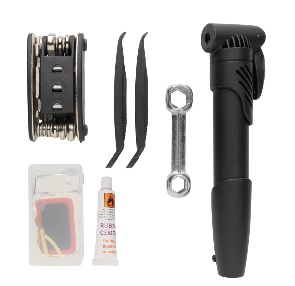 Luxury bike repair set in 600D pouch. The set contains 6pcs rubber repair patches, 1 pc tinplate grater, 2pcs latex valve tubes, 1pc glue, 2pcs nylon lever, 1pc aluminum alloy bone wrench, 1 pc carbon steel 16-in-1 multi tools, 1 nylon Pump. The 16 in