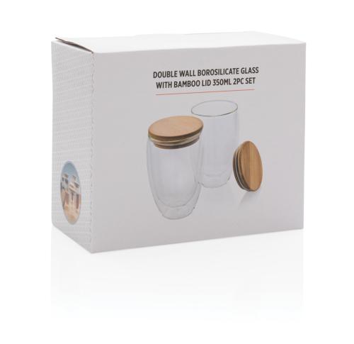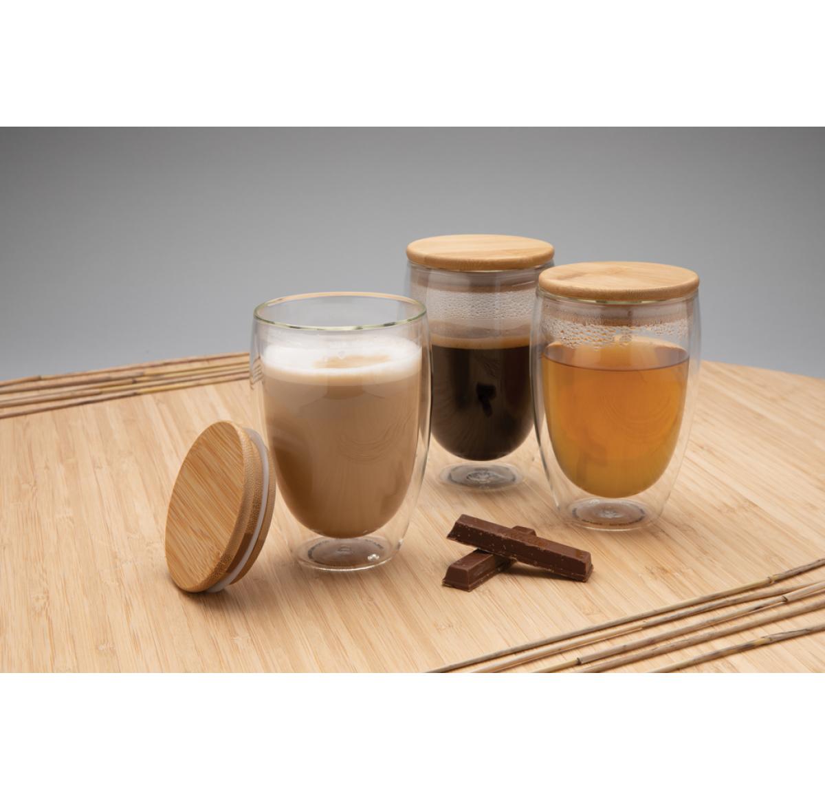 This double wall borosilicate glass set has a sleek 2 layer design which showcases all your favourite drinks! No matter what you serve, cappuccino, tea or latte, it will be nice and hot while your hand stays cool. Incudes a bamboo lid. It is recommended