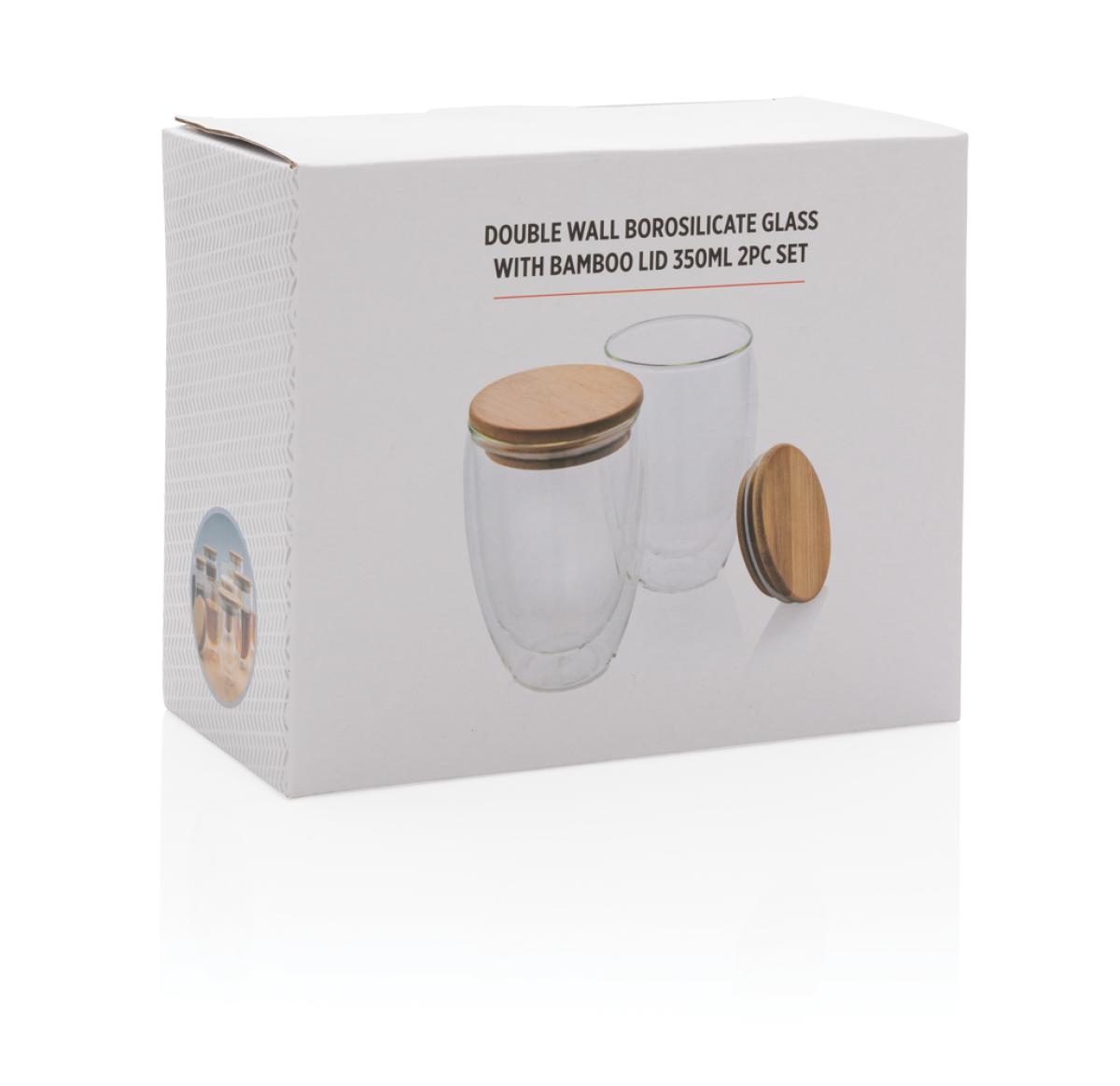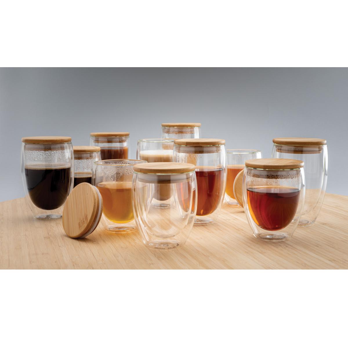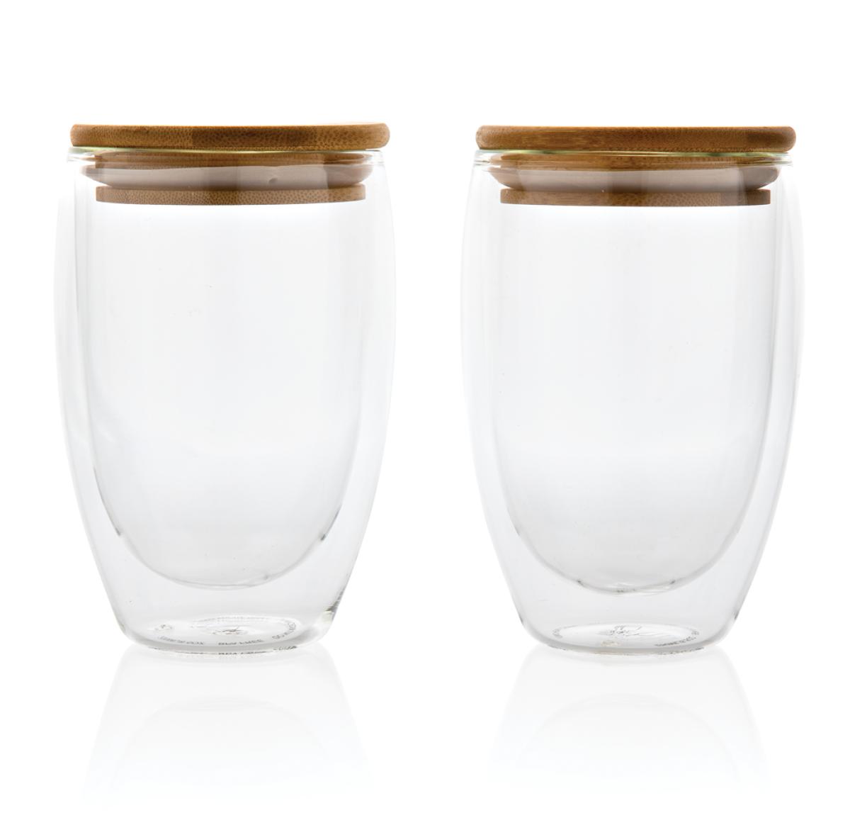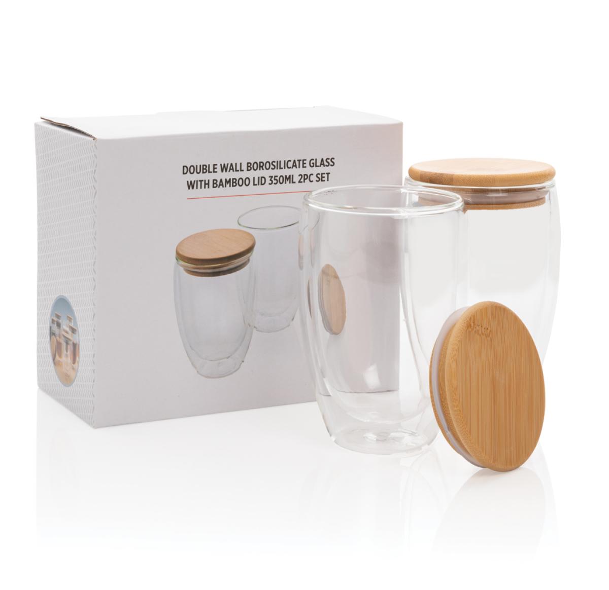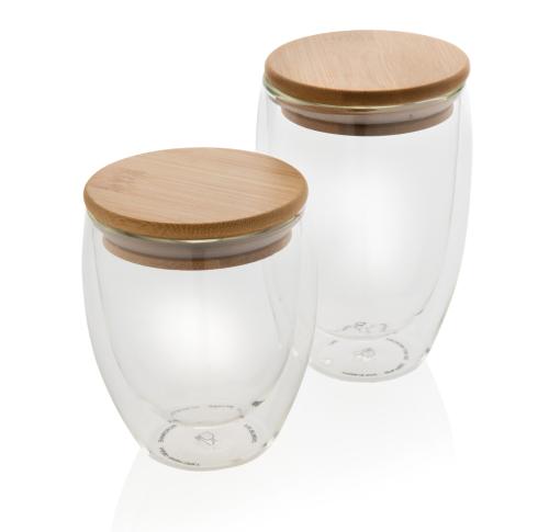 Promotional Double Wall Borosilicate Glass Coffee / Tea Mugs With Bamboo Lid 350ml 2pc Set