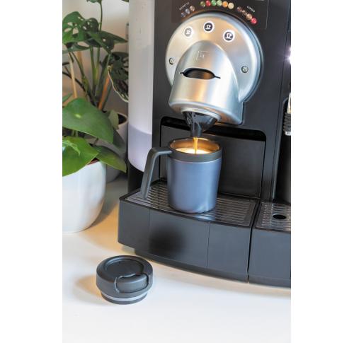 Less is more. Being 8cm high this is the perfect double wall mug for your coffee machine. PP inner. Great for Ristretto, Espresso and Lungo coffee. Nice handle for 1 hand drinking. Easy twist spill proof lid. Hand washable only. Content 160ml. Registered design®