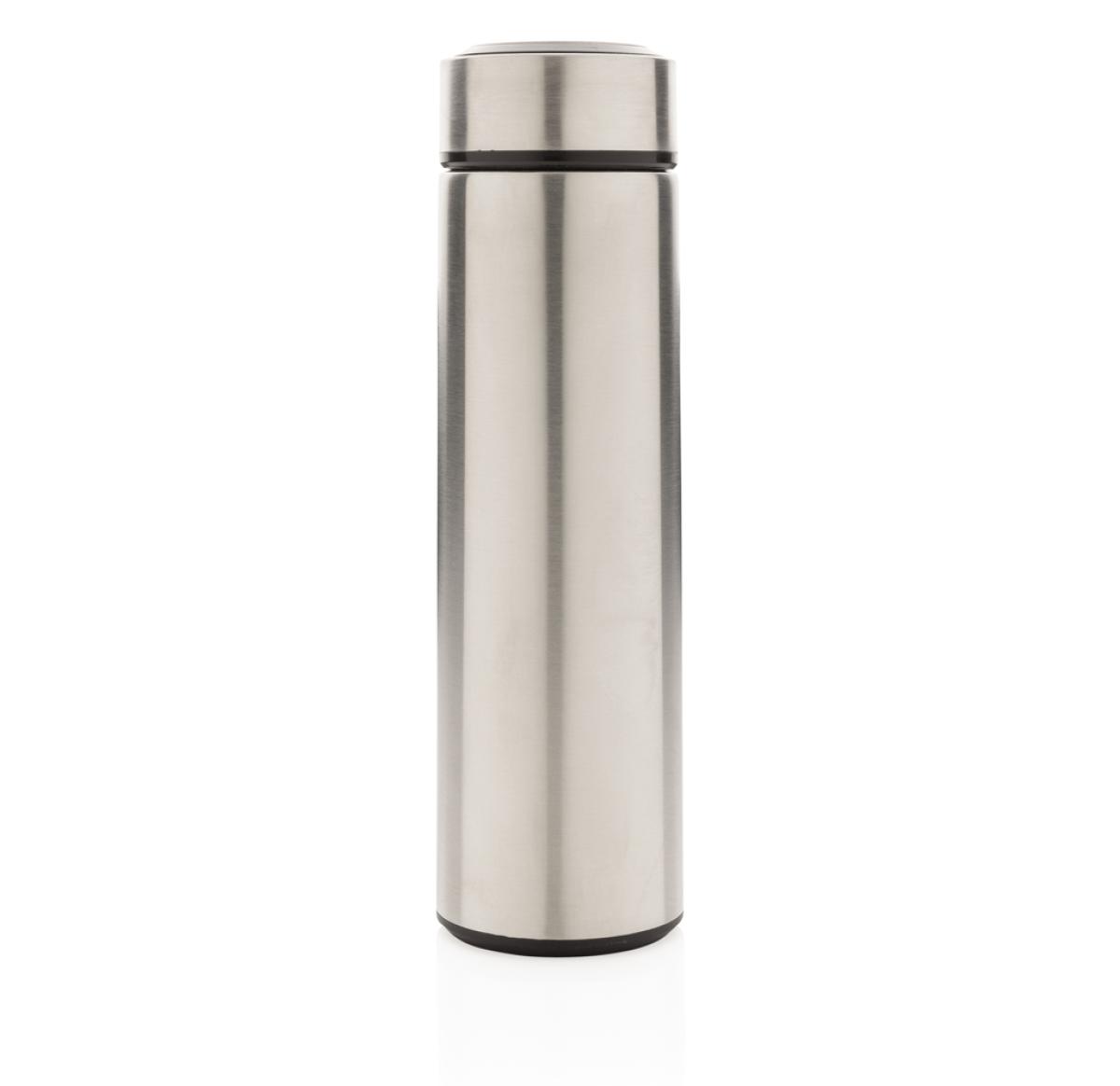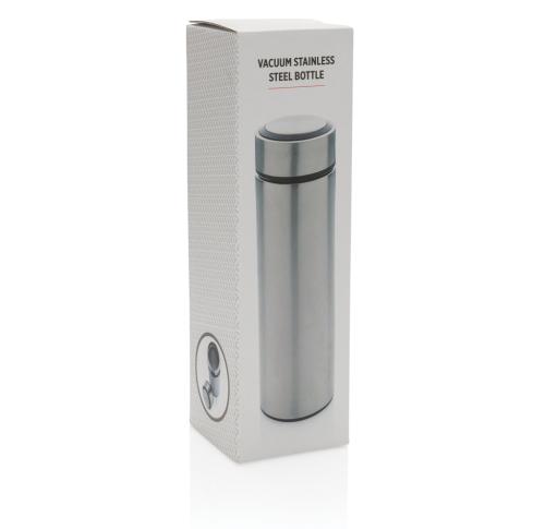 Keep coffee or tea nice and toasty in this vacuum stainless bottle with brushed metal lid. The bottle features a leak-proof screw lid and allows for drinking from any side. The wide mouth opening allows for easy cleaning. Capacity 450ml. BPA free.