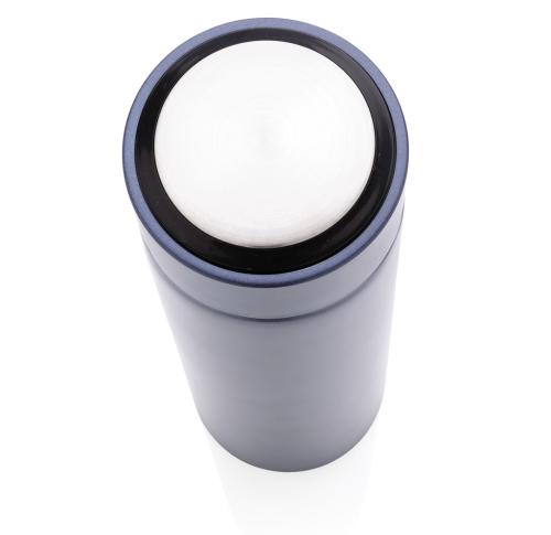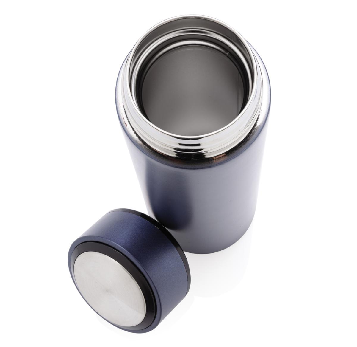 Keep coffee or tea nice and toasty in this vacuum stainless bottle with brushed metal lid. The bottle features a leak-proof screw lid and allows for drinking from any side. The wide mouth opening allows for easy cleaning. Capacity 450ml. BPA free.