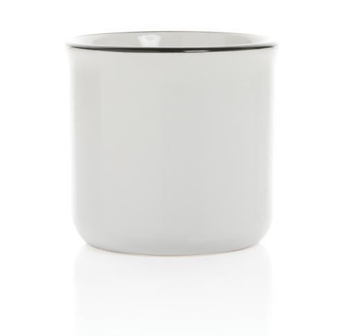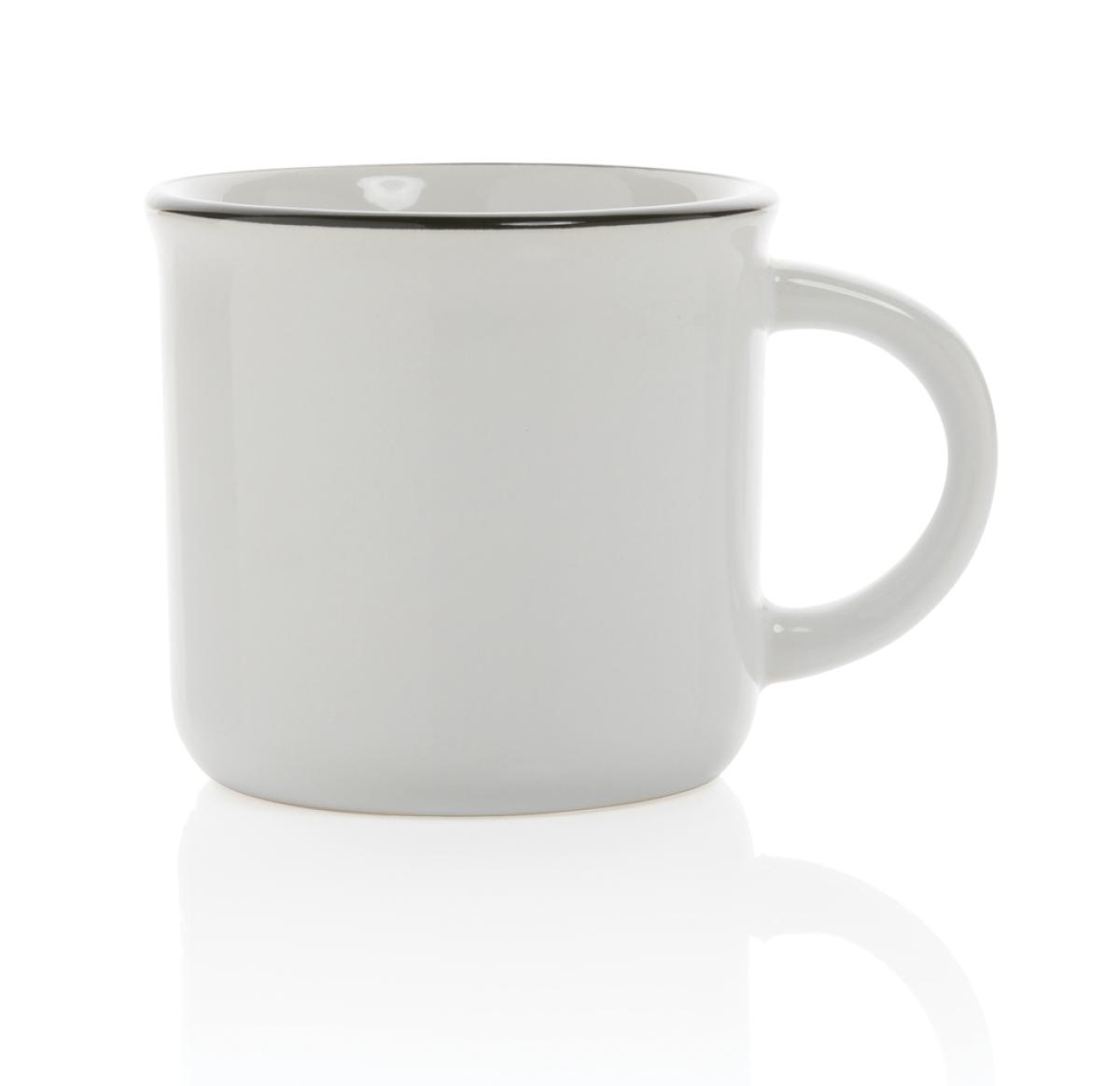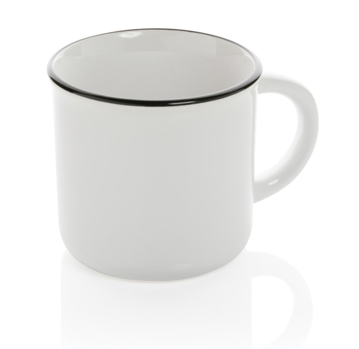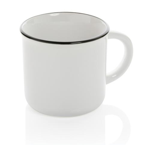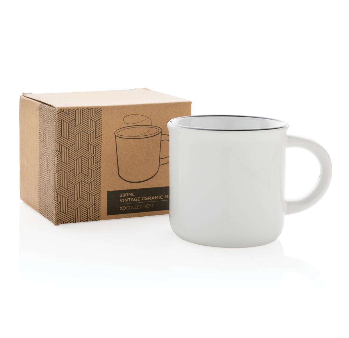 This mug is made from ceramic for durability and lasting use. The mug has a vintage look and features a curved handle for easy grip. Dishwasher safe in accordance with EN12875-1 (at least 125 washing cycles) for all decoration methods. Packed in gift box.