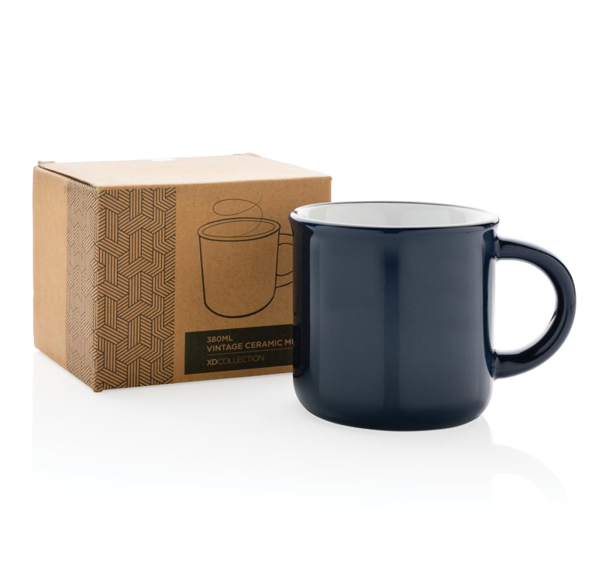 This mug is made from ceramic for durability and lasting use. The mug has a vintage look and features a curved handle for easy grip. Dishwasher safe in accordance with EN12875-1 (at least 125 washing cycles) for all decoration methods. Packed in gift box.
