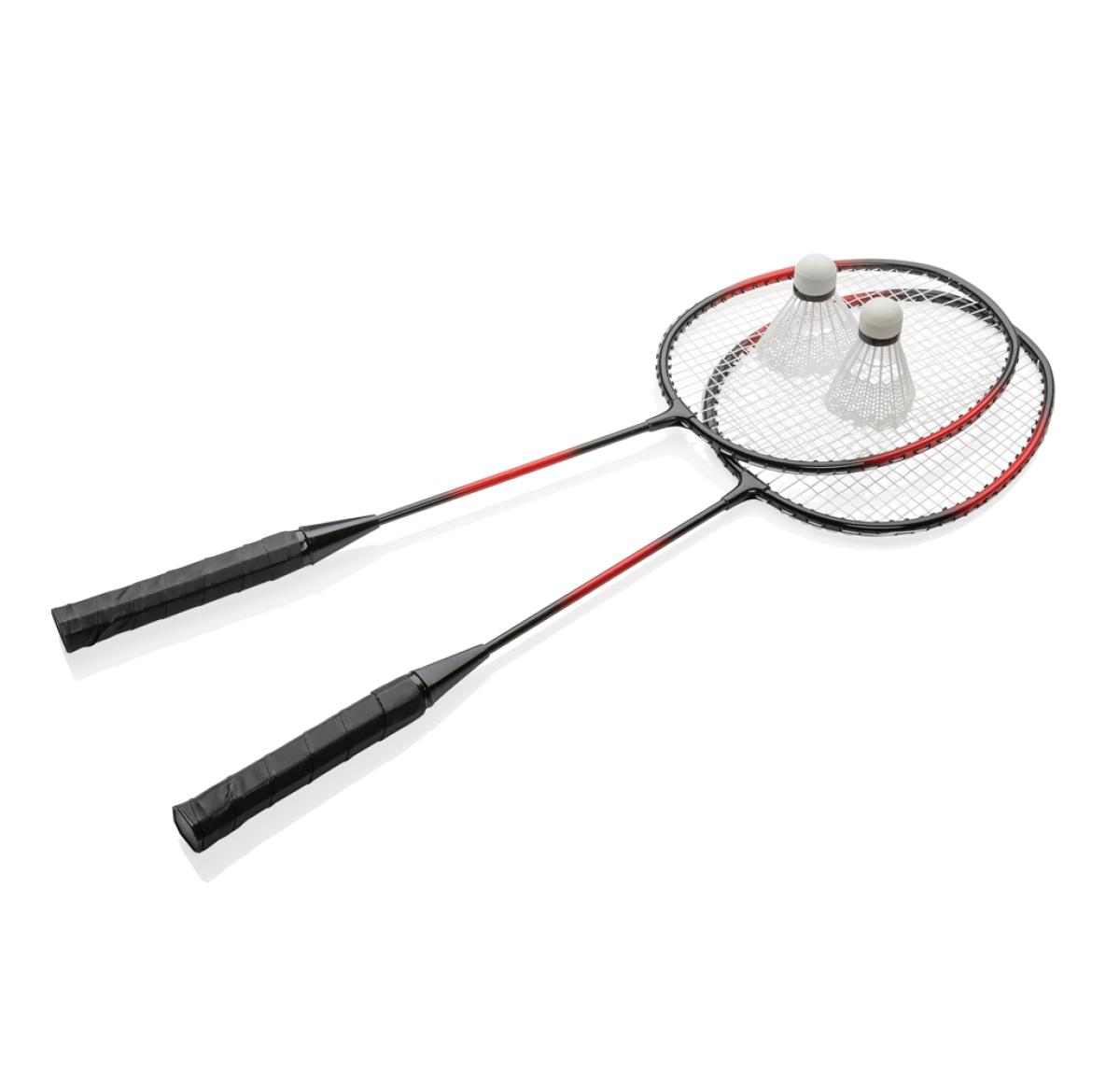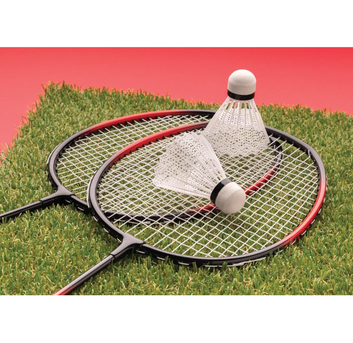 Set of 2 badminton rackets and 2 shuttles packed in a PVC free and non woven pouch to bring the set with you on a day out or on your holiday.