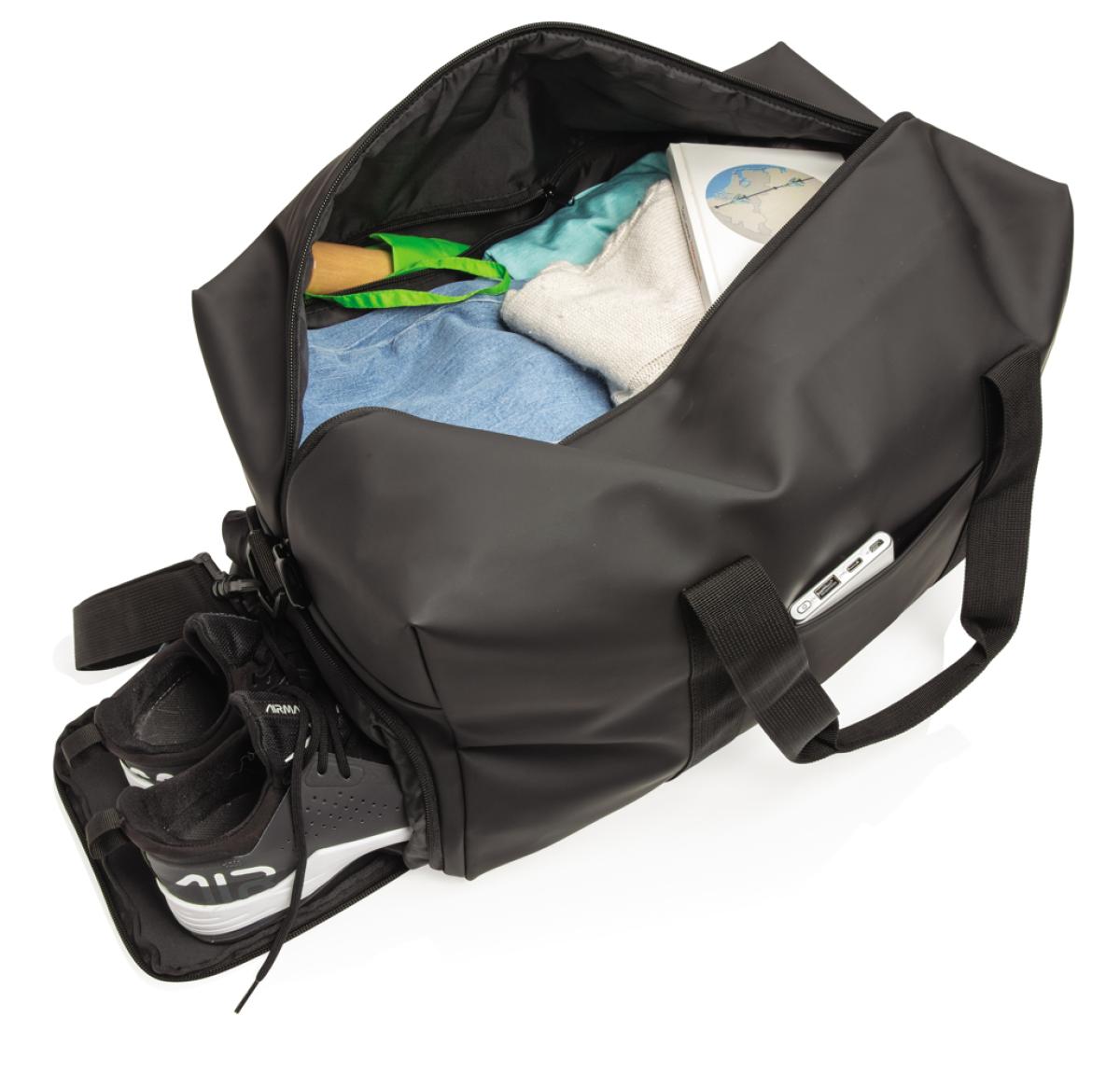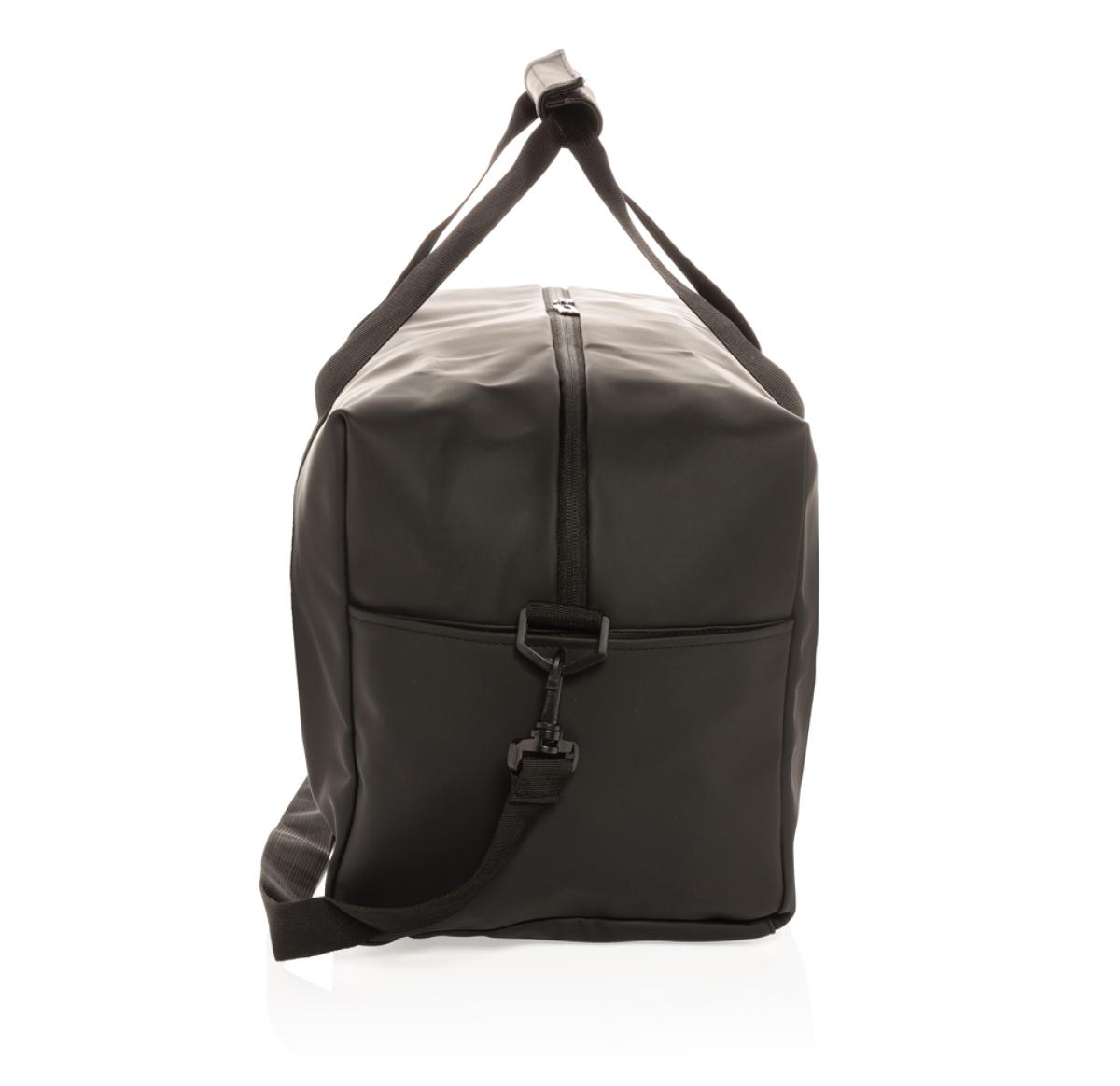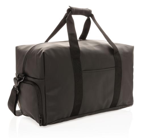 This weekend duffel made of smooth PU is suitable for daily trips to the gym as it is for a weekend getaway. It features a boxy minimalist design and has an external front pocket, inside pocket and a large main compartment. The bag has a convenient shoe c