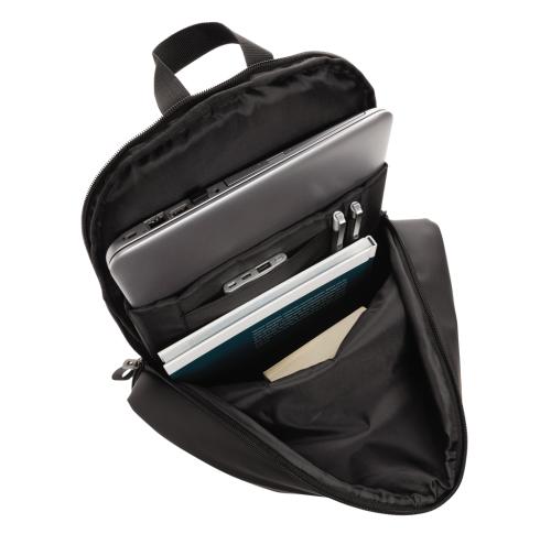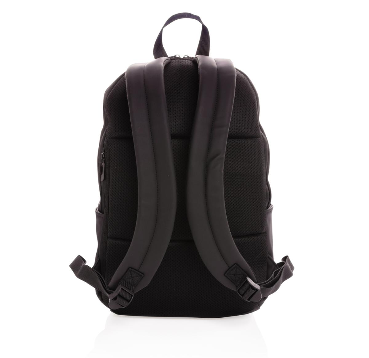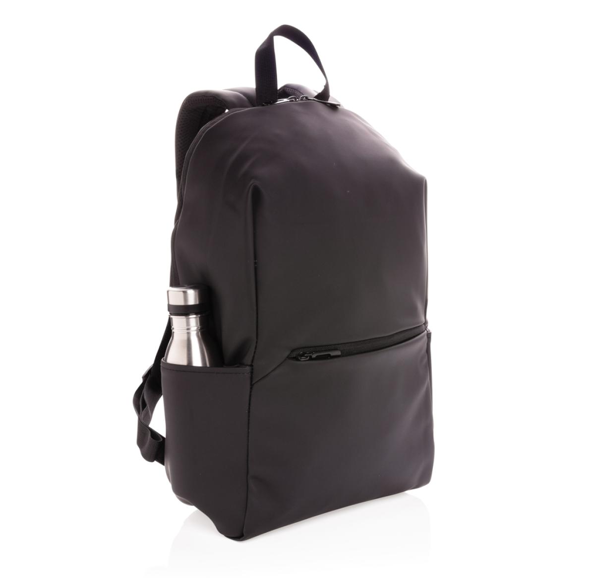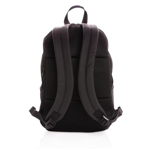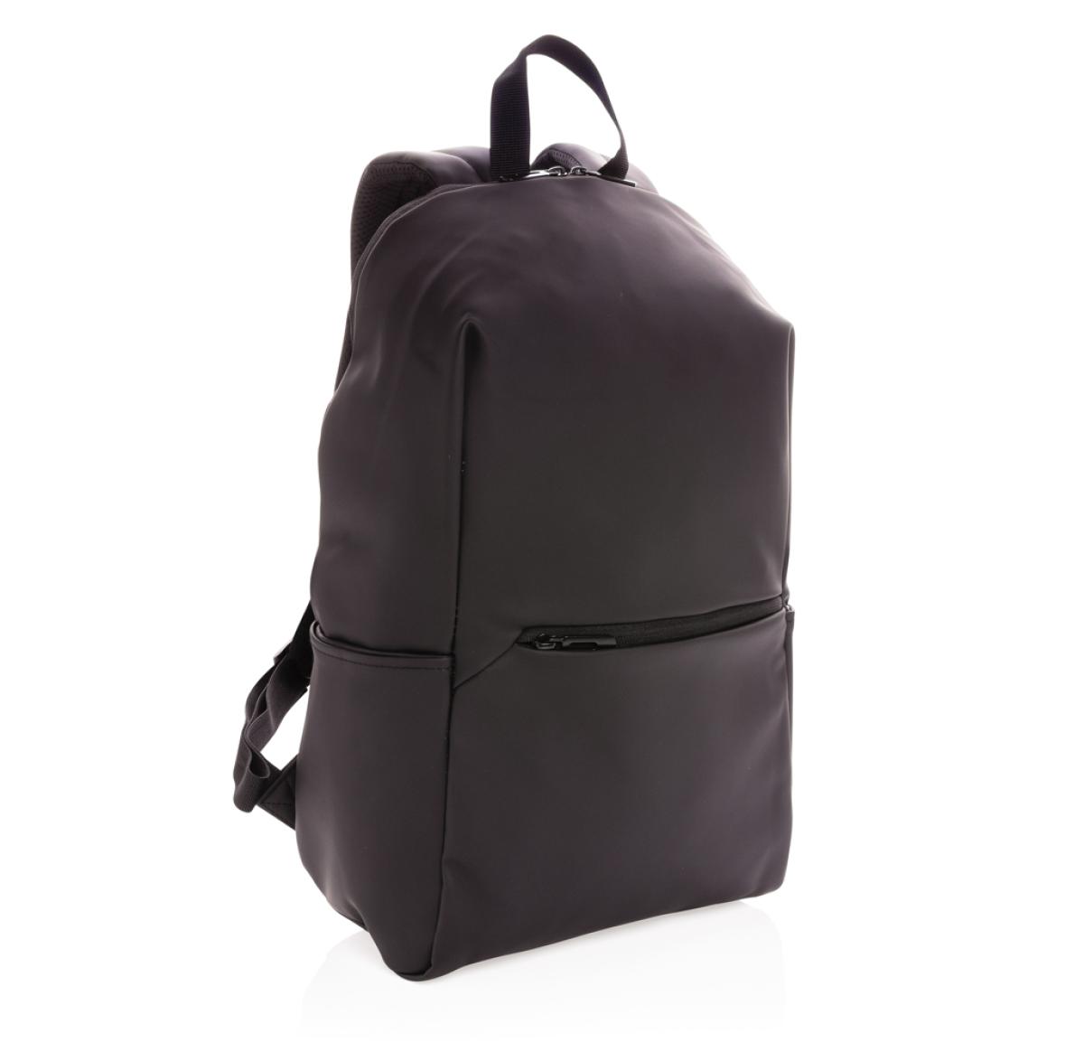 This minimalist, modern backpack made of smooth PU is fully lined and features an inner 15.6 inch laptop compartment, a spacious main compartment and 2 inner pockets and 2 pen loops. Mesh padded back and adjustable straps. Exterior 100% PU. Interior 100%