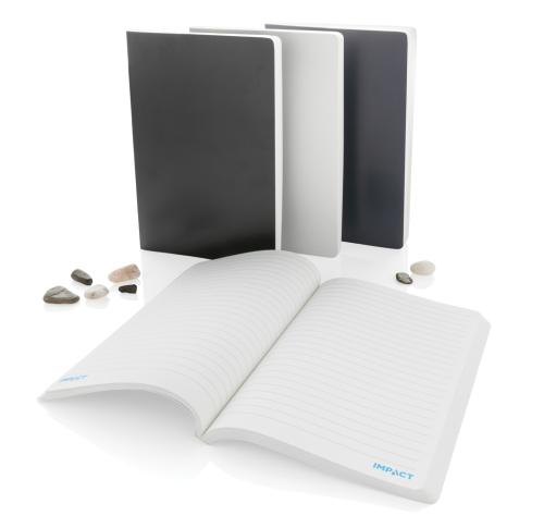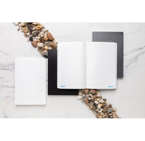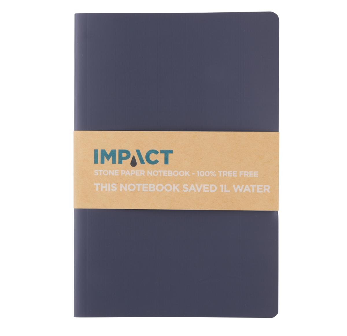 This Impact collection stone paper notebook is made of tree-free paper! Stone paper consists mainly of mineral powder (80%) bound with (20%) of non-toxic HDPE (a clean plastic). Zero water or bleach is used during production, which is the case during the