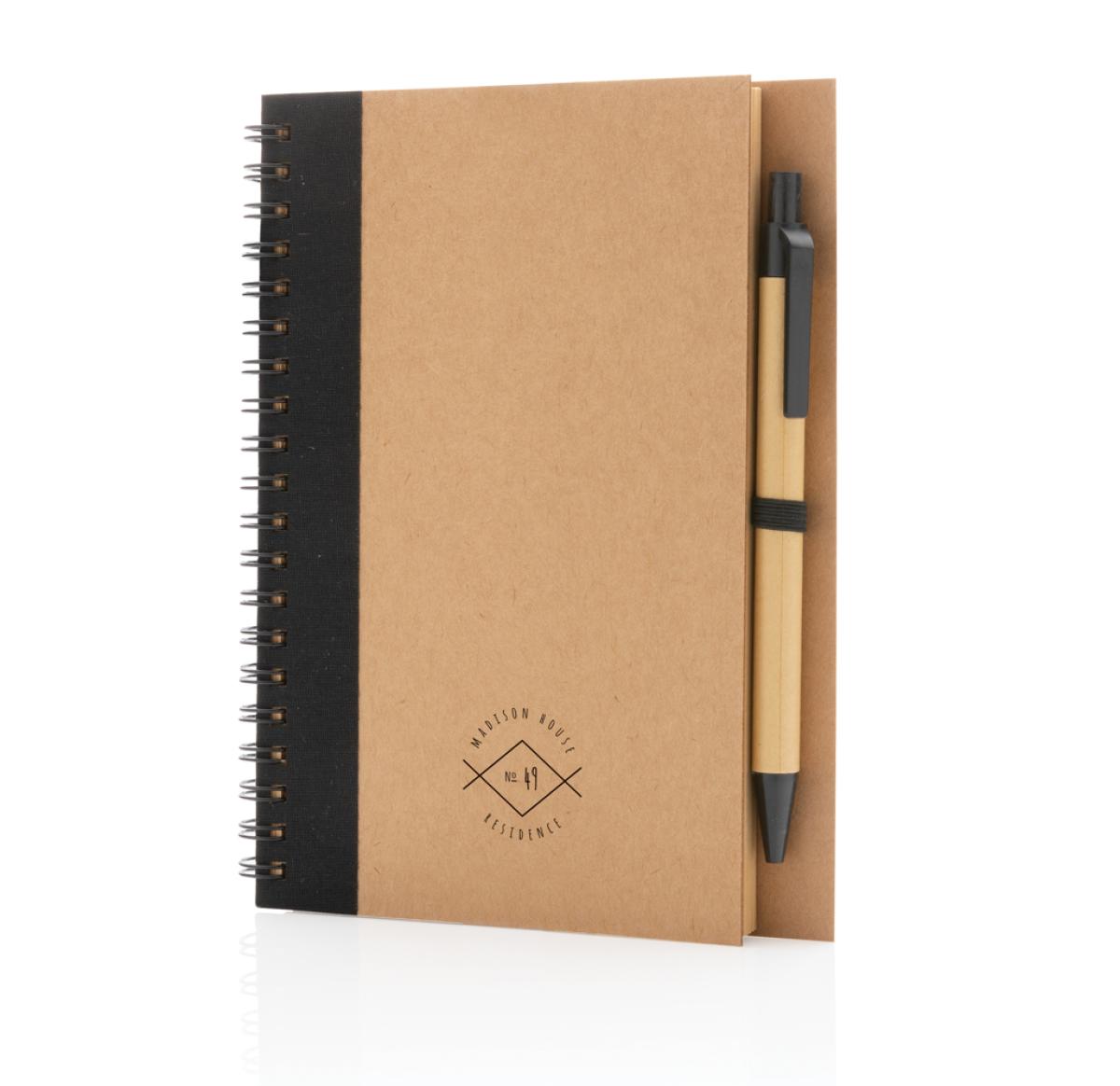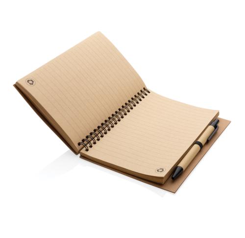 Keep track of your thoughts, notes, plans, to-do's and more with this kraft spiral notebook with pen. The notebook features lined 70 gr cream coloured recycled paper with 70 sheets / 140 pages. The notebook has a colour matching kraft barrel pen. The writ