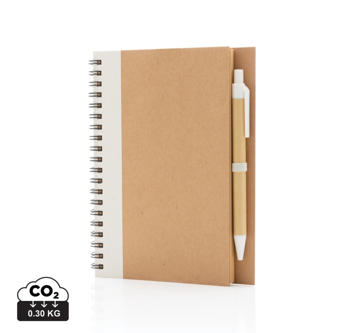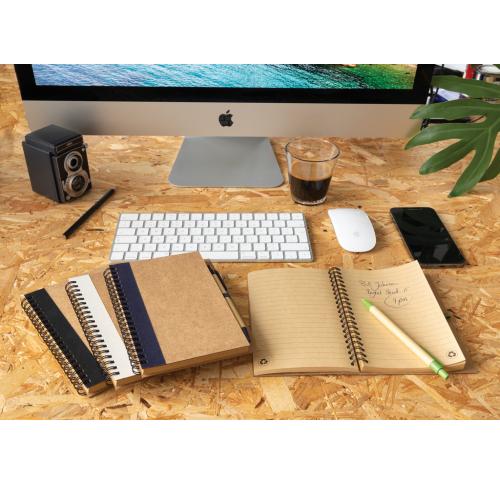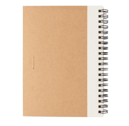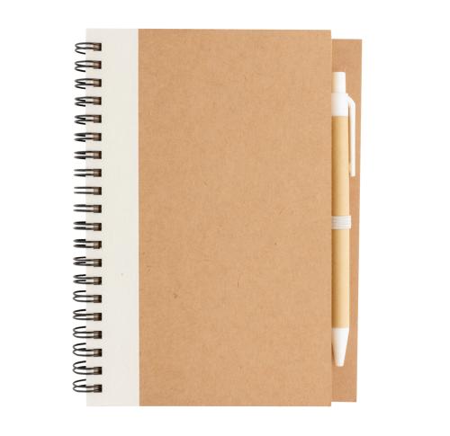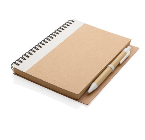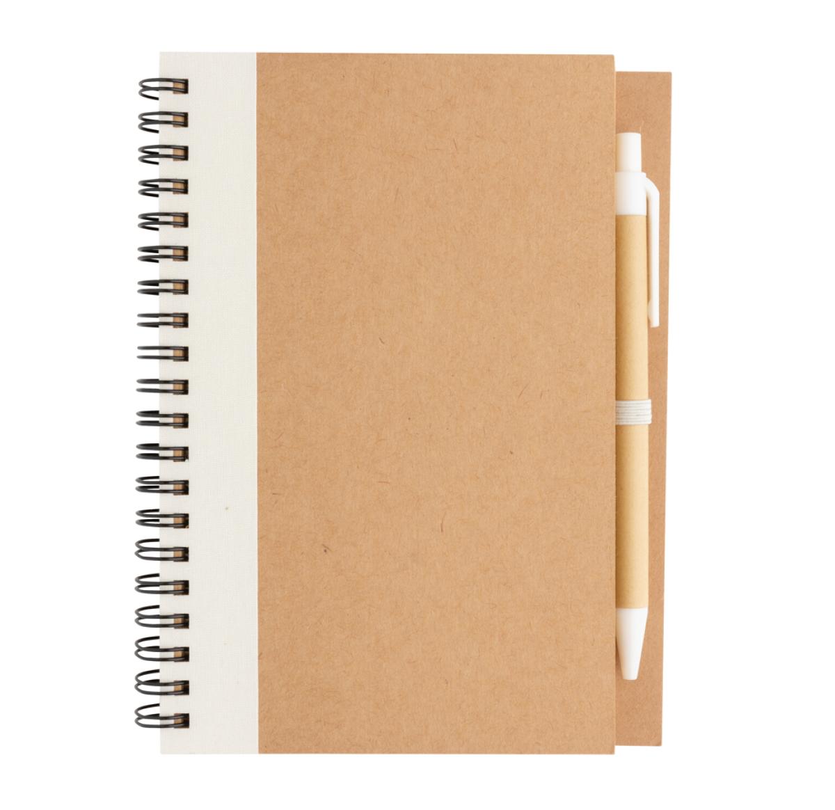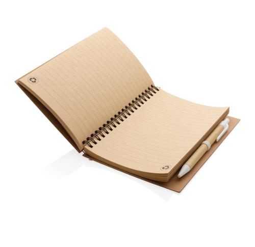 Keep track of your thoughts, notes, plans, to-do's and more with this kraft spiral notebook with pen. The notebook features lined 70 gr cream coloured recycled paper with 70 sheets / 140 pages. The notebook has a colour matching kraft barrel pen. The writ