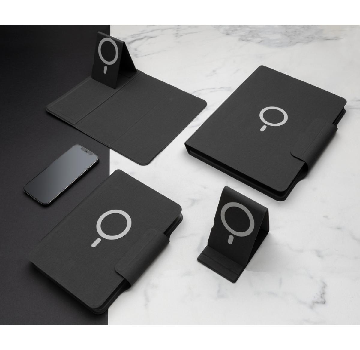 Charge your mobile device wirelessly at full speed with this A5 PU material notebook with integrated magnetic 10W wireless charger and 8000 mah powerbank. Snap your phone (iPhone 12 or higher) to the wireless charger and the phone will align perfectly wit